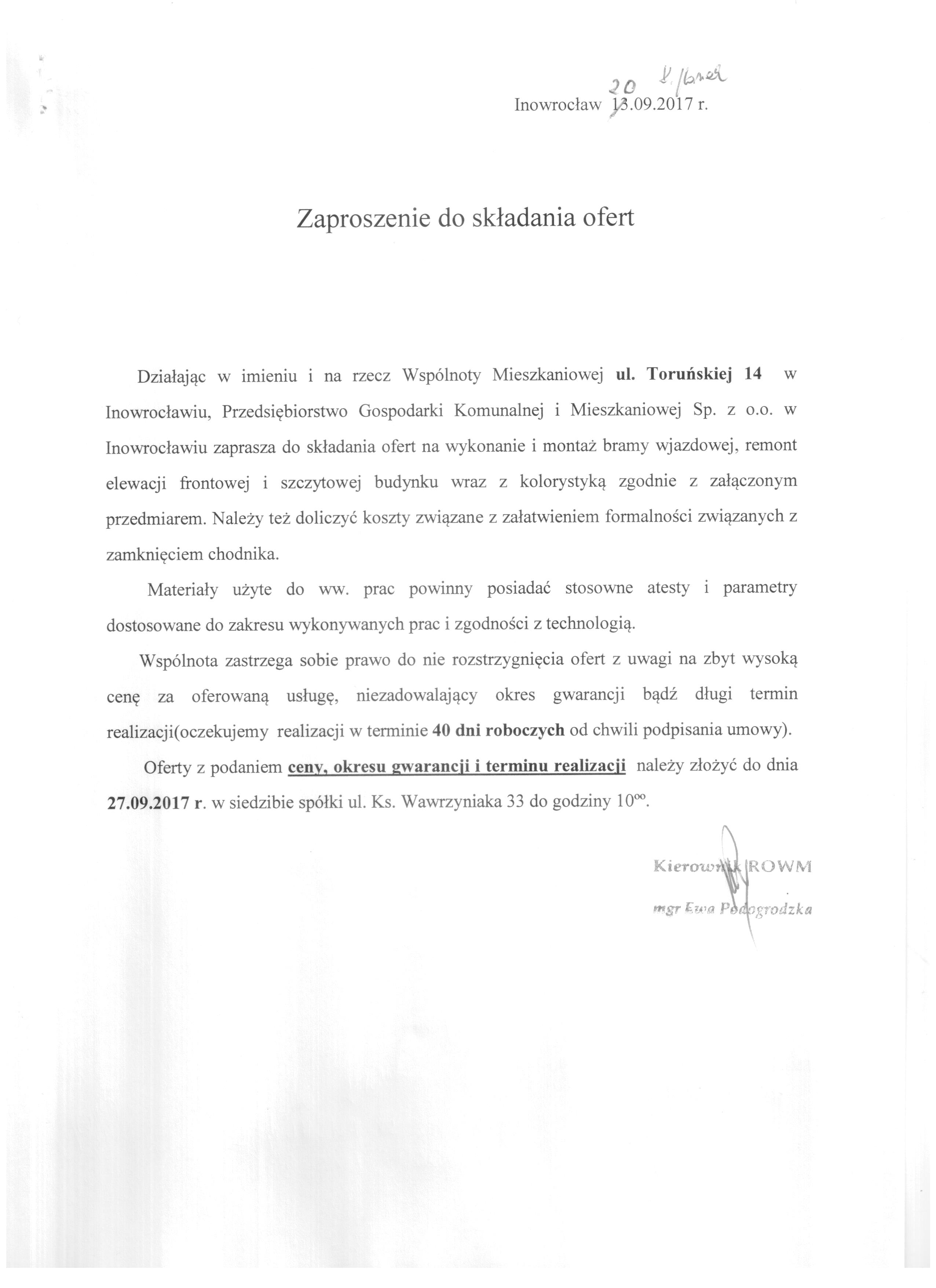 Wykonanie i montaż bramy wjazdowej, remont elewacji frontowej i szczytowej budynku Wspólnoty Mieszkaniowej Toruńska 14 w Inowrocławiu