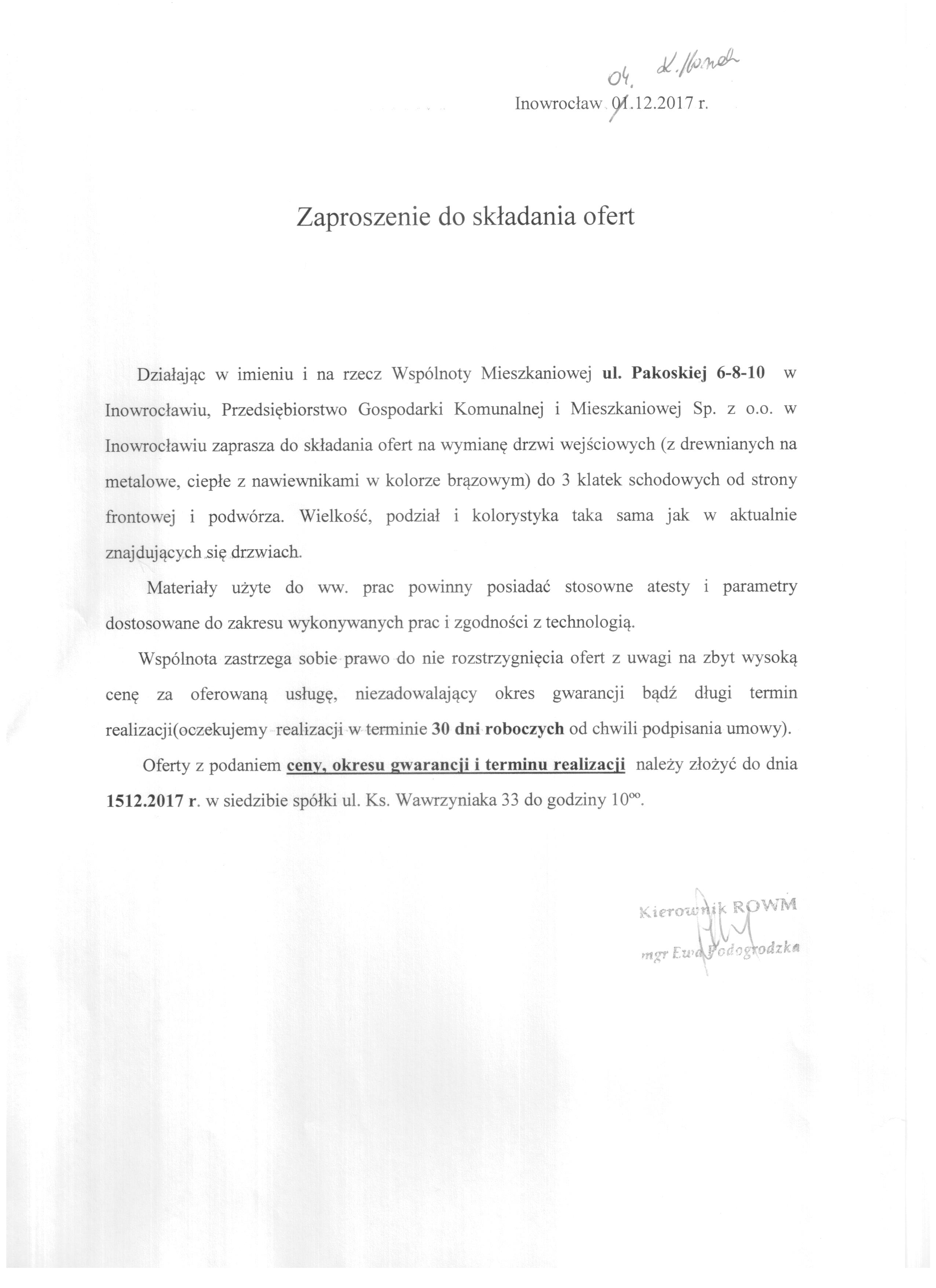Wymiana drzwi wejściowych do 3 klatek schodowych w budynku Wspólnoty Mieszkaniowej Pakoska 6-8-10 w Inowrocławiu