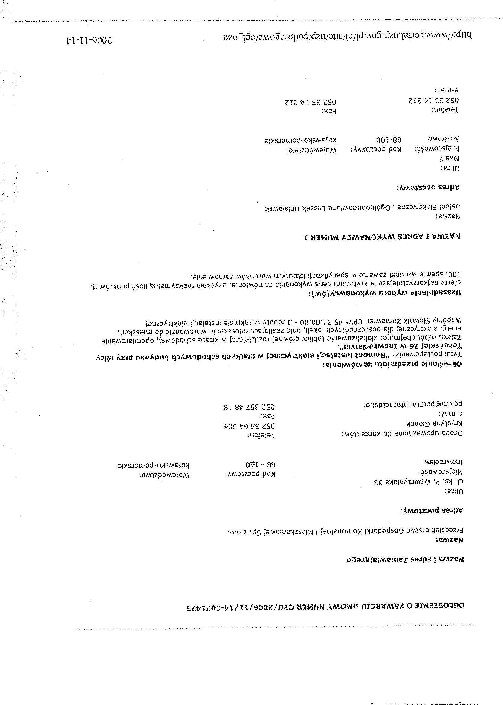 Okre艣lenie przedmiotu zam贸wienia: Tytu艂 post臋powania: „Remont instalacji elektrycznej w klatkach schodowych budynku przy ulicy Toru艅skiej 26 w Inowroc艂awiu”.