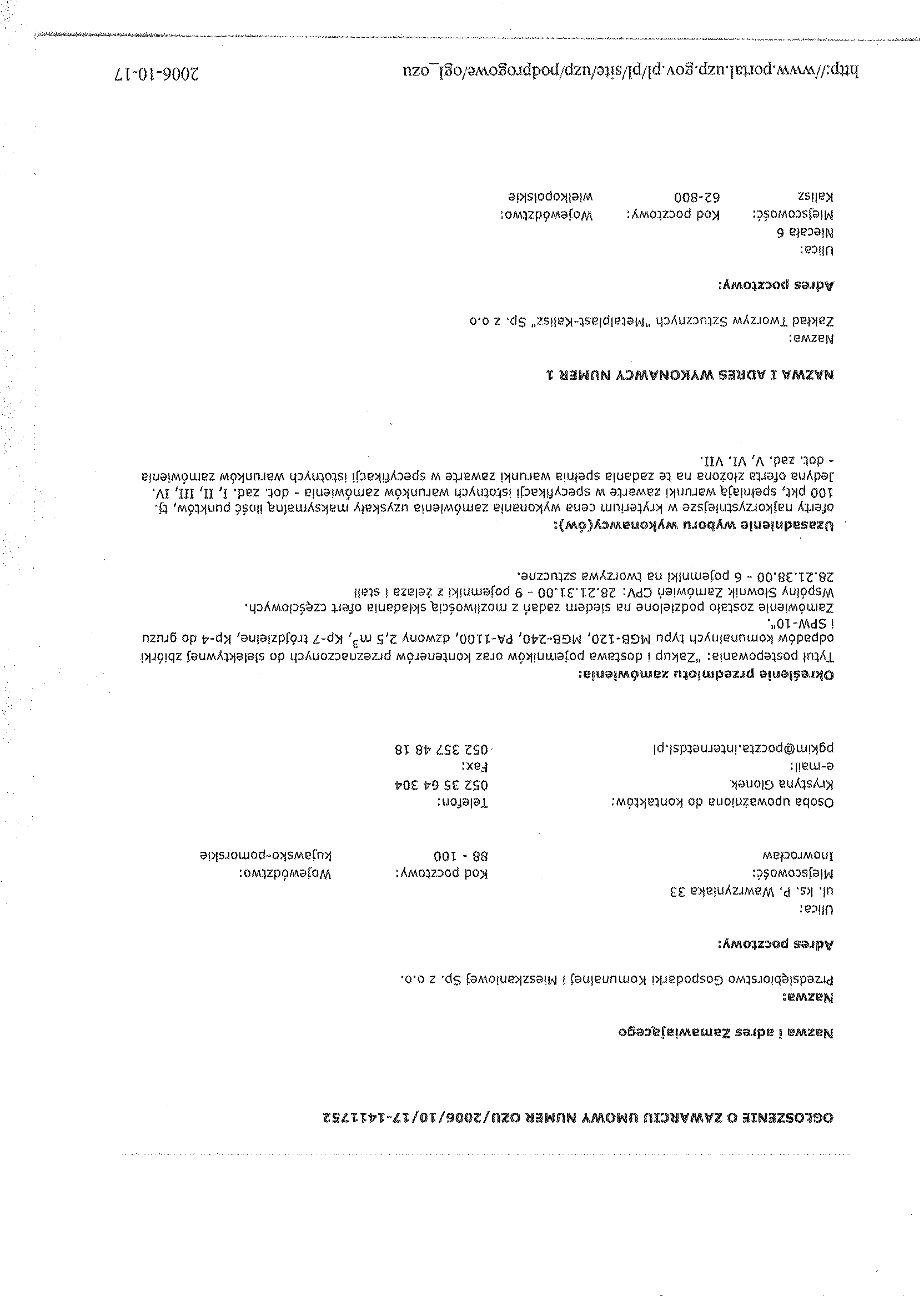 3.2.Wype艂nione nast臋puj膮ce za艂膮czniki: a) o艣wiadczenie w trybie art. 24 ustawy Pzp (za艂. nr 3 do siwz), b) o艣wiadczenie w trybie art.22 ust.1 pkt.1-4聽 ustawy聽 Pzp (za艂. nr 4 do siwz). c) formularz ofertowy wykonawcy (za艂. nr 1 do swiz). 4.Kryteria oceny ofert: a) cena聽聽 - 100 %聽聽聽聽聽聽聽聽聽聽聽聽聽聽聽聽聽 聽聽聽聽聽聽聽聽聽聽聽聽聽聽聽聽聽聽聽聽聽聽聽聽聽聽 5.Termin sk艂adania ofert: Data: 14/09/2006聽 godz. 9.30聽聽 -聽 otwarcie: 14/09/2006, godz. 10.00 6.Miejsce sk艂adania ofert: Siedziba zamawiaj膮cego – Inowroc艂aw, ul. ks. Piotra Wawrzyniaka 33, sekretariat 1 pi臋tro. 聽