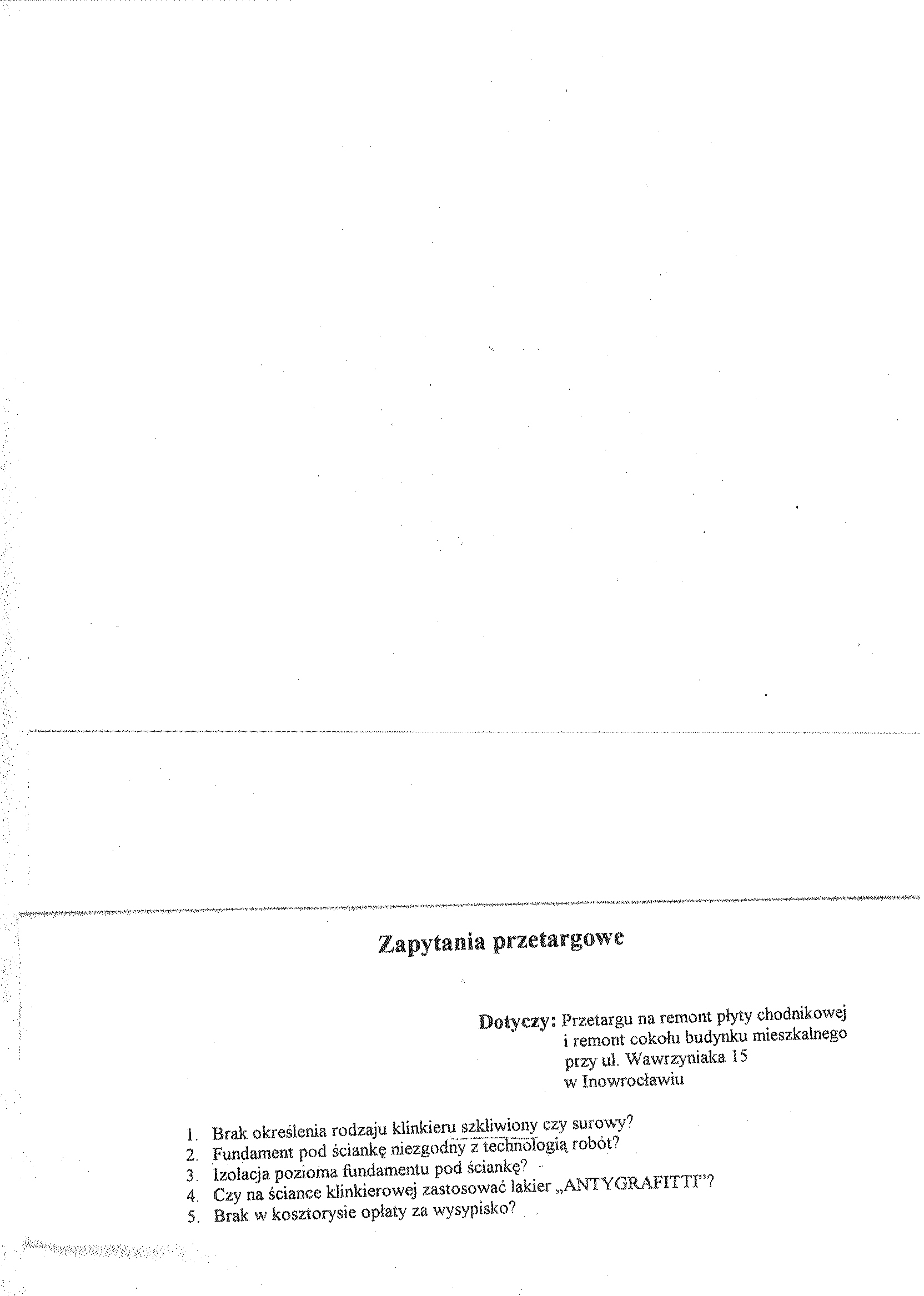 Okre艣lenie przedmiotu zam贸wienia: Tytu艂 postepowania: "Remont chodnika i coko艂u w budynku Wsp贸lnoty Mieszkaniowej przy ulicy Wawrzyniaka 15 w Inowroc艂awiu". Przedmiot zam贸wienia obejmuje prace polegaj膮ce na: rozbi贸rce chodnika, rozbi贸rce obrze偶y betonowych, korytowanie chodnika, wykonanie chodnika z kostki brukowej betonowej, rozebranie coko艂u budynku z ceg艂y, rozebranie izolacji styropianowej oraz wykonanie izolacji coko艂u styropianem. 聽
