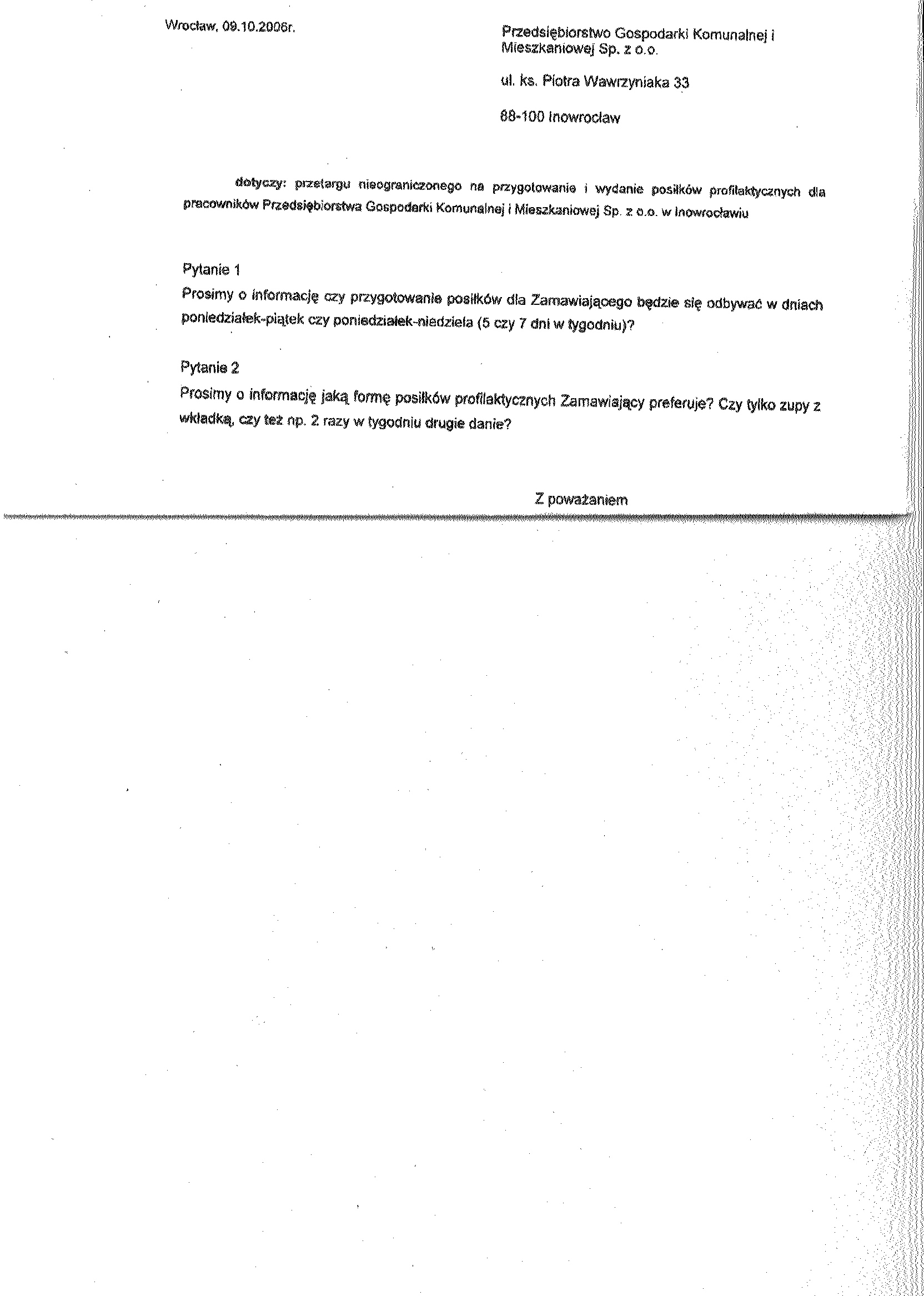 14. Miejsce i termin sk艂adania ofert: Oferty nale偶y z艂o偶y膰 w sekretariacie Przedsi臋biorstwa Gospodarki Komunalnej i Mieszkaniowej Sp. z o.o., ul. ks. Piotra Wawrzyniaka 33, 88-100 Inowroc艂aw,聽 do dnia 16 pa藕dziernika 2006 r. godz. 10.30. 聽
