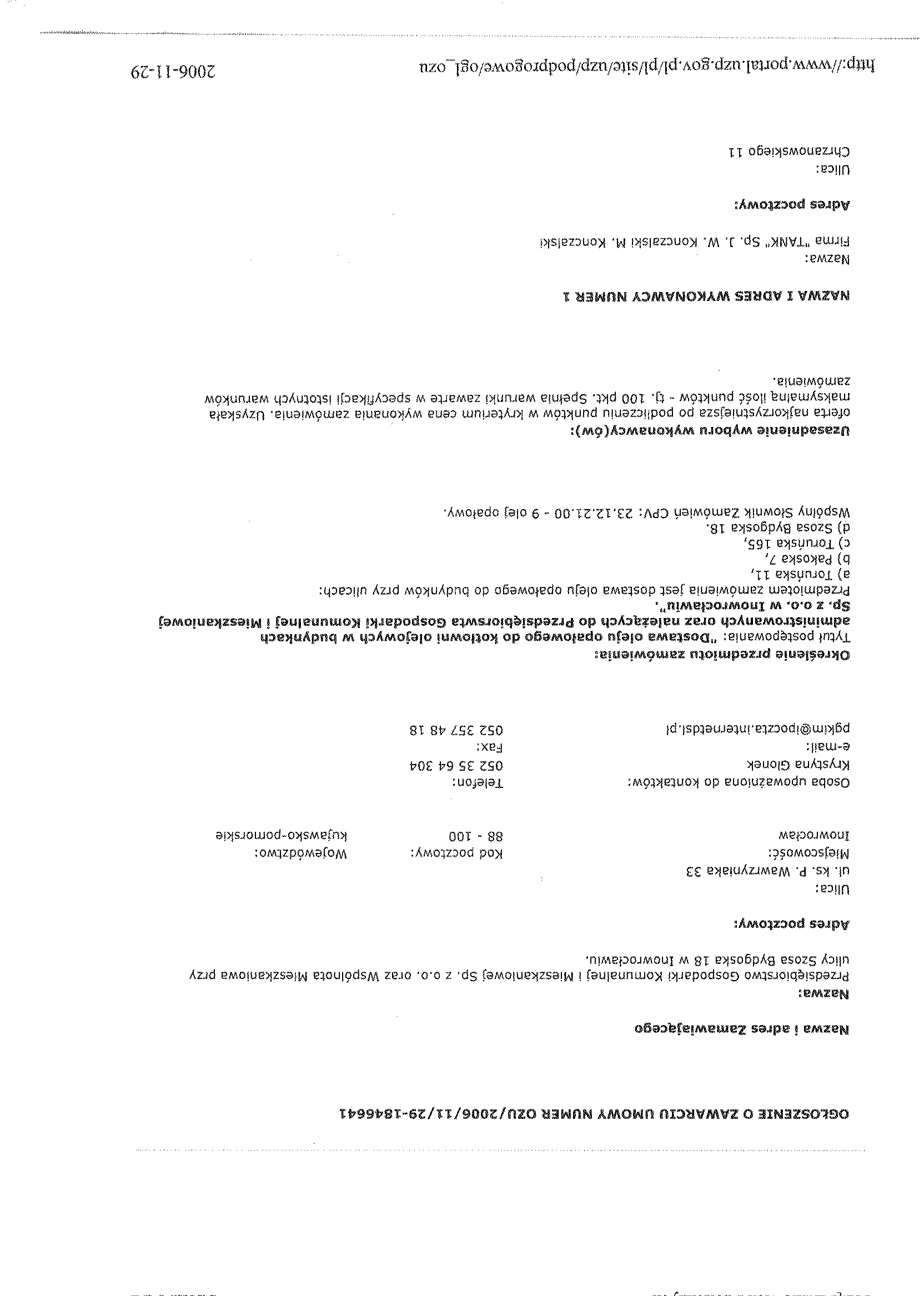 15. Miejsce i termin sk艂adania ofert: sekretariat Przedsi臋biorstwa Gospodarki Komunalnej i Mieszkaniowej Sp. z o.o., ul. ks. Piotra Wawrzyniaka 33, 88-100 Inowroc艂aw, dnia 8 listopada 2006 r. do godz. 9.30.