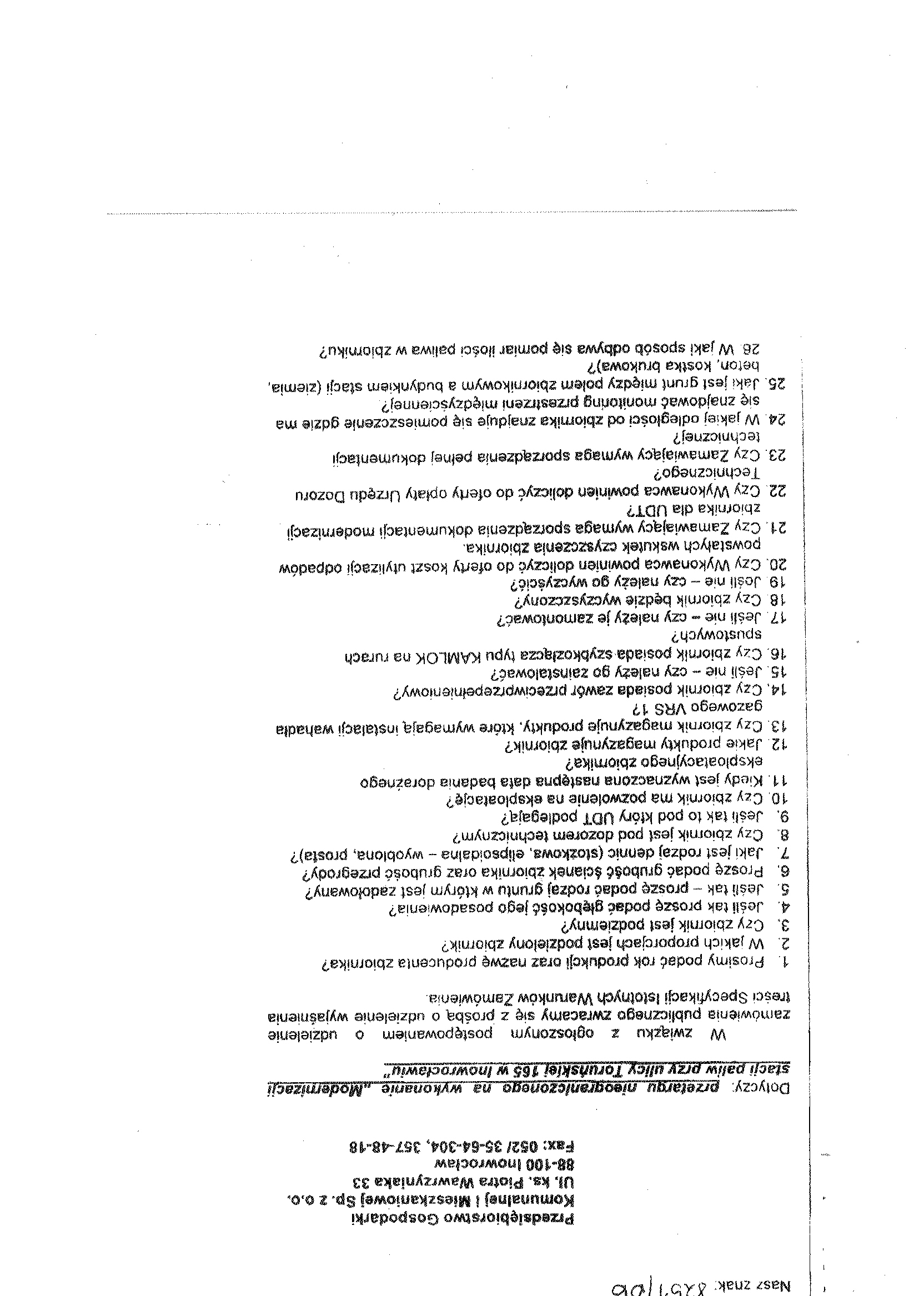1.聽聽聽聽聽 Zamawiaj膮cy: Przedsi臋biorstwo Gospodarki Komunalnej i Mieszkaniowej Sp. z o.o. w Inowroc艂awiu Ulica: ks. Piotra Wawrzyniaka 33 Kod: 88-100, Miejscowo艣膰: Inowroc艂aw Telefon: 052 35 64 304, faks:聽 0-52聽 357聽 48 18 REGON: 091581150 NIP: 556-080-85 e-mail: pgkim@poczta.internetdsl.pl 聽 2.聽聽聽聽聽 Przedmiot zam贸wienia: 聽 聽„Modernizacja stacji paliw przy ulicy Toru艅skiej 165 w Inowroc艂awiu”.