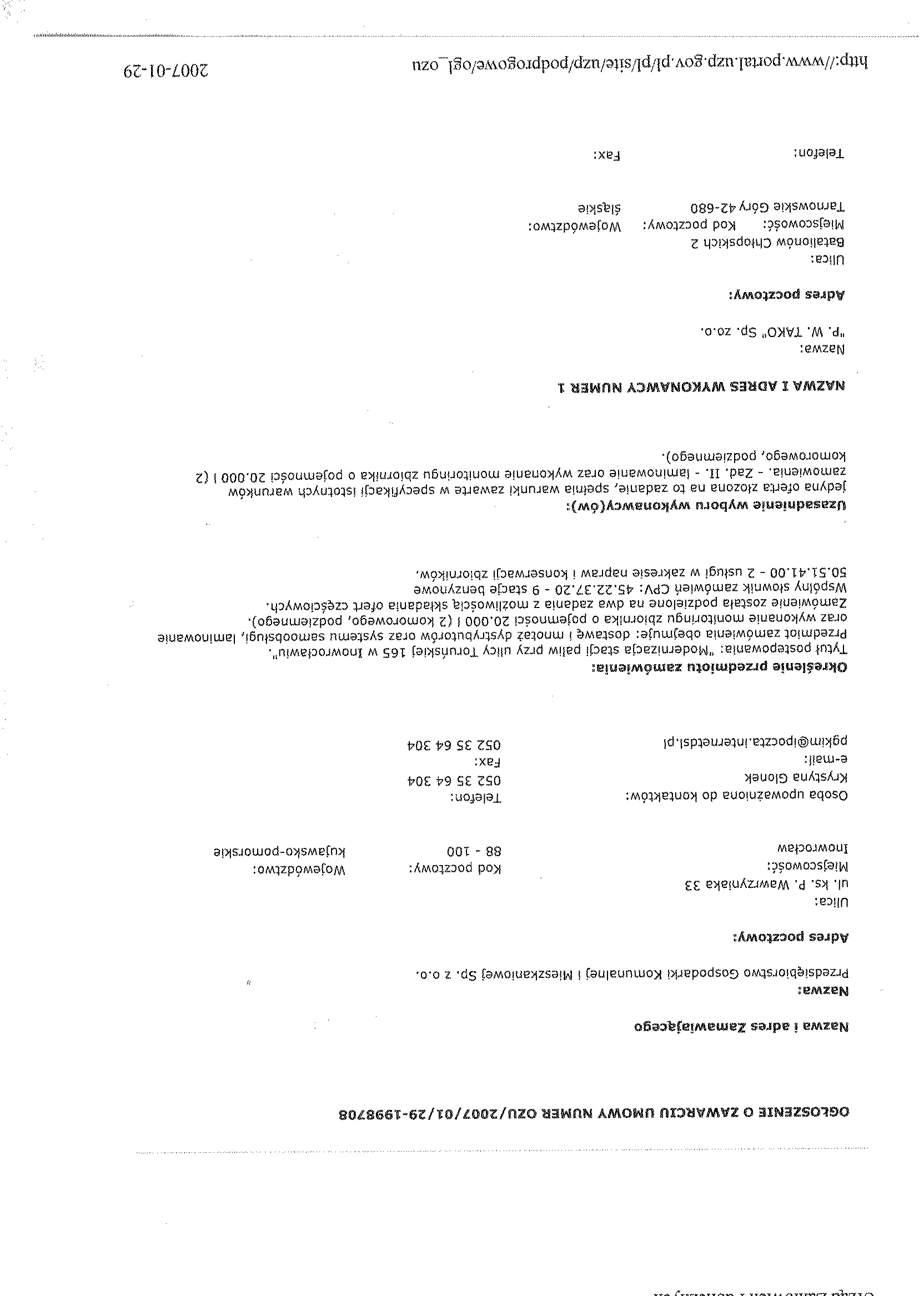 聽 3. 聽Nomenklatura – wg Wsp贸lnego S艂ownika Zam贸wie艅 (CPV): 45.22.37.20 – 9, 50.51.41.00.Tryb post臋powania: przetarg nieograniczony Rodzaj zam贸wienia: dostawa. 4. Stacja paliw usytuowana jest na terenie dzia艂ki numer 18, w jednostce bilansowej oznaczonej symbolem 6 RHS. 5. Przedmiot zam贸wienia zosta艂 podzielony na 2 zadania: Zad. I. – dostawa i monta偶 dystrybutor贸w oraz systemu samoobs艂ugi, Zad. II. – laminowanie oraz wykonanie monitoringu zbiornika o pojemno艣ci 20.000 litr贸w (2 komorowego, podziemnego). 6. Termin wykonania: Zad. I.聽 – 聽do ko艅ca 1 kwarta艂u 2007 r. Zad. II. - do ko艅ca 2 kwarta艂u 2007 r. 聽 7. Dopuszcza si臋 sk艂adanie ofert cz臋艣ciowych. 8. Nie dopuszcza si臋 sk艂adania ofert wariantowych. 聽 9. Osobami uprawnionymi do kontakt贸w z dostawcami/wykonawcami s膮: 聽聽聽聽 a) K. Glonek, tel./faks聽 052 35 64聽304/357-48-18, 聽聽聽聽 b)W. Miko艂ajczak, tel. 052聽 357-56-62. 10. Adres strony internetowej, na kt贸rej dost臋pna jest specyfikacja istotnych warunk贸w zam贸wienia: http://pgkim-inowroclaw.samorzady.pl 11. Op艂ata za otrzymanie specyfikacji istotnych warunk贸w zam贸wienia b臋dzie pokrywa膰 jedynie koszty jej druku oraz聽 przekazania. 12. Dostawca/Wykonawca zainteresowany post臋powaniem powinien z艂o偶y膰 wniosek u zamawiaj膮cego z podaniem wszystkich danych firmy -聽 niezb臋dnych do przekazywania zmian i zapyta艅 dotycz膮cych powy偶szego post臋powania. 聽 13. O udzielenie zam贸wienia mog膮 ubiega膰 si臋 wy艂膮cznie Dostawcy/ Wykonawcy, kt贸rzy: a) posiadaj膮 uprawnienia do wykonywania okre艣lonej dzia艂alno艣ci lub czynno艣ci, je偶eli ustawy nak艂adaj膮 obowi膮zek posiadania takich uprawnie艅, b) posiadaj膮 niezb臋dn膮 wiedz臋 i do艣wiadczenie oraz potencja艂 techniczny, a tak偶e dysponuj膮 osobami zdolnymi do wykonania zam贸wienia, c) nie podlegaj膮 wykluczeniu z post臋powania o udzielenie zam贸wienia. 聽 Zamawiaj膮cy oceni spe艂nienie warunk贸w wymienionych w niniejszym rozdziale na podstawie z艂o偶onych przez Dostawc臋/ Wykonawc臋, do oferty, o艣wiadcze艅 i dokument贸w. 聽