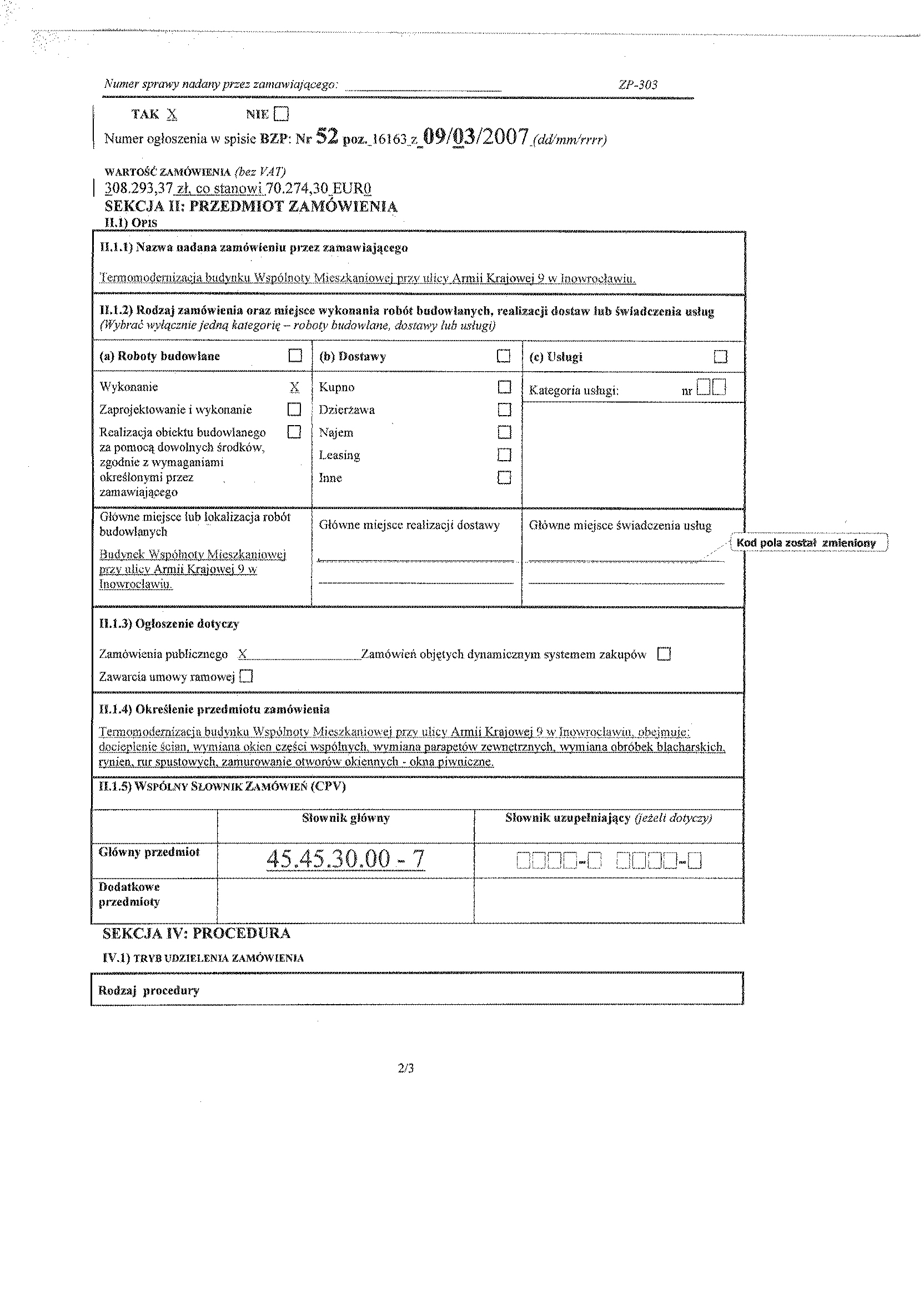 SEKCJA II: PRZEDMIOT ZAM脫WIENIA II.1) Opis II.1.1) Nazwa nadana zam贸wieniu przez zamawiaj膮cego „Termomodernizacja budynku Wsp贸lnoty Mieszkaniowej przy ulicy聽 Armii Krajowej 9 w Inowroc艂awiu”. | II.1.2) Rodzaj zam贸wienia oraz miejsce wykonania rob贸t budowlanych, realizacji dostaw lub 艣wiadczenia us艂ug (Wybra膰 wy艂膮cznie jedn膮 kategori臋 – roboty budowlane, dostawy lub us艂ugi) | (a) Roboty budowlane 聽聽聽聽聽聽聽聽聽聽聽聽聽聽聽聽聽聽聽聽X | (b Dostawy聽聽聽聽聽聽聽聽聽聽聽聽聽聽聽聽聽聽聽聽聽聽聽聽聽聽聽聽聽聽聽聽聽 | (c) Us艂ugi聽聽聽聽聽聽聽聽聽聽聽聽聽聽聽聽聽聽聽聽聽聽聽聽聽聽聽聽聽聽聽聽聽聽聽聽聽 | Wykonanie Zaprojektowanie i wykonanie Realizacja obiektu budowlanego za pomoc膮 dowolnych 艣rodk贸w, zgodnie z wymaganiami okre艣lonymi przez zamawiaj膮cego | X