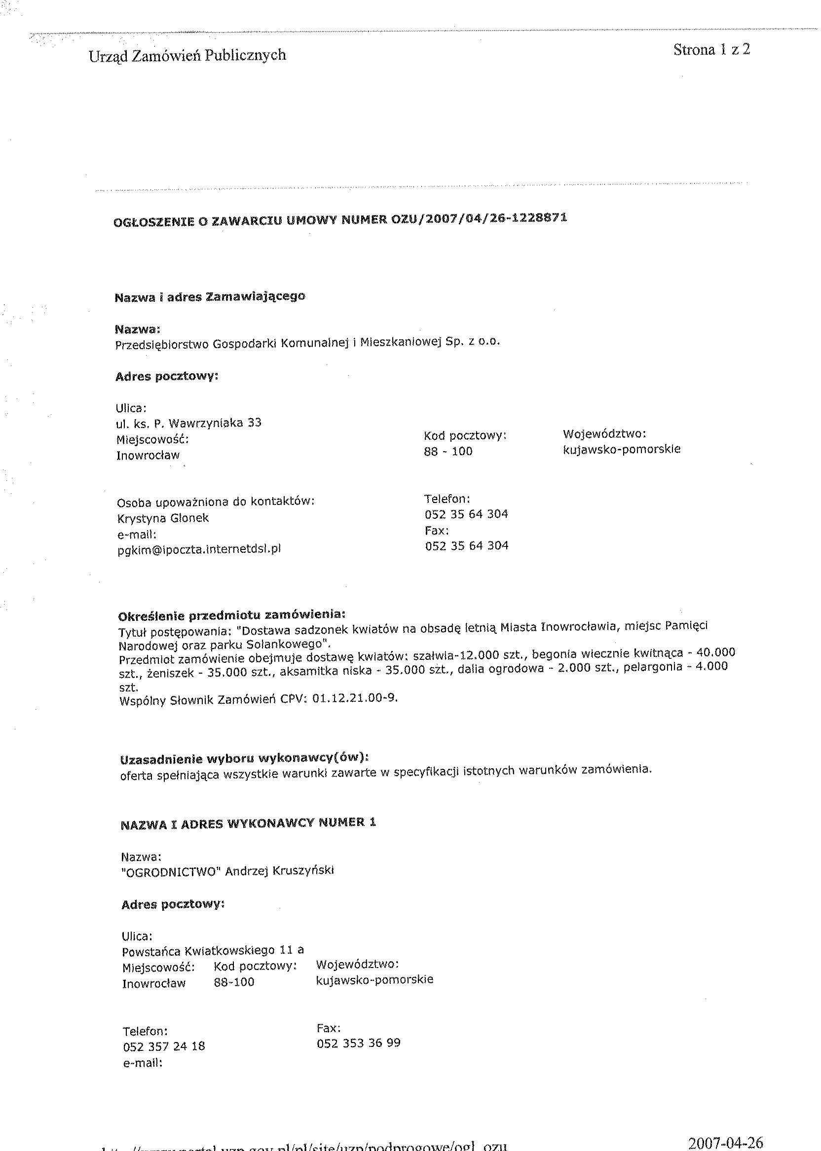 聽„Dostawa sadzonek kwiat贸w na obsad臋 letni膮 Miasta Inowroc艂awia, miejsc Pami臋ci Narodowej oraz Parku Solankowego. 聽 3. 聽Nomenklatura – wg Wsp贸lnego S艂ownika Zam贸wie艅 (CPV): 01122100 - 94. Przedmiot zam贸wienia obejmuje obsad臋 letni膮- wymagane kwiaty to: 聽聽 a) sza艂wia – 12.000 szt. 聽聽 b) begonia wiecznie kwitn膮ca聽 - 40.000 szt. 聽聽 c) 偶eniszek – 35.000 szt. 聽聽 d) aksamitka niska – 35.000 szt. 聽聽 e) starzec – 35.000 szt. 聽聽 f) pelargonia – 4.000 szt. 聽聽 g) dalia ogrodowa – 2.000 szt. 聽聽聽 4.1. Dostawy odbywa膰 si臋 b臋d膮 sukcesywnie w przewidywanym terminie od 15.05.2007 r., w uzgodnieniu telefonicznym z Zak艂adem Zieleni PGKiM Sp. z o.o. w Inowroc艂awiu. 5. Opis warunk贸w wymaganych od dostawc贸w: 聽聽聽聽 a) wykonawca dostarczy kwiaty, w艂asnym transportem,聽 na w艂asne ryzyko 聽聽聽聽聽聽聽聽 oraz na w艂asny聽koszt, we wskazane miejsce miasta Inowroc艂awia, 聽聽聽聽 b) wyst臋puj膮 na rynku handlu co najmniej 3 lata, 聽聽聽聽 c) dostarcz膮 kwiaty zgodne z wymaganiami zamawiaj膮cego, 聽聽聽聽 d) terminy dostawy b臋d膮 uzgadniane telefonicznie. 6. Nie dopuszcza si臋 sk艂adania ofert cz臋艣ciowych. 7. Nie dopuszcza si臋 sk艂adania ofert wariantowych. 8. Osobami uprawnionymi do kontakt贸w z dostawcami s膮: 聽聽聽聽聽 a) K. Glonek, tel. (052) 357-48-18, 聽聽聽聽聽 b) G. Kruk, tel. (052) 357- 58-87, 聽聽聽聽聽 c) M. Kwiecie艅, tel. (052) 357-58-87. 9. Przewidywany termin realizacji zam贸wienia: sukcesywnie od podpisania umowy do ko艅ca wrze艣nia 2007 r. 10. Adres strony internetowej, na kt贸rej dost臋pna jest specyfikacja istotnych warunk贸w zam贸wienia: http://pgkim-inowroclaw.samorzady.pl 11. Op艂ata za otrzymanie specyfikacji istotnych warunk贸w zam贸wienia b臋dzie pokrywa膰 jedynie koszty jej druku oraz聽 przekazania. 12.Wykonawca zainteresowany post臋powaniem powinien z艂o偶y膰 wniosek u zamawiaj膮cego z podaniem wszystkich danych firmy -聽 niezb臋dnych do przekazywania zmian i zapyta艅 dotycz膮cych powy偶szego post臋powania. 13. O udzielenie zam贸wienia mog膮 ubiega膰 si臋 Dostawcy, kt贸rzy: 1) posiadaj膮 uprawnienia do wykonywania okre艣lonej dzia艂alno艣ci lub czynno艣ci, je偶eli ustawy nak艂adaj膮 obowi膮zek posiadania takich uprawnie艅, 2) posiadaj膮 niezb臋dn膮 wiedz臋 i do艣wiadczenie oraz potencja艂 techniczny, a tak偶e dysponuj膮 osobami zdolnymi do wykonania zam贸wienia, 3) nie podlegaj膮 wykluczeniu z post臋powania o udzielenie zam贸wienia. 聽