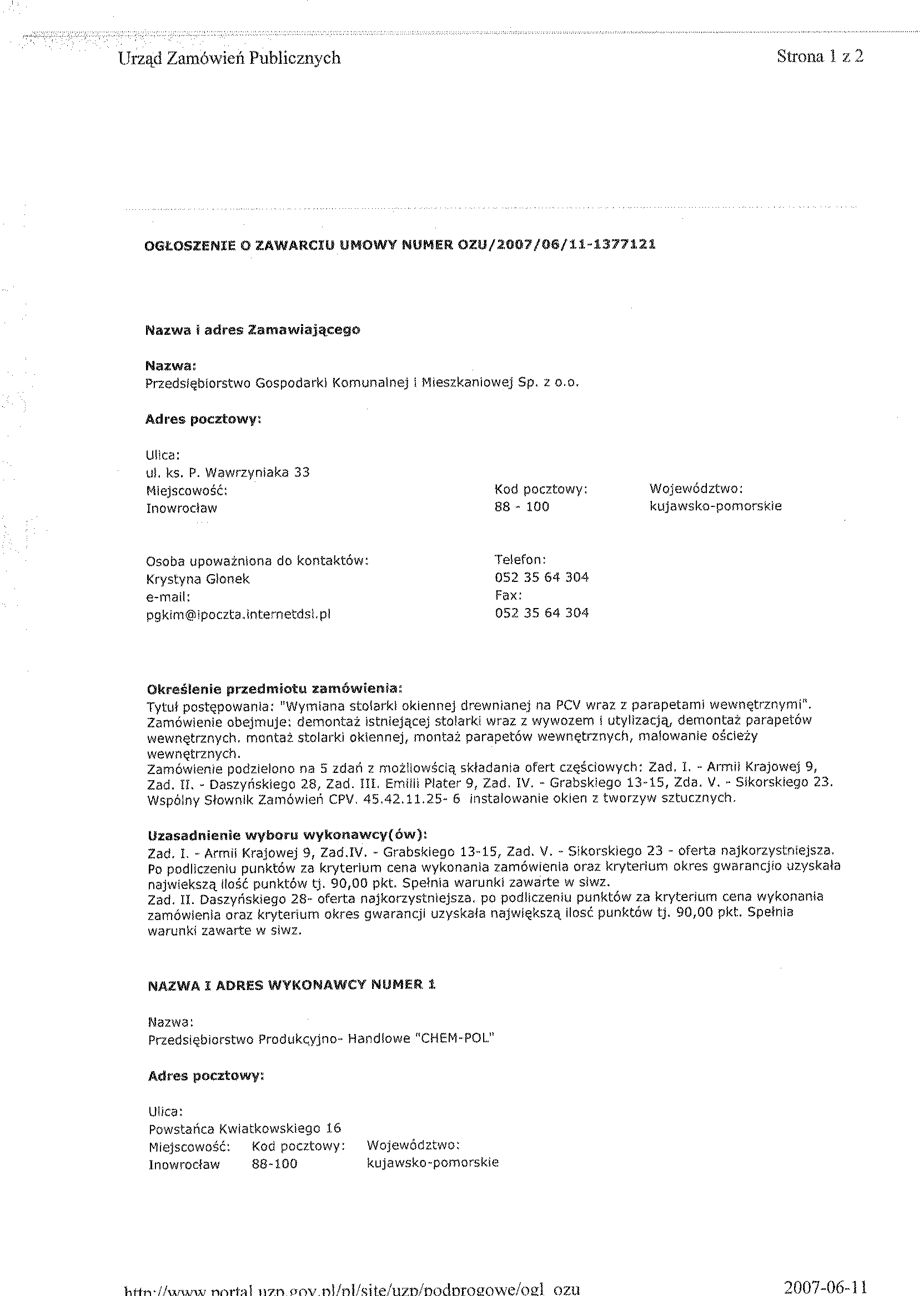 14. W celu potwierdzenia, 偶e Wykonawca posiada uprawnienie do wykonywania okre艣lonej dzia艂alno艣ci lub czynno艣ci oraz nie podlega wykluczeniu na podstawie art. 24 ustawy z dnia 29 stycznia 2004 r. - Prawo zam贸wie艅 publicznych, zamawiaj膮cy 偶膮da, nast臋puj膮cych dokument贸w: a) aktualnego odpisu z w艂a艣ciwego rejestru albo aktualnego za艣wiadczenia o wpisie do ewidencji聽聽dzia艂alno艣ci gospodarczej, je偶eli odr臋bne przepisy wymagaj膮 wpisu do rejestru lub zg艂oszenia do ewidencji dzia艂alno艣ci gospodarczej, wystawionego nie wcze艣niej ni偶 6 miesi臋cy przed up艂ywem聽聽聽terminu sk艂adania ofert; b) o艣wiadczenie wykonawcy, 偶e nie posiada zaleg艂o艣ci podatkowej wobec Naczelnika Urz臋du Skarbowego, c) o艣wiadczenie wykonawcy, 偶e nie posiada zaleg艂o艣ci wobec Zak艂adu Ubezpiecze艅 Spo艂ecznych w op艂acaniu sk艂adek na ubezpieczenie spo艂eczne, zdrowotne oraz Fundusz Pracy. 14.1.W celu potwierdzenia posiadania przez wykonawc臋 niezb臋dnej wiedzy i do艣wiadczenia oraz os贸b zdolnych do wykonania zam贸wienia, zamawiaj膮cy 偶膮da nast臋puj膮cych dokument贸w: a) wykazu wykonanych rob贸t budowlanych w okresie ostatniego 1 roku, przed dniem wszcz臋cia post臋powania o udzielenie zam贸wienia, z podaniem ich warto艣ci oraz daty i miejsca wykonania oraz za艂膮czeniem dokument贸w potwierdzaj膮cych, 偶e roboty te zosta艂y wykonane nale偶ycie, z艂. nr 2 do siwz (minimum 1 referencja), 14.2. W celu potwierdzenia, 偶e wykonawca znajduje si臋 w sytuacji ekonomicznej i finansowej zapewniaj膮cej wykonanie zam贸wienia zamawiaj膮cy 偶膮da nast臋puj膮cych dokument贸w: a) polisy, a w przypadku jej braku innego dokumentu potwierdzaj膮cego, 偶e wykonawca jest聽聽聽聽ubezpieczony od odpowiedzialno艣ci cywilnej w zakresie prowadzonej dzia艂alno艣ci. 14.3.Kosztorys ofertowy, kt贸ry musi by膰 integraln膮 cz臋艣ci膮 z艂o偶onej oferty. Wykonawca mo偶e przyj膮膰 dowoln膮 form臋 i聽 podstaw臋 wyceny rob贸t. 5. Kserokopi臋 atestu na okna, certyfikat (je艣li posiada) oraz atest na profile okienne. 14.4.Wype艂nione nast臋puj膮ce za艂膮czniki: a) o艣wiadczenie w trybie art. 24 ustawy Pzp (za艂. nr 3 do siwz), b) o艣wiadczenie w trybie art.22 ust.1 pkt.1-4聽 ustawy聽 Pzp (za艂. nr 4 do siwz). c) formularz ofertowy wykonawcy (za艂. nr 1 do swiz). 15. Miejsce i termin sk艂adania ofert: sekretariat Przedsi臋biorstwa Gospodarki Komunalnej i Mieszkaniowej Sp. z o.o., ul. ks. Piotra Wawrzyniaka 33, 88-100 Inowroc艂aw, do dnia 11 maja 2007 r. do godz. 10.30. 16. Kryteria wyboru oferty聽 (w % ): a) cena wykonania zam贸wienia – 80 % b) gwarancja – 20 %. 17. Zamawiaj膮cy nie wymaga wadium. 18.Miejsce i termin otwarcia ofert: Przedsi臋biorstwo Gospodarki Komunalnej i Mieszkaniowej Sp. z o.o., ul. ks. Piotra Wawrzyniaka 33, 88-100 Inowroc艂aw dnia 11 maja 2007聽 r.聽 o godz. 11.00 (salka konferencyjna). 19.Termin zwi膮zania聽 ofert膮: 30 dni . 20. Zamawiaj膮cy nie wymaga wniesienia zabezpieczenia nale偶ytego wykonania umowy (znwu). 聽