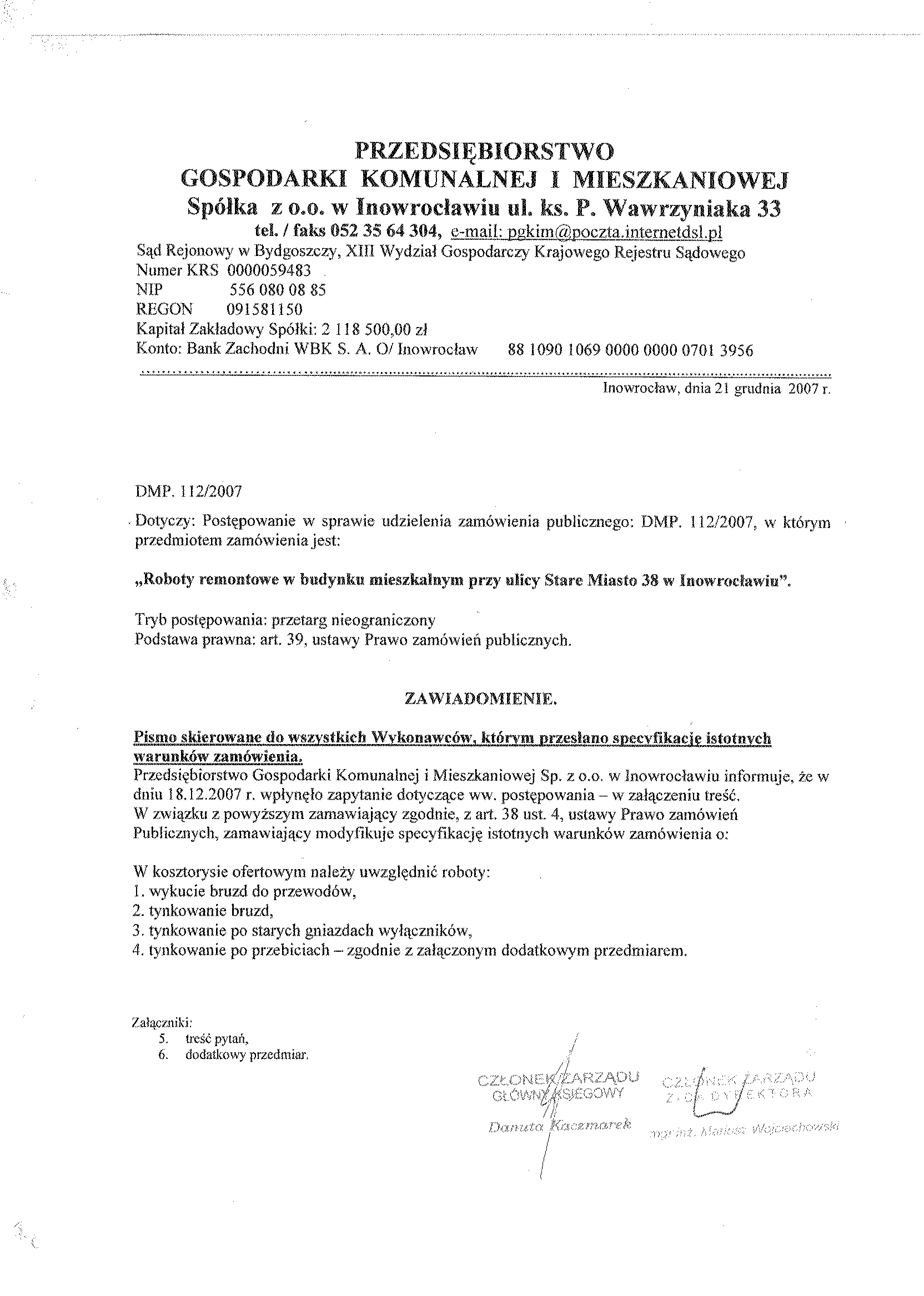 15. W celu potwierdzenia, 偶e Wykonawca posiada uprawnienie do wykonywania okre艣lonej dzia艂alno艣ci lub czynno艣ci oraz nie podlega wykluczeniu na podstawie art. 24 ustawy z dnia 29 stycznia 2004 r. - Prawo zam贸wie艅 publicznych, zamawiaj膮cy 偶膮da, nast臋puj膮cych dokument贸w: a) aktualnego odpisu z w艂a艣ciwego rejestru albo aktualnego za艣wiadczenia o wpisie do ewidencji dzia艂alno艣ci gospodarczej, je偶eli odr臋bne przepisy wymagaj膮 wpisu do rejestru lub zg艂oszenia do ewidencji dzia艂alno艣ci gospodarczej, wystawionego nie wcze艣niej ni偶 6 miesi臋cy przed up艂ywem terminu sk艂adania ofert; b) o艣wiadczenie wykonawcy, 偶e nie posiada zaleg艂o艣ci podatkowej wobec Naczelnika Urz臋du Skarbowego, c) o艣wiadczenie wykonawcy, 偶e nie posiada zaleg艂o艣ci wobec Zak艂adu Ubezpiecze艅 Spo艂ecznych w op艂acaniu sk艂adek na ubezpieczenie spo艂eczne, zdrowotne oraz Fundusz Pracy. 15.1.W celu potwierdzenia posiadania przez wykonawc臋 niezb臋dnej wiedzy i do艣wiadczenia oraz os贸b zdolnych do wykonania zam贸wienia, zamawiaj膮cy 偶膮da nast臋puj膮cych dokument贸w: a) wykazu wykonanych rob贸t budowlanych w okresie ostatniego 1 roku, przed dniem wszcz臋cia post臋powania o udzielenie zam贸wienia, z podaniem ich warto艣ci oraz daty i miejsca wykonania oraz za艂膮czeniem dokument贸w potwierdzaj膮cych, 偶e roboty te zosta艂y wykonane nale偶ycie, z艂. nr 2 do siwz (minimum 1 referencja), b) zamawiaj膮cy 偶膮da za艂膮czenia kserokopii uprawnie艅 budowlanych w specjalno艣ciach obj臋tych przedmiotem zam贸wienia, c) aktualnego wpisu do w艂a艣ciwych Izb Zawodowych. 15.2. W celu potwierdzenia, 偶e wykonawca znajduje si臋 w sytuacji ekonomicznej i finansowej zapewniaj膮cej wykonanie zam贸wienia zamawiaj膮cy 偶膮da nast臋puj膮cych dokument贸w: a) polisy, a w przypadku jej braku innego dokumentu potwierdzaj膮cego, 偶e wykonawca jest ubezpieczony od odpowiedzialno艣ci cywilnej w zakresie prowadzonej dzia艂alno艣ci. 15.3.Wype艂nione nast臋puj膮ce za艂膮czniki: a) formularz ofertowy wykonawcy (za艂. nr 1 do swiz). b) wykaz podobnych rob贸t (za艂. nr 2 do siwz), c) o艣wiadczenie w trybie art.22 ust.1 pkt.1-4聽 ustawy聽 Pzp (za艂. nr 3 do siwz). 15.4.Kosztorys ofertowy, kt贸ry musi by膰 integraln膮 cz臋艣ci膮 z艂o偶onej oferty. Podstaw膮 do opracowania przez Wykonawc臋聽 kosztorysu ofertowego jest聽 przedmiar rob贸t, b臋d膮cy za艂膮cznikiem do siwz. Wykonawca mo偶e przyj膮膰 dowoln膮 form臋 i podstaw臋 wyceny rob贸t. 16. Miejsce i termin sk艂adania ofert: oferty nale偶y z艂o偶y膰 w sekretariacie Przedsi臋biorstwa Gospodarki Komunalnej i Mieszkaniowej Sp. z o.o., ul. ks. Piotra Wawrzyniaka 33, 88-100 Inowroc艂aw,聽 do dnia 24 grudnia 2007 r. godzina 9.50. 17. Kryteria wyboru ofert: 聽聽聽 聽a) 聽cena wykonania zam贸wienia聽聽聽聽聽聽聽聽聽聽聽聽聽聽 80 聽聽聽聽 b) gwarancja聽聽聽聽聽聽聽聽聽聽聽聽 聽聽聽聽聽聽聽聽聽聽聽聽聽聽聽聽聽聽聽聽聽聽聽聽聽聽聽聽聽聽聽20 18. Zamawiaj膮cy nie wymaga wadium. 19.Miejsce i termin otwarcia ofert: Przedsi臋biorstwo Gospodarki Komunalnej i Mieszkaniowej Sp. z o.o., ul. ks. Piotra Wawrzyniaka 33, 88-100 Inowroc艂aw, do dnia 24 grudnia 2007 r. godzina 10.00 20.Termin zwi膮zania聽 ofert膮: 30 dni . 21. Zabezpieczenie nale偶ytego wykonania umowy (znwu) w wysoko艣ci 2 % od ustalonej warto艣ci zam贸wienia. 聽