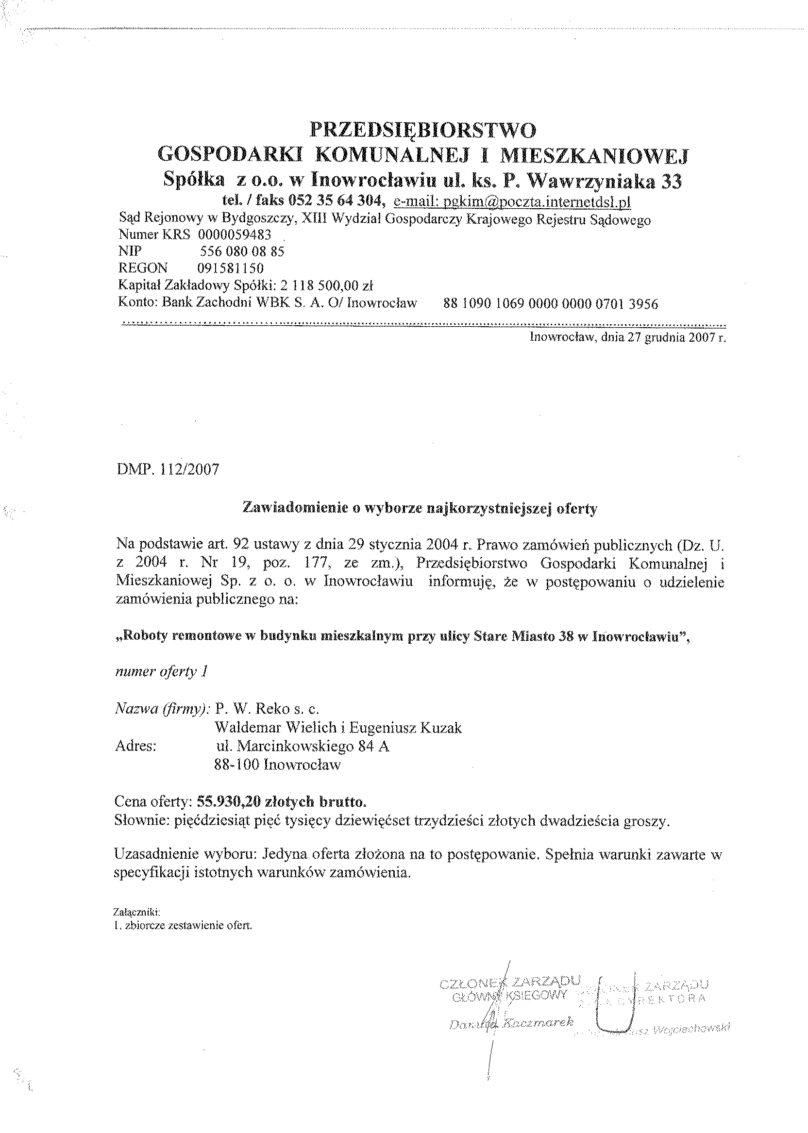 1. Zamawiaj膮cy: 聽聽Urz膮d Miasta Inowroc艂awia ul. Roosevelta 36, w imieniu i na rzecz kt贸rego dzia艂a na mocy umowy o administrowanie, Przedsi臋biorstwo Gospodarki Komunalnej i Mieszkaniowej Sp. z o.o. w Inowroc艂awiu, 聽 Ulica: ks. Piotra Wawrzyniaka 33 Kod: 88-100, Miejscowo艣膰: Inowroc艂aw Telefon / faks 052 35 64聽304 e-mail: pgkim@poczta.internetdsl.pl聽 http://pgkim-inowroclaw.samorzady.pl 聽