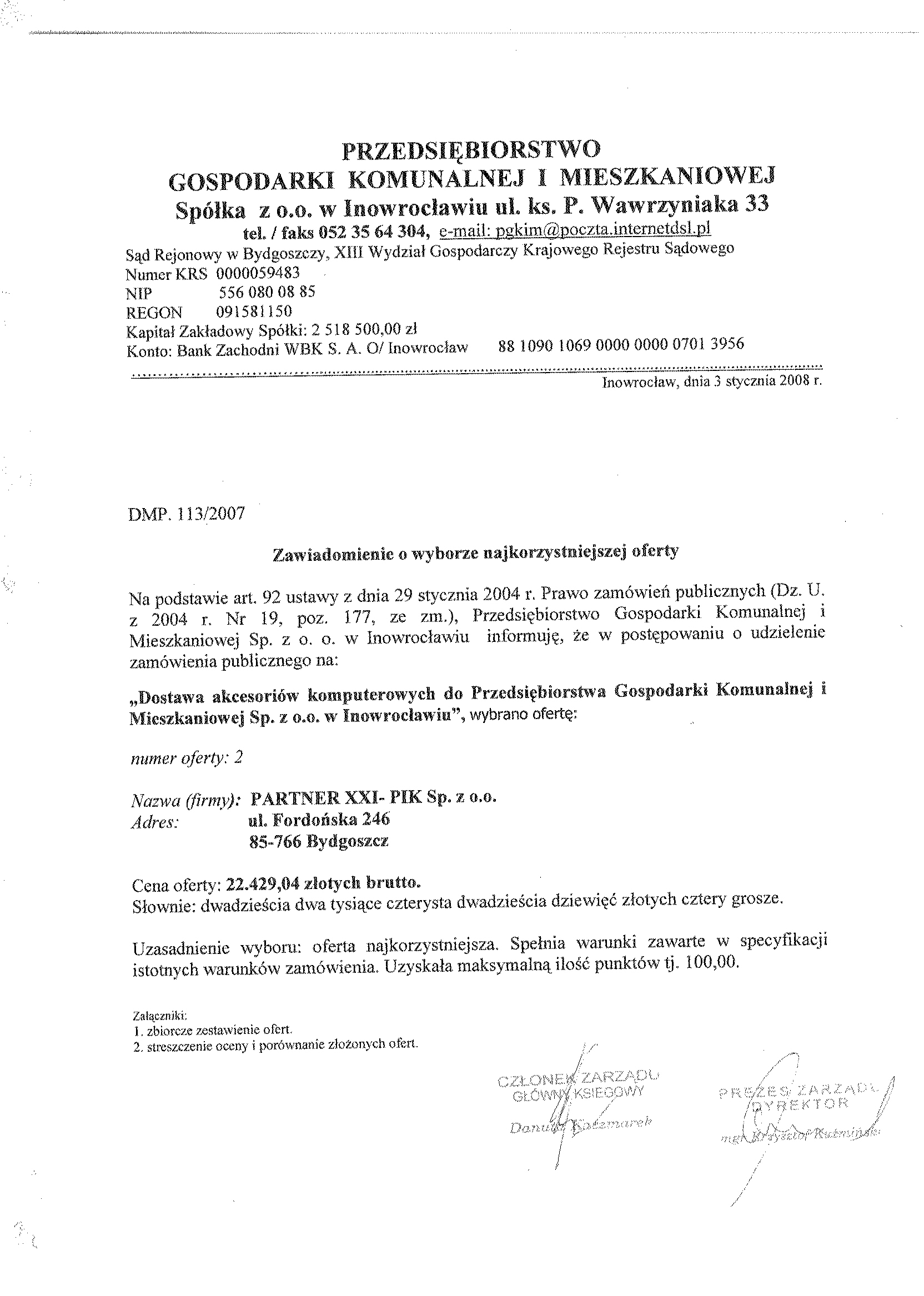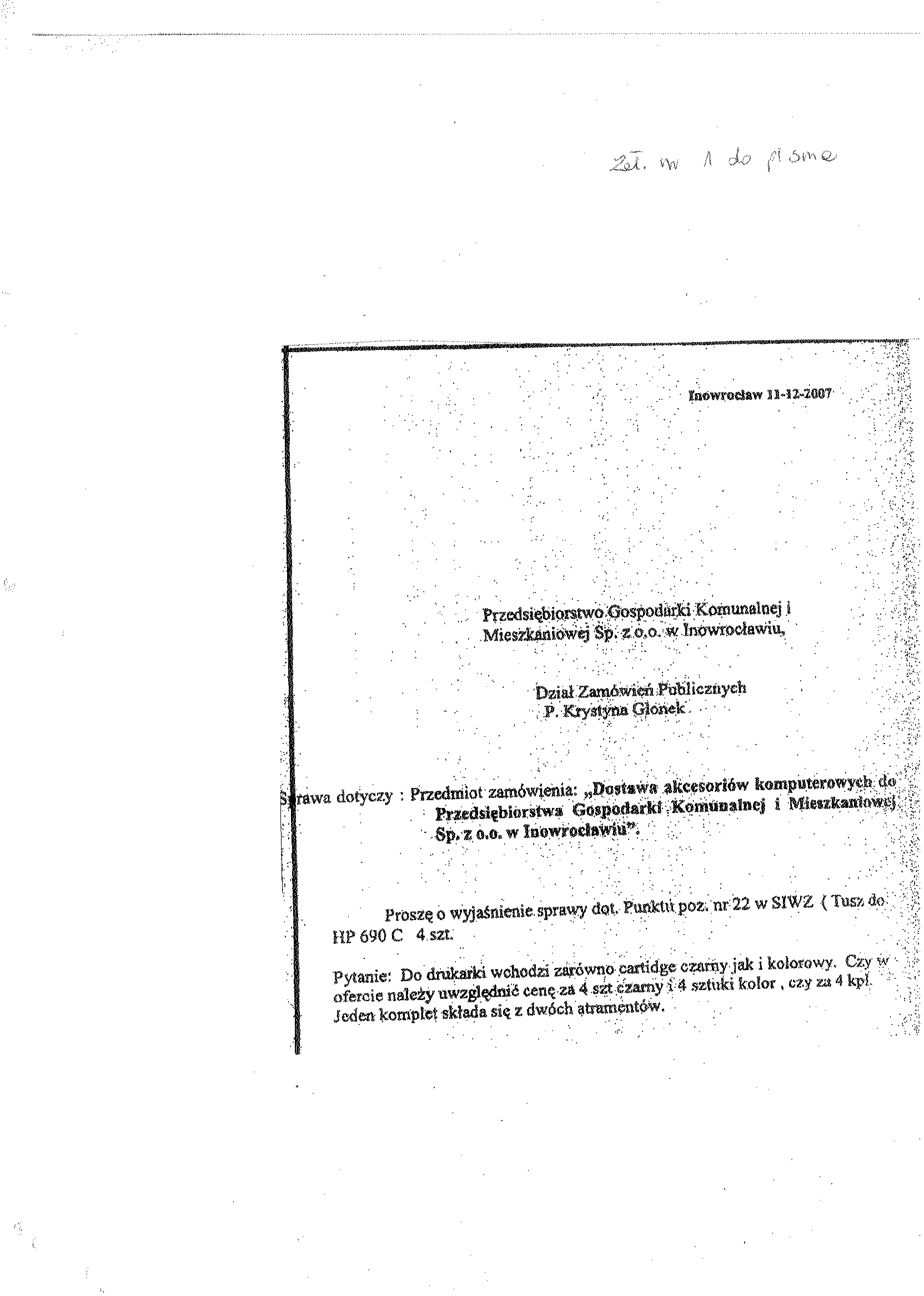 聽 聽聽聽聽聽 2.2. Rodzaj zam贸wienia: dostawa. 聽聽2.3. Okre艣lenie przedmiotu zam贸wienia: przedmiotem zam贸wienia s膮 sukcesywnie dostawy akcesori贸w komputerowych tj. dyskietki, p艂yty, ta艣my, tonery, tusze, b臋bny do siedziby zamawiaj膮cego, zgodnie z opisem przedmiotu zam贸wienia oraz za艂膮cznikiem nr 1 do siwz. 聽聽2.3. Wsp贸lny S艂ownik Zam贸wie艅 (CPV): 30. 21.聽72.00 - 5聽 akcesoria komputerowe 聽聽聽2.4. Nie dopuszcza si臋 sk艂adania ofert cz臋艣ciowych. 聽聽聽2.5. Nie dopuszcza si臋 sk艂adania ofert wariantowych. 聽聽聽2.6. Zamawiaj膮cy nie przewiduje zawarcia umowy ramowej, jak r贸wnie偶 nie dokona wyboru oferty najkorzystniejszej z zastosowaniem aukcji elektrycznej. 聽聽聽2.7. Termin wykonania zam贸wienia: od podpisania umowy na okres 24 miesi臋cy. 聽 聽聽聽聽3. Warunki dotycz膮ce zam贸wienia. 聽聽聽聽3.1. Zamawiaj膮cy nie wymaga wadium oraz nie przewiduje wniesienia zabezpieczenia nale偶ytego wykonania umowy. 聽聽聽3.2. O udzielenie zam贸wienia mog膮 ubiega膰 si臋 wy艂膮cznie Dostawcy, kt贸rzy: 聽聽聽聽聽聽 a) posiadaj膮 uprawnienia do wykonywania okre艣lonej dzia艂alno艣ci lub czynno艣ci, je偶eli聽聽ustawy nak艂adaj膮 obowi膮zek posiadania takich uprawnie艅, 聽聽聽聽聽聽 b) posiadaj膮 niezb臋dn膮 wiedz臋 i do艣wiadczenie oraz potencja艂 techniczny, a tak偶e dysponuj膮聽聽osobami zdolnymi do wykonania zam贸wienia, 聽聽聽聽聽聽 c) nie podlegaj膮 wykluczeniu z post臋powania o udzielenie zam贸wienia. 聽聽聽聽聽聽 Zamawiaj膮cy oceni spe艂nienie warunk贸w wymienionych w niniejszym rozdziale na聽聽podstawie z艂o偶onych przez Dostawc臋, do oferty, o艣wiadcze艅 i dokument贸w. Ocena spe艂niania warunk贸w dokonana zostanie na zasadzie: spe艂nia/ nie spe艂nia 3.3. W celu potwierdzenia, 偶e Dostawca posiada uprawnienie do wykonywania okre艣lonej dzia艂alno艣ci lub czynno艣ci oraz nie podlega wykluczeniu na podstawie art. 24 ustawy z dnia 29 stycznia 2004 r. - Prawo zam贸wie艅 publicznych, zamawiaj膮cy 偶膮da, nast臋puj膮cych dokument贸w: a) aktualnego odpisu z w艂a艣ciwego rejestru albo aktualnego za艣wiadczenia o wpisie do ewidencji dzia艂alno艣ci gospodarczej, je偶eli odr臋bne przepisy wymagaj膮 wpisu do rejestru lub zg艂oszenia do ewidencji dzia艂alno艣ci gospodarczej, wystawionego nie wcze艣niej ni偶 6 miesi臋cy przed up艂ywem聽 terminu sk艂adania ofert; b) o艣wiadczenie dostawcy, 偶e nie posiada zaleg艂o艣ci podatkowej wobec Naczelnika Urz臋du Skarbowego, c) o艣wiadczenie dostawcy, 偶e nie posiada zaleg艂o艣ci wobec Zak艂adu Ubezpiecze艅 Spo艂ecznych w op艂acaniu sk艂adek na ubezpieczenie spo艂eczne, zdrowotne oraz Fundusz Pracy. 3.4. W celu potwierdzenia posiadania przez dostawc臋 niezb臋dnej wiedzy i do艣wiadczenia oraz os贸b zdolnych do wykonania zam贸wienia, zamawiaj膮cy 偶膮da nast臋puj膮cych dokument贸w: a) wykazu wykonanych podobnych dostaw w okresie ostatnich 2 lat, przed dniem wszcz臋cia post臋powania o udzielenie zam贸wienia, z podaniem ich warto艣ci oraz daty i聽 miejsca wykonania oraz za艂膮czeniem dokument贸w potwierdzaj膮cych, 偶e dostawy te zosta艂y wykonane nale偶ycie, z艂. nr 3 do siwz (minimum 2 referencje), 聽聽聽聽聽 b) kserokopi臋 certyfikatu聽 ISO 9001:2000 na system wytwarzania produkt贸w (w przypadku聽zaoferowania produktu r贸wnowa偶nego). 3.5. Wype艂nione nast臋puj膮ce za艂膮czniki: a) o艣wiadczenie w trybie art. 22 ust.1 pkt.1-4聽 ustawy聽 Pzp (za艂. nr 2 do siwz). b) formularz ofertowy wykonawcy (za艂. nr 1 do swiz). 聽聽聽聽聽 4. Osobami uprawnionymi do kontakt贸w z dostawcami s膮: 聽聽聽聽聽 a) Krystyna Glonek, tel. /faks 052 35 64聽304, 聽聽聽聽聽 b) Ryszard Tuszy艅ski, tel. 052聽35 64聽310. 聽聽聽聽聽 5. Adres strony internetowej, na kt贸rej dostepna jest specyfikacja istotnych warunk贸w聽聽zam贸wienia: http://pgkim-inowroclaw.samorzady.pl 聽聽聽聽聽 6. Op艂ata za otrzymanie specyfikacji istotnych warunk贸w zam贸wienia b臋dzie pokrywa膰聽聽jedynie koszty jej druku oraz przekazania. 聽聽聽聽聽 7. Dostawca zainteresowany post臋powaniem powinien z艂o偶y膰 wniosek u zamawiajacego z聽聽podaniem wszystkich danych firmy- niezb臋dnych do przekazania zmian i zapyta艅聽聽dotycz膮cych powy偶szego postepowania. 聽聽聽聽聽 8. Kryteria oceny ofert: najni偶sza cena. 聽 聽聽聽聽聽9. Miejsce i termin sk艂adania ofert: oferty nale偶y z艂o偶y膰 w sekretariacie Przedsiebiorstwa Gospodarki Komunalnej i Mieszkaniowej Sp. z o. o., ul. ks. Piotra Wawrzyniaka 33, 88-100聽聽Inowroc艂aw, do dnia聽 20 grudnia 2007 r. do godz. 9:50.
