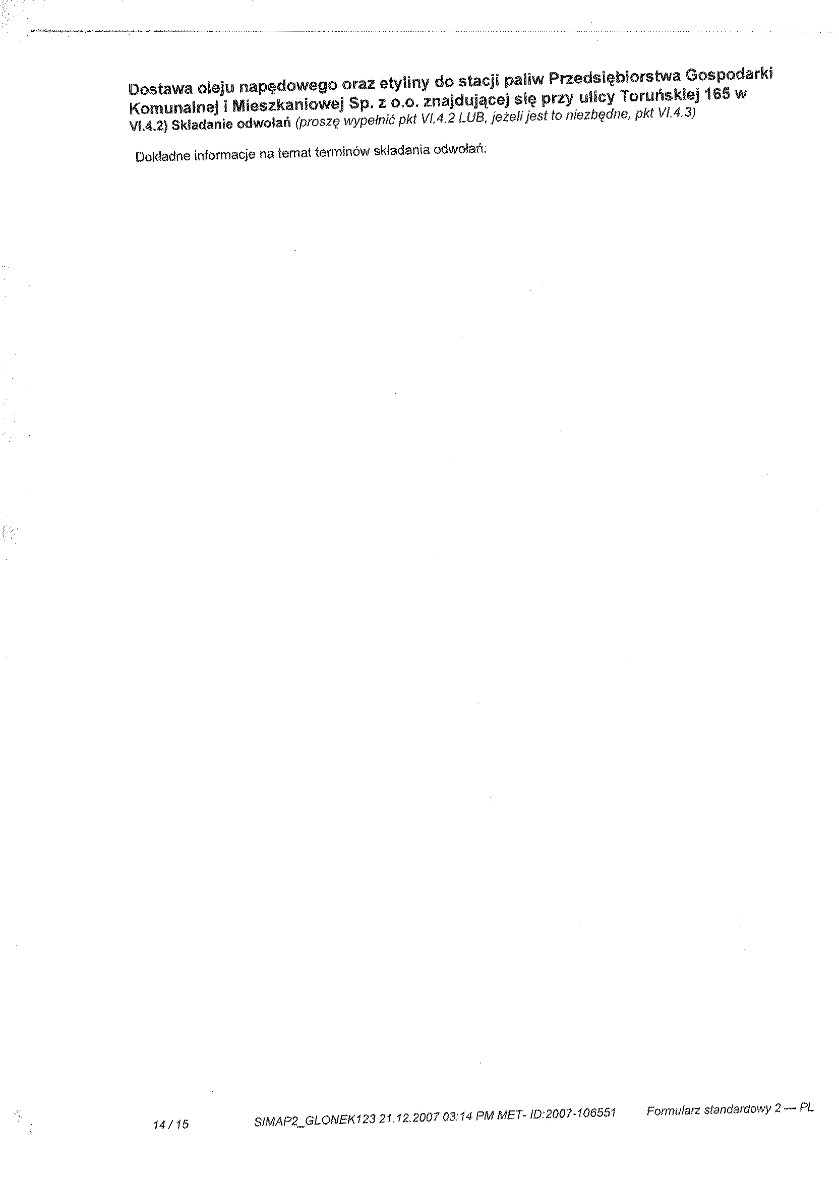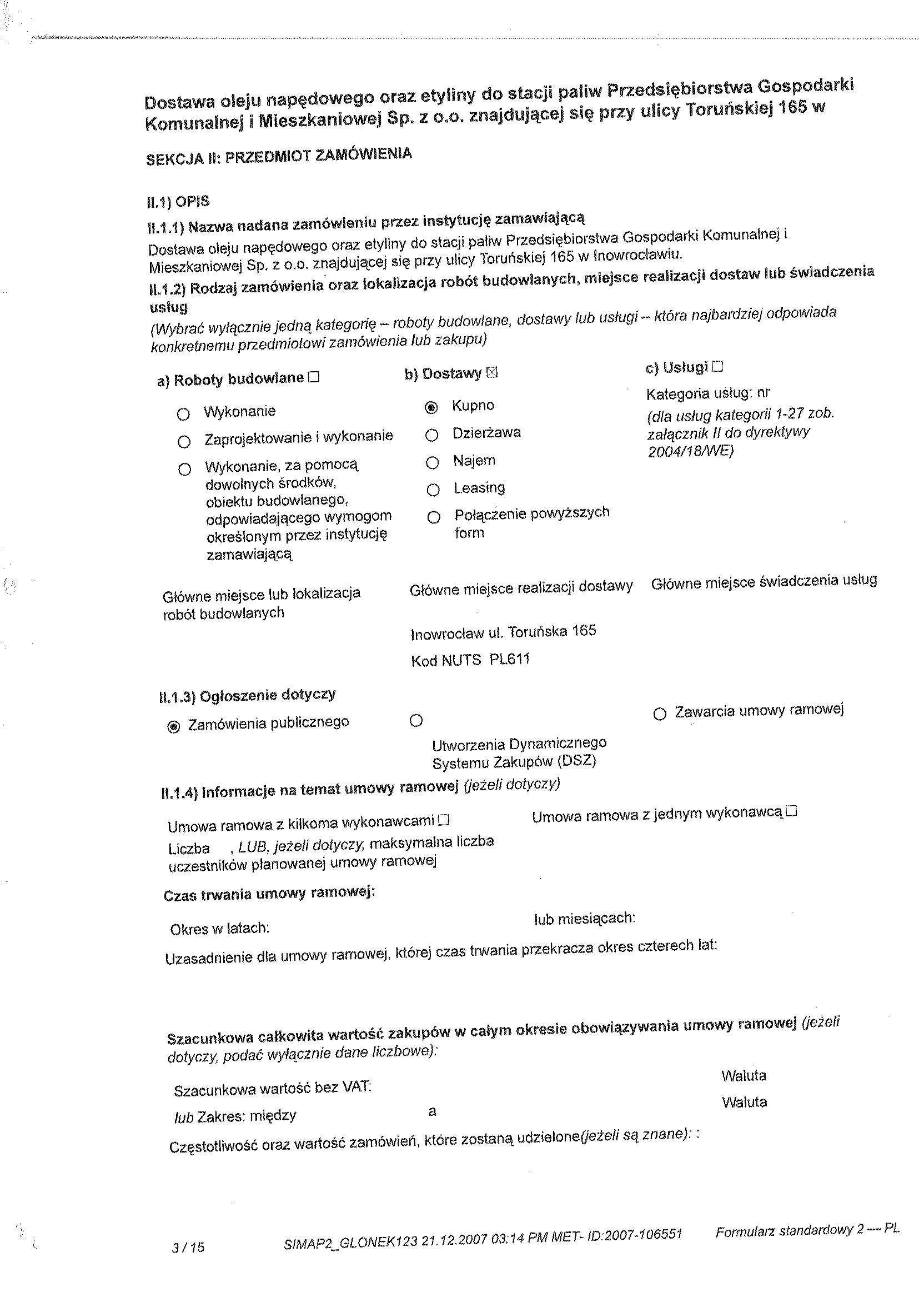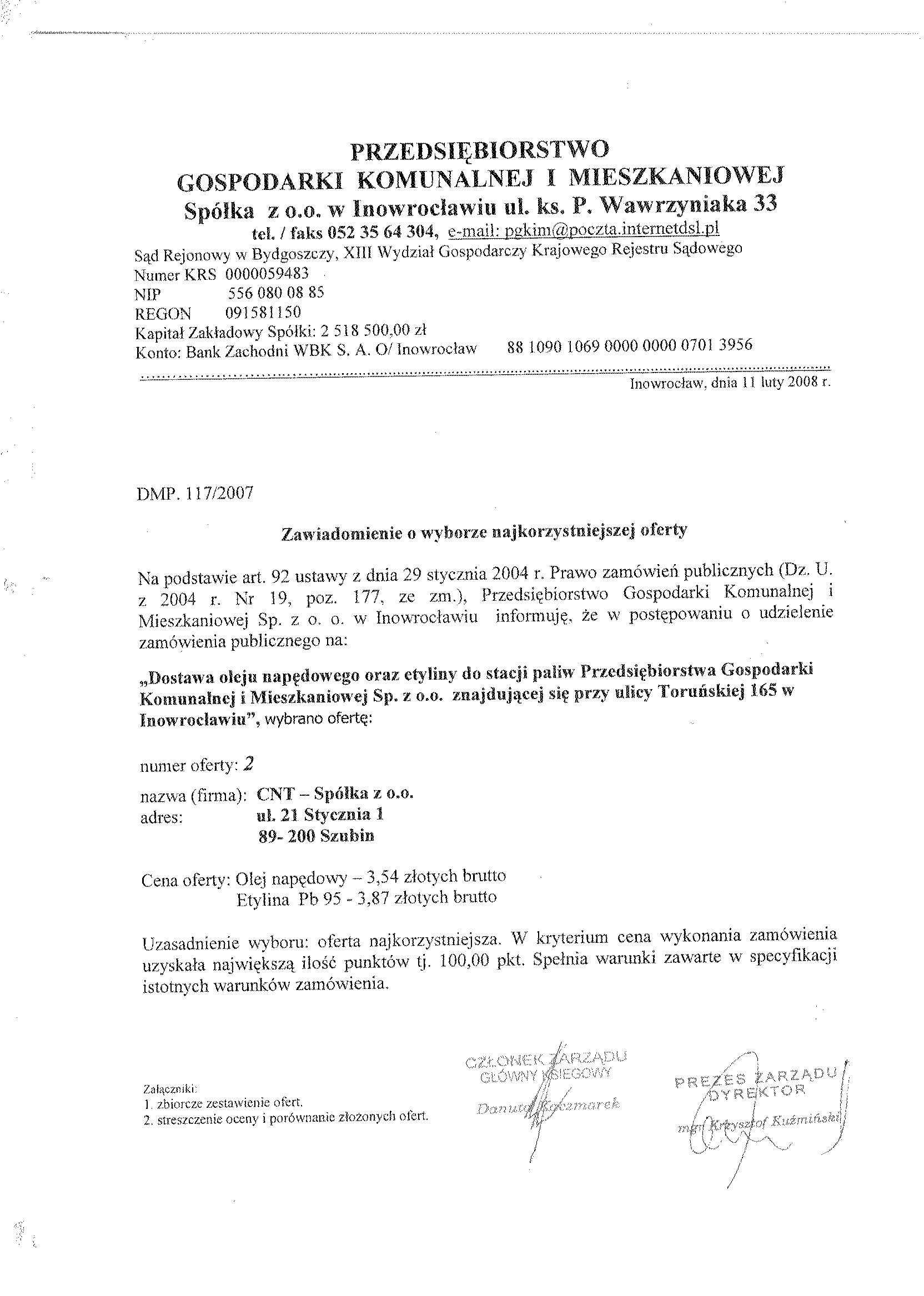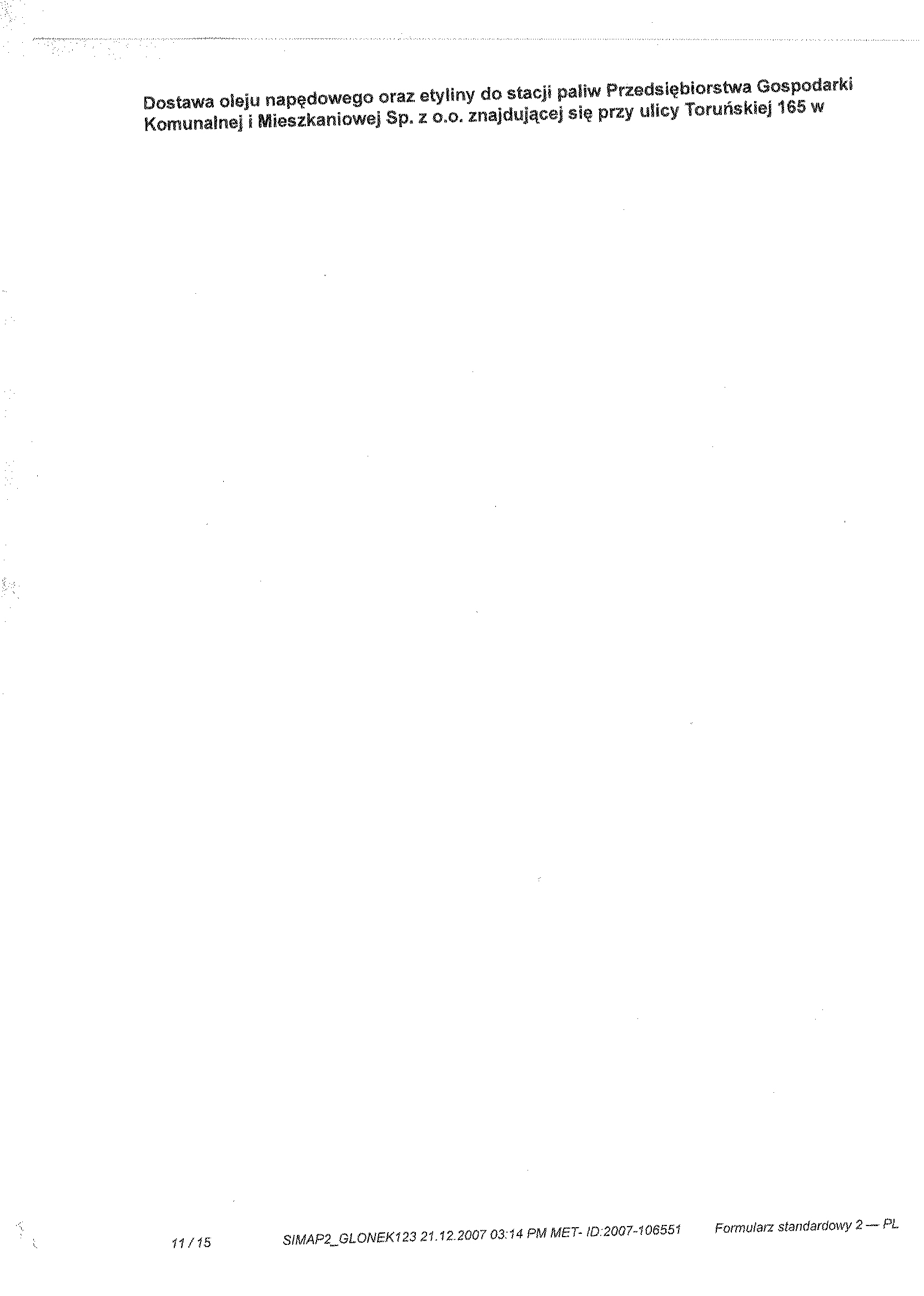 "Dostawa oleju napędowego oraz etyliny do stacji paliw Przedsiębiorstwa Gospodarki Komunalnej i Mieszkaniowej Sp. zo.o. znajdującej się przy ulicy Toruńskiej 165 w Inowrocławiu".