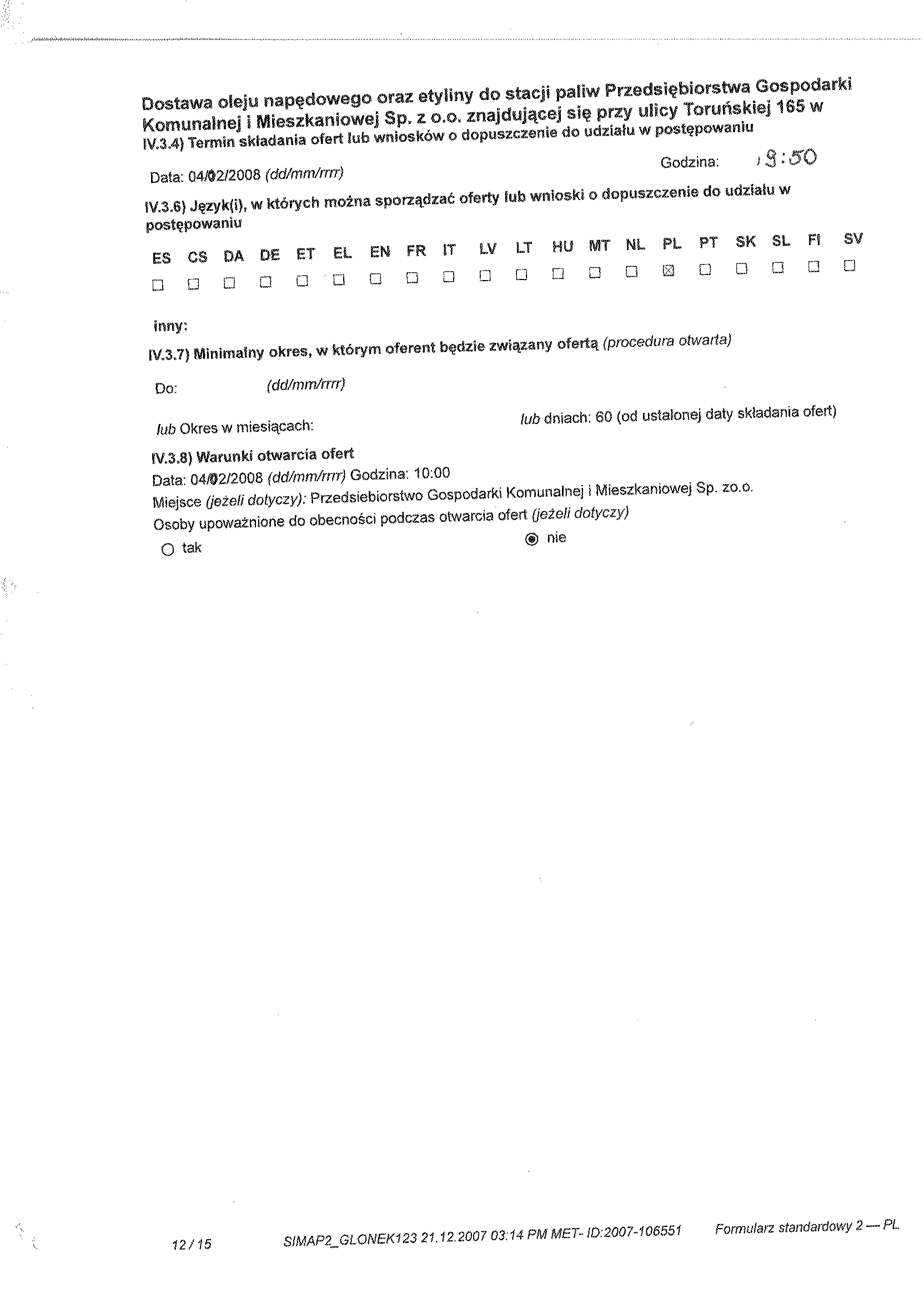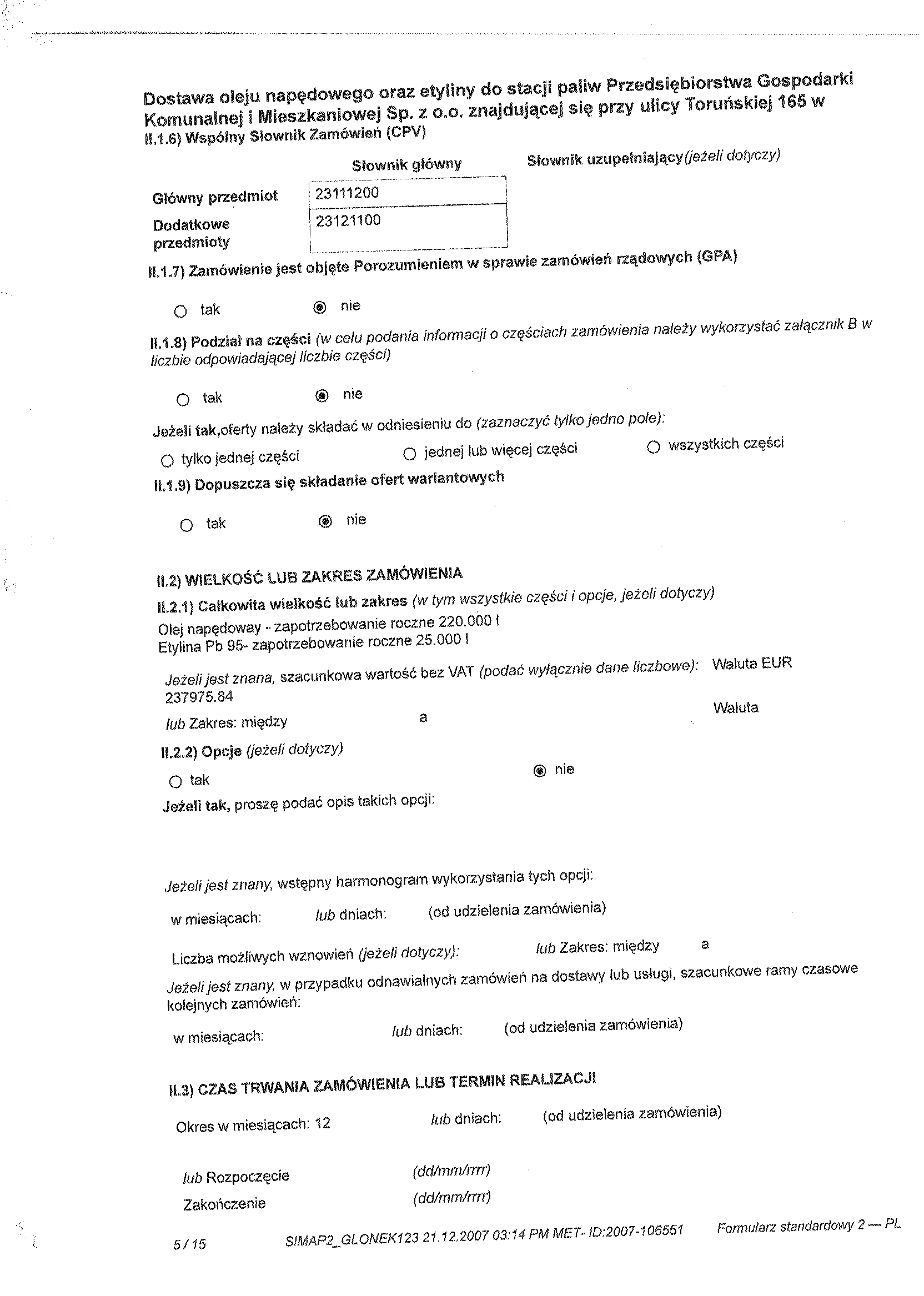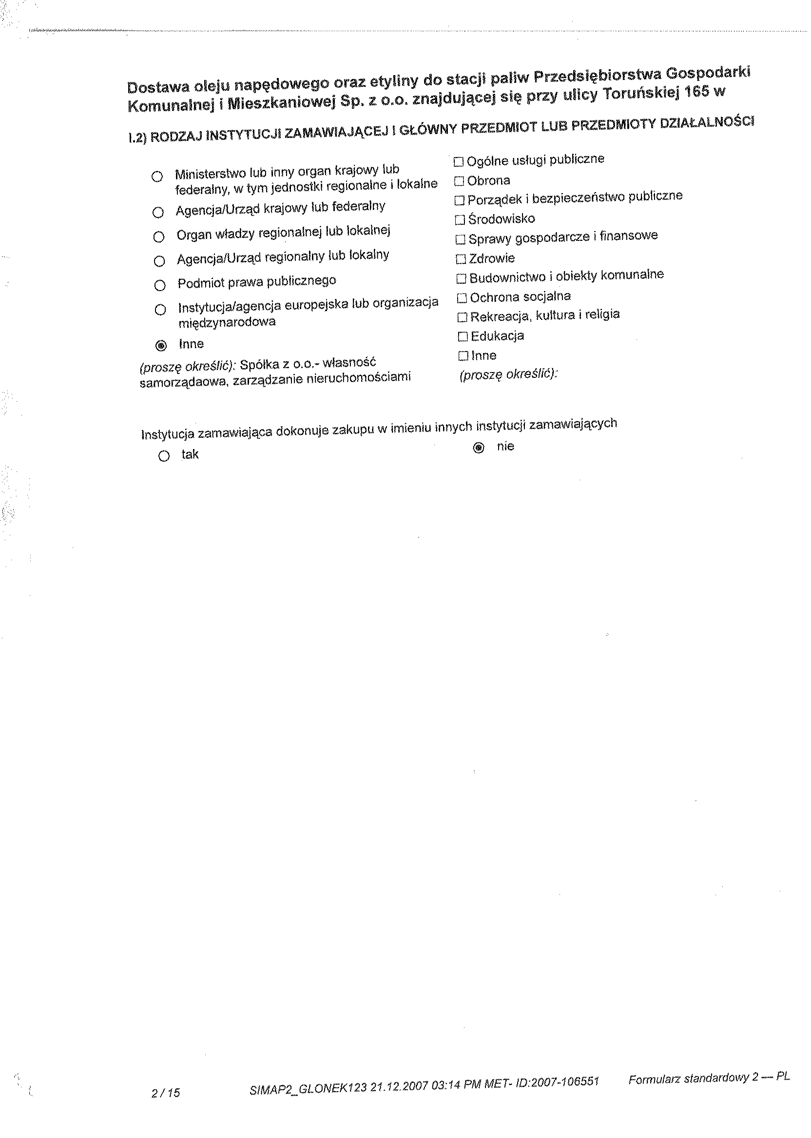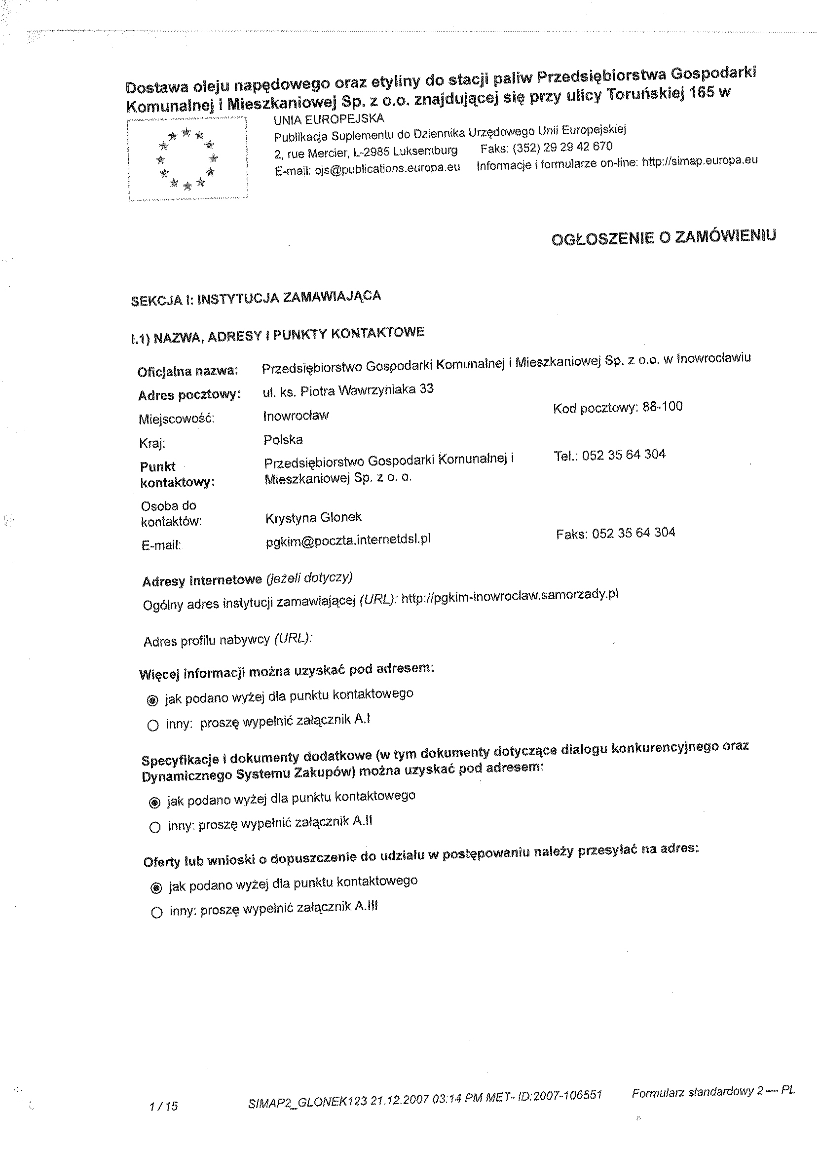 "Dostawa oleju napędowego oraz etyliny do stacji paliw Przedsiębiorstwa Gospodarki Komunalnej i Mieszkaniowej Sp. zo.o. znajdującej się przy ulicy Toruńskiej 165 w Inowrocławiu".