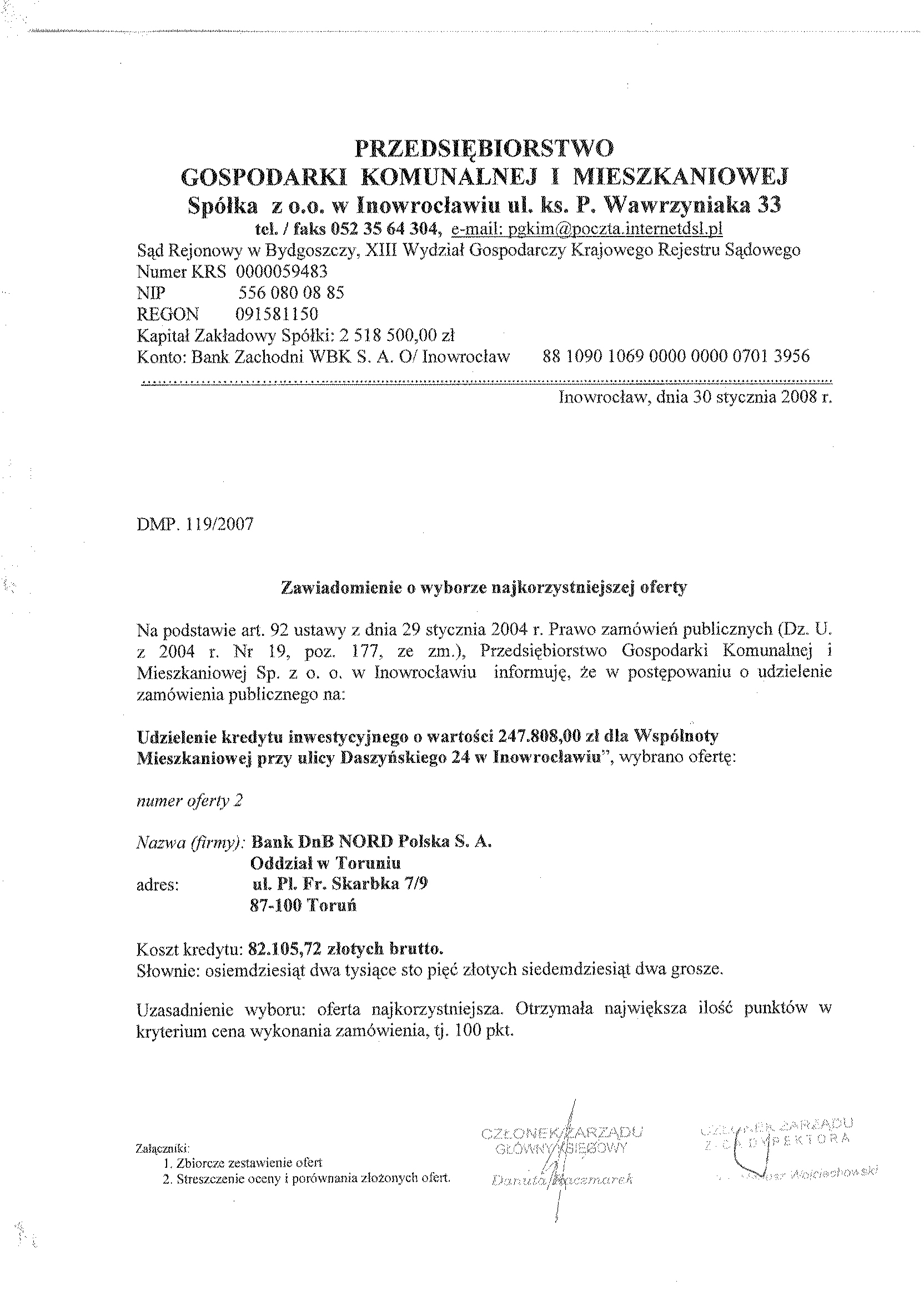 "Udzielenie kredytu inwestycyjnego o warto艣ci 247.808,00 z艂 dla Wsp贸lnoty Mieszkaniowej przy ulicy Daszy艅skiego 24 w Inowroc艂awiu". 聽