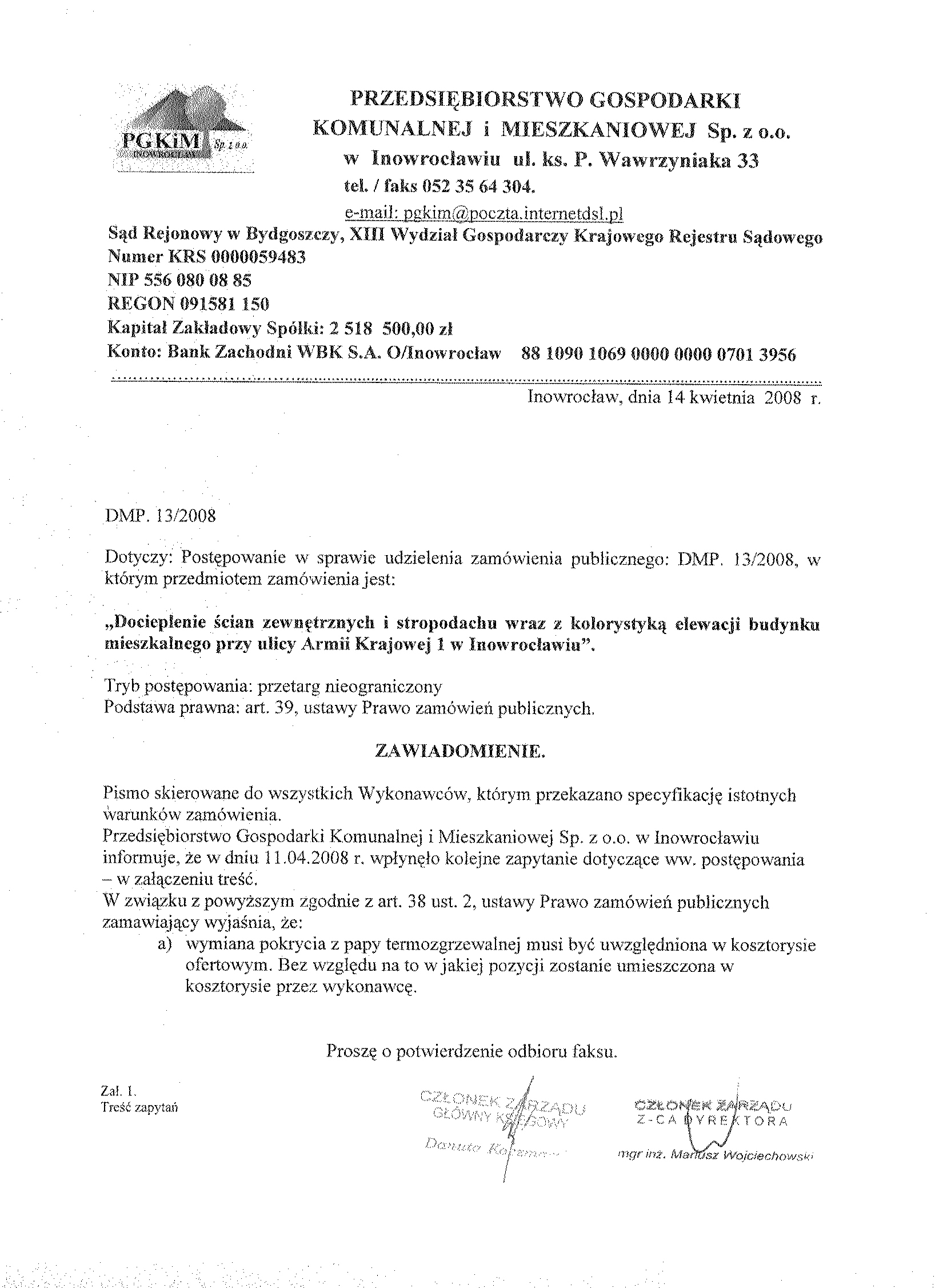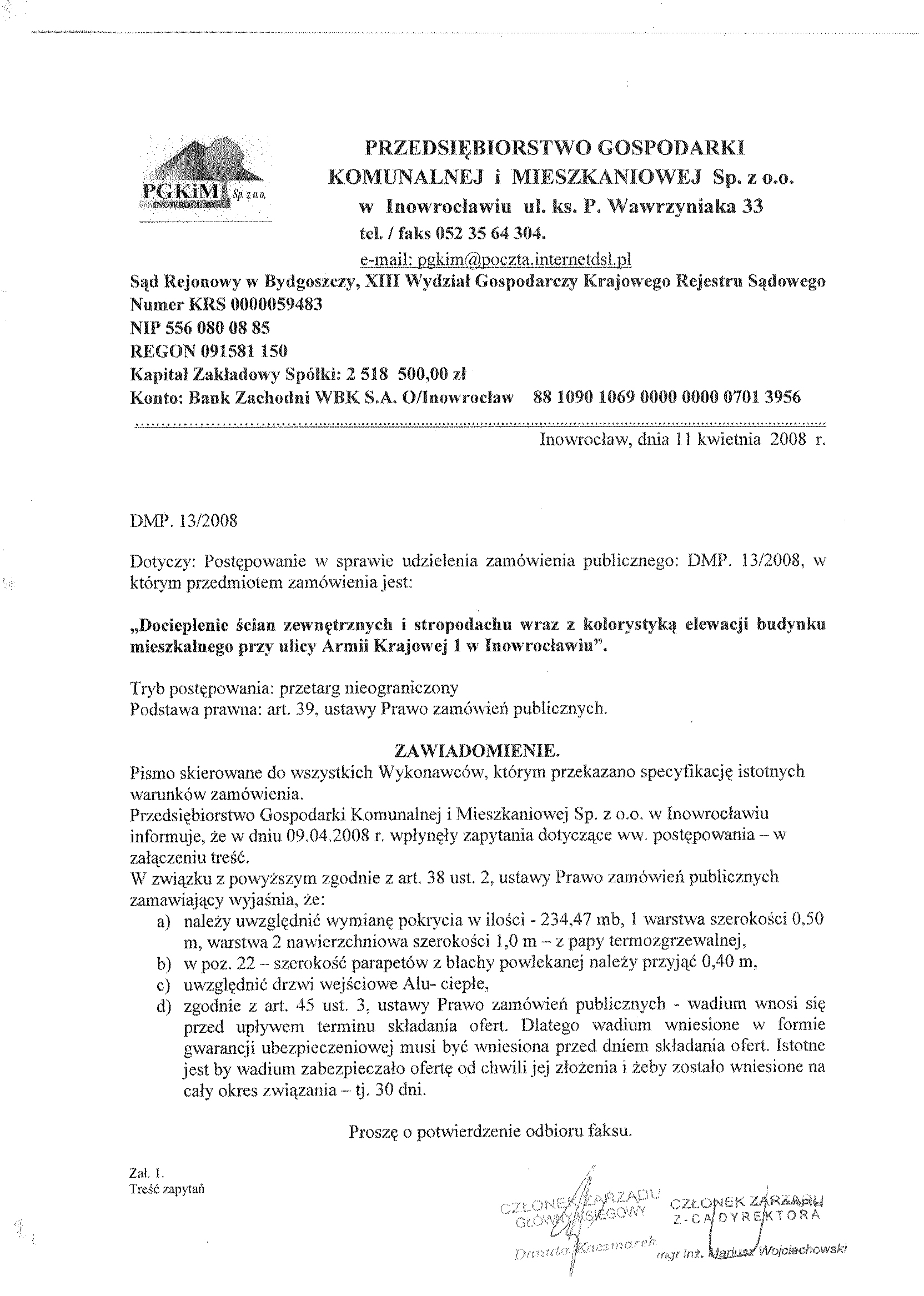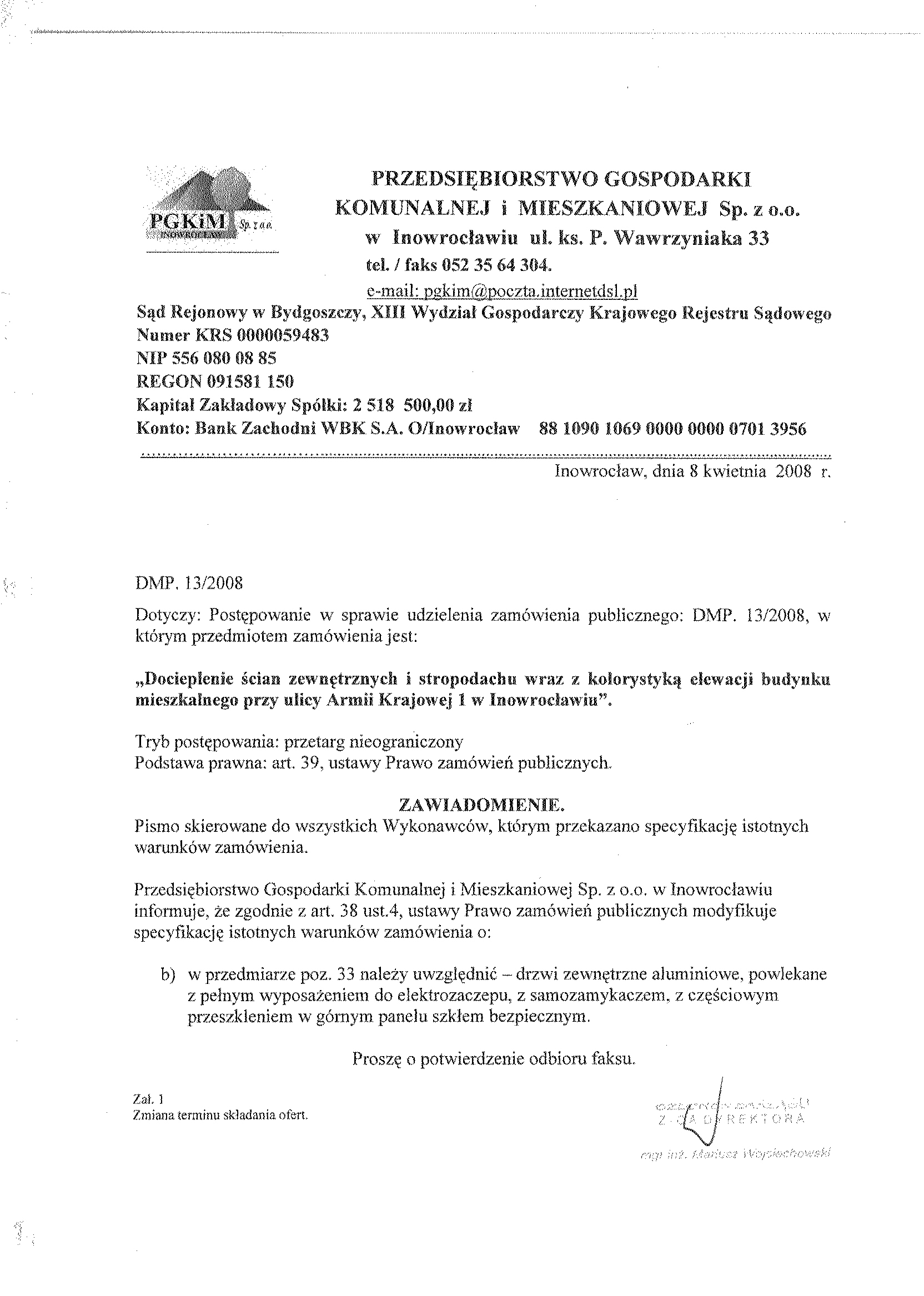 8. Miejsce i termin otwarcia ofert: Przedsi臋biorstwo Gospodarki Komunalnej i Mieszkaniowej Sp. z o.o., ul. ks. Piotra Wawrzyniaka 33, 88-100 Inowroc艂aw, do dnia 9 kwietnia 聽2008 r. o godzinie 10.00 9.Termin zwi膮zania聽 ofert膮: 30 dni . 10. Zabezpieczenie nale偶ytego wykonania umowy (znwu) w wysoko艣ci 2 % od ustalonej warto艣ci zam贸wienia. 聽