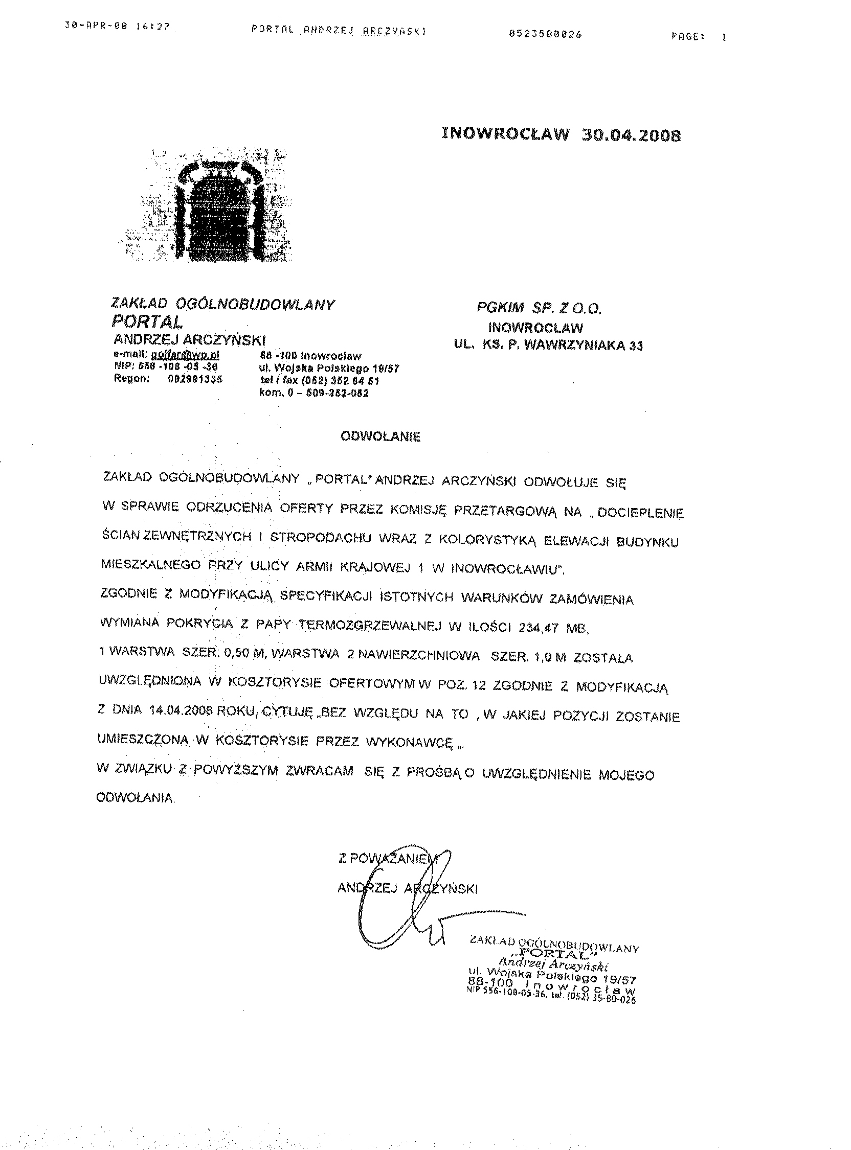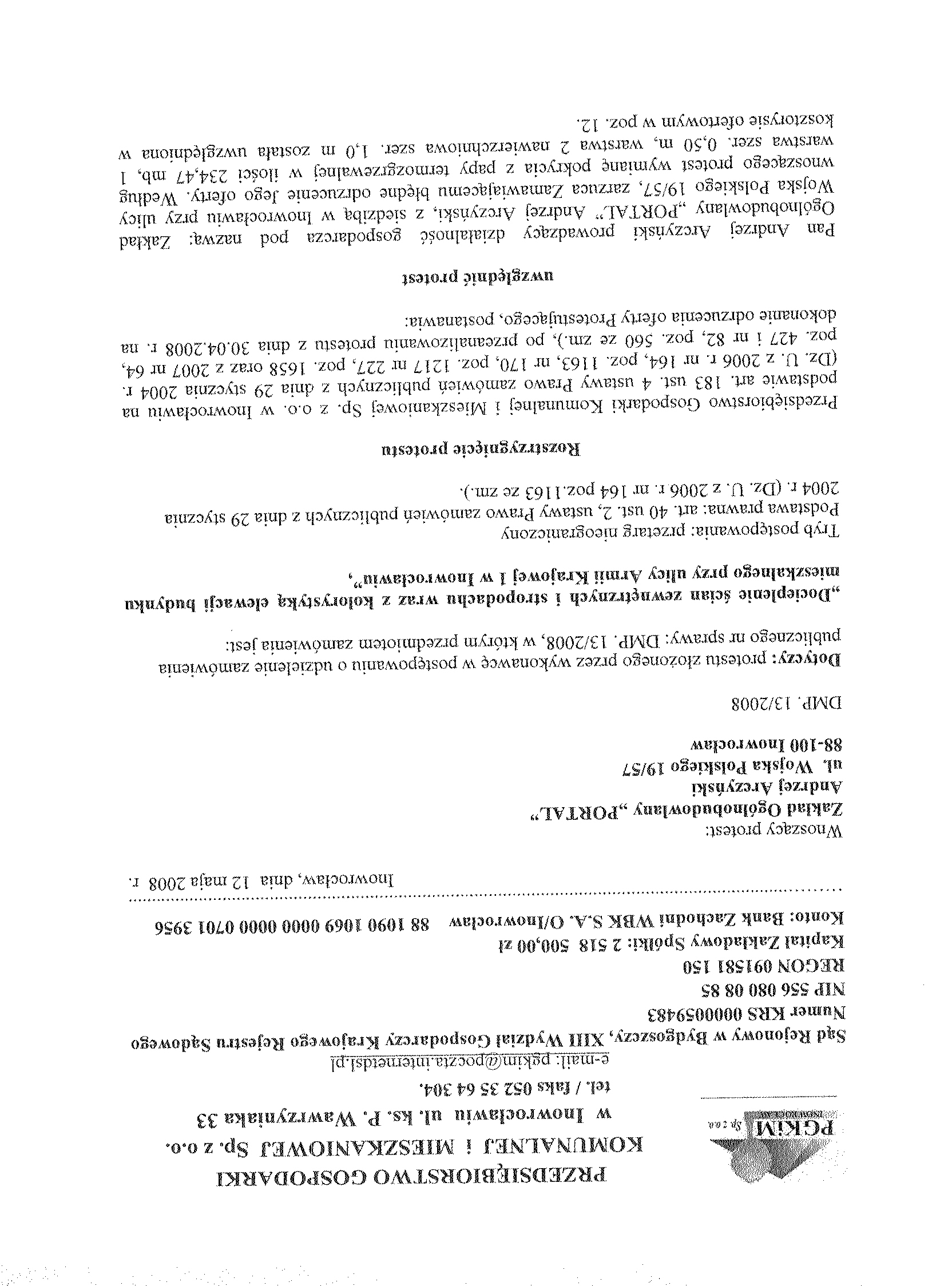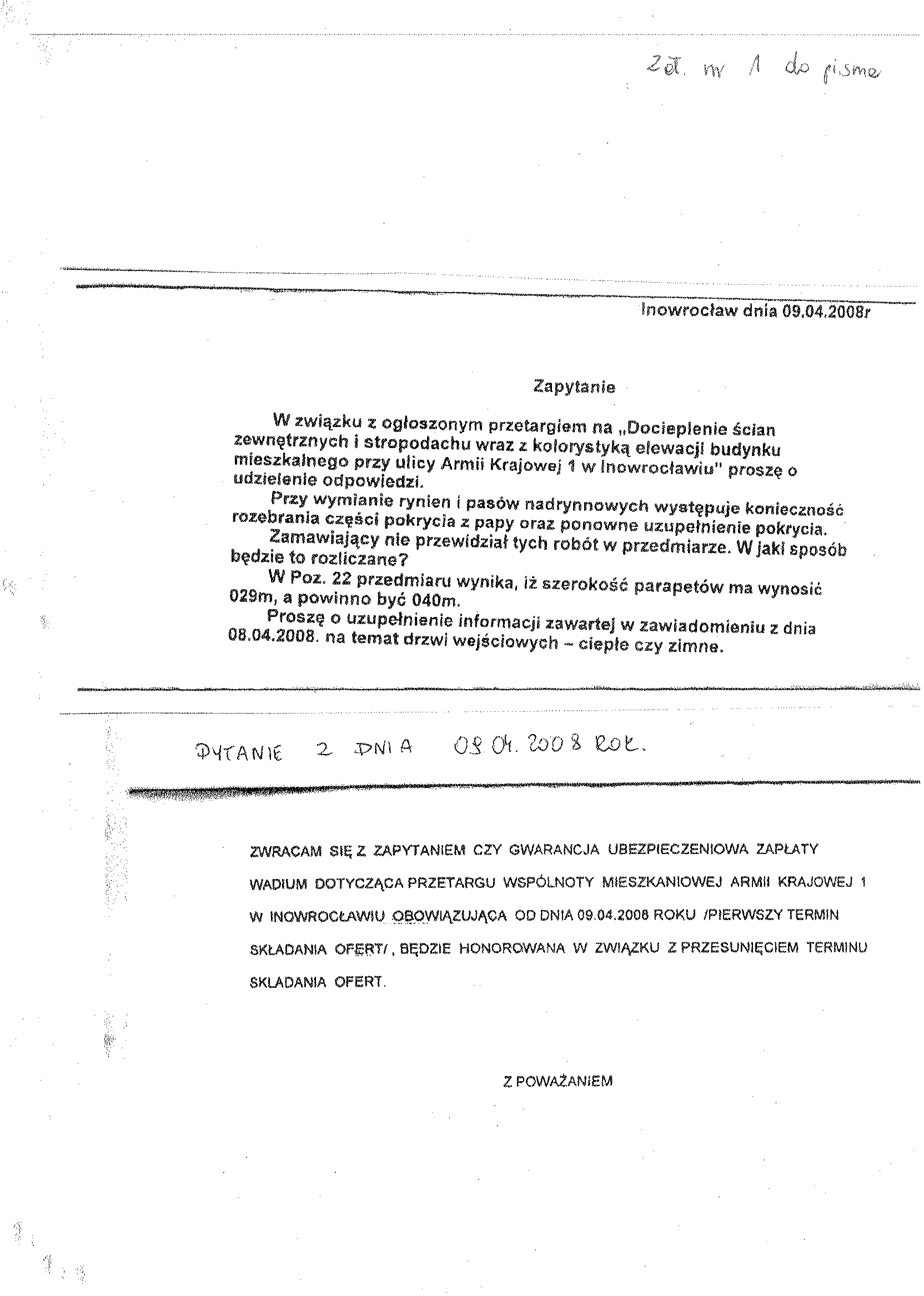 8. Miejsce i termin otwarcia ofert: Przedsi臋biorstwo Gospodarki Komunalnej i Mieszkaniowej Sp. z o.o., ul. ks. Piotra Wawrzyniaka 33, 88-100 Inowroc艂aw, do dnia 9 kwietnia 聽2008 r. o godzinie 10.00 9.Termin zwi膮zania聽 ofert膮: 30 dni . 10. Zabezpieczenie nale偶ytego wykonania umowy (znwu) w wysoko艣ci 2 % od ustalonej warto艣ci zam贸wienia. 聽
