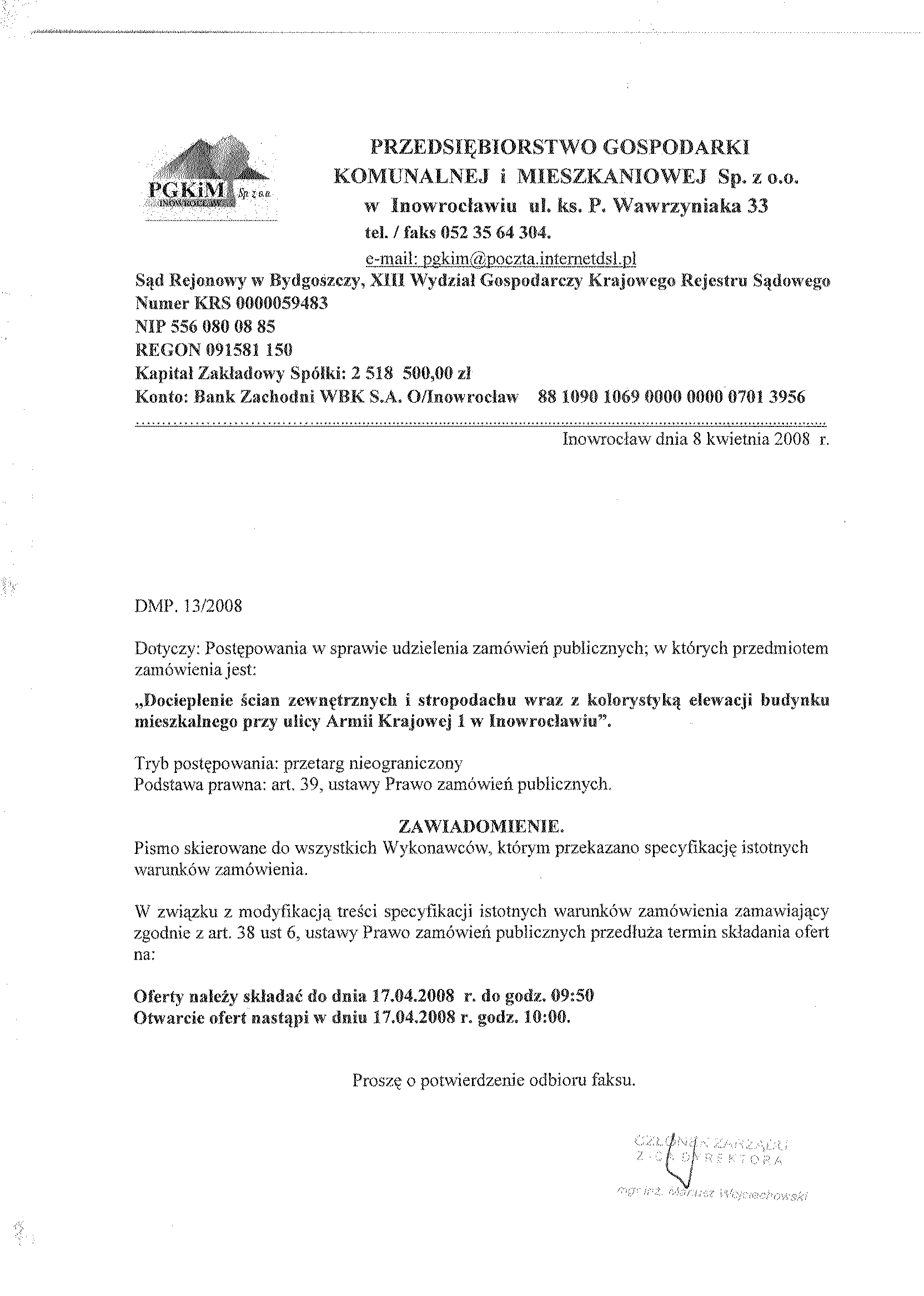 7. Miejsce i termin sk艂adania ofert: oferty nale偶y z艂o偶y膰 w sekretariacie Przedsi臋biorstwa Gospodarki Komunalnej i Mieszkaniowej Sp. z o.o., ul. ks. Piotra Wawrzyniaka 33, 88-100 Inowroc艂aw,聽 do dnia 9 kwietnia 2008 r. do godziny 9.50. 聽