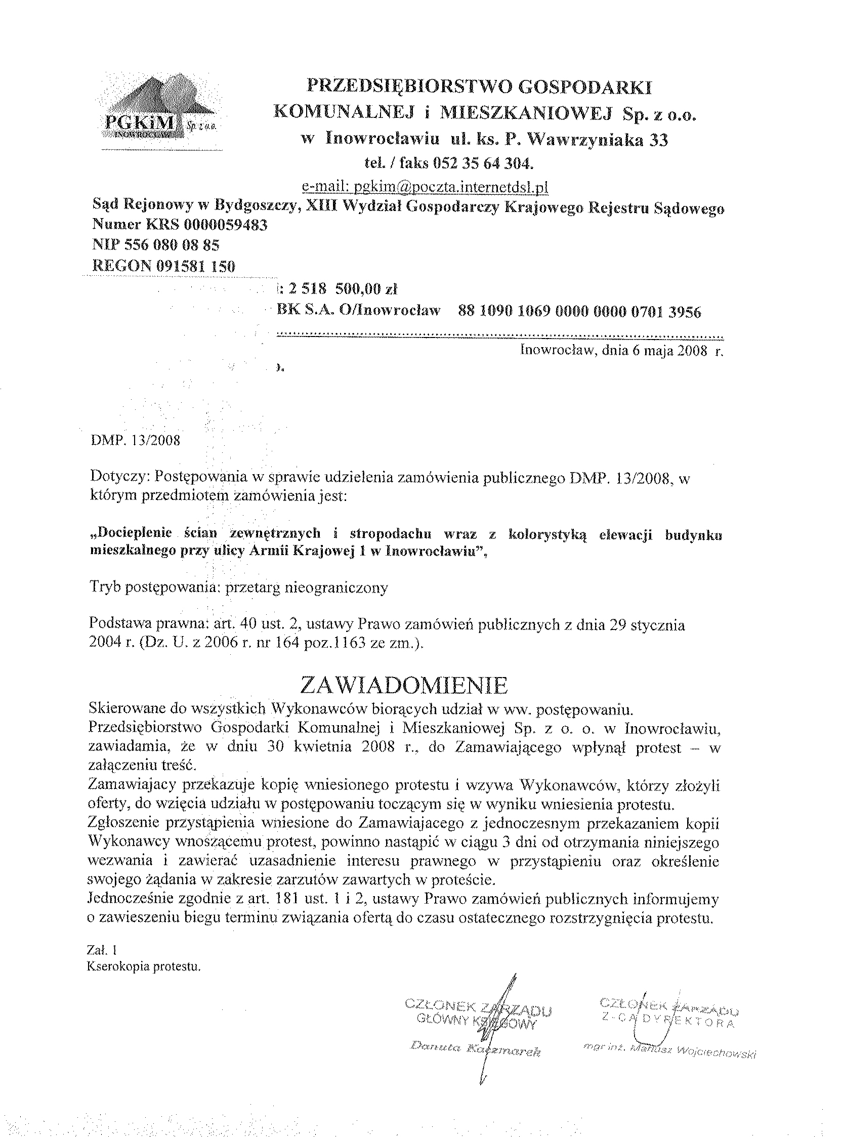 1. Zamawiaj膮cy: 聽聽Wsp贸lnota Mieszkaniowa przy ulicy Armii Krajowej 1 w Inowroc艂awiu w imieniu i na rzecz kt贸rej dzia艂a na mocy umowy o administrowanie, Przedsi臋biorstwo Gospodarki Komunalnej i Mieszkaniowej Sp. z o.o. w Inowroc艂awiu, 聽