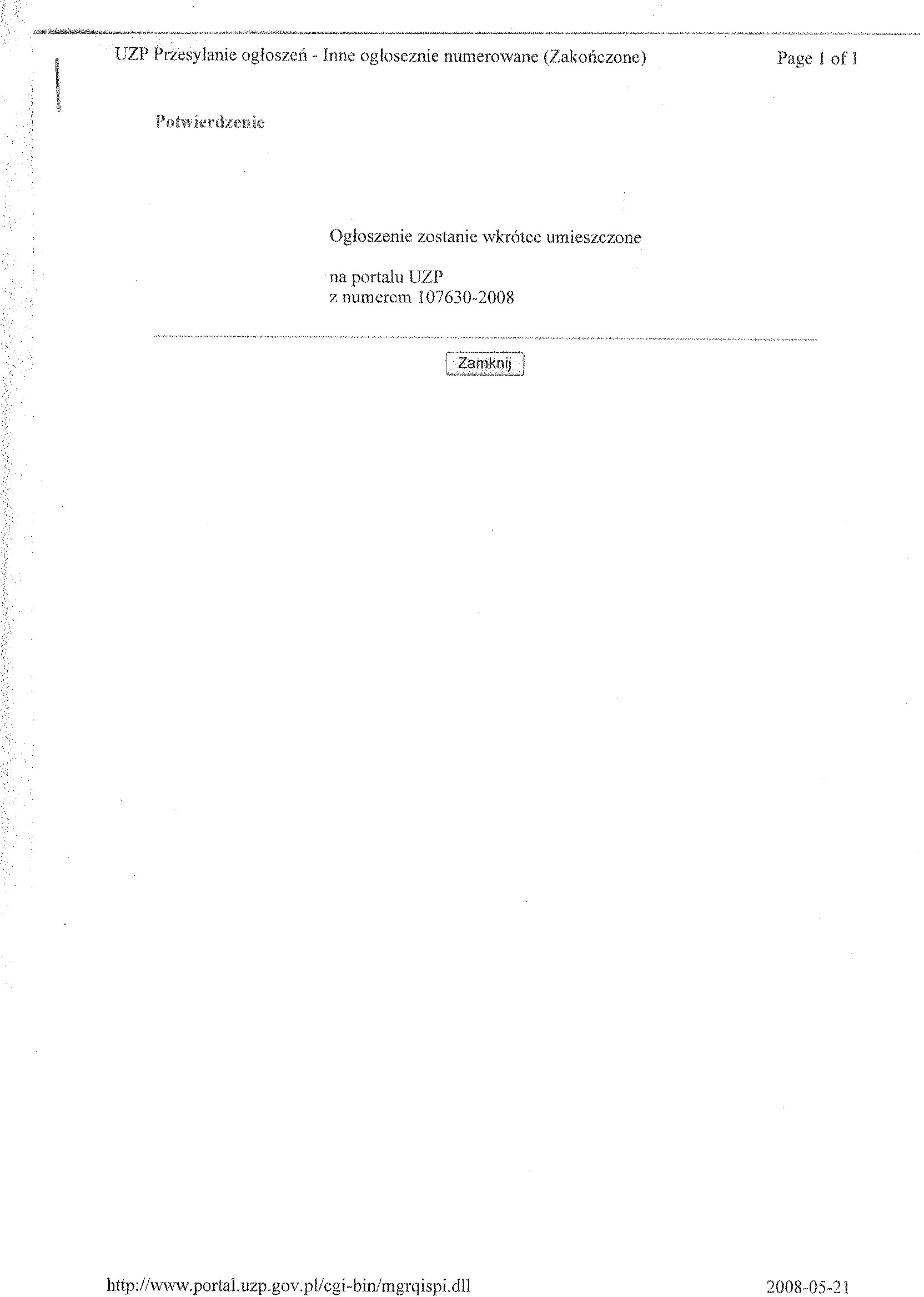 Numer og艂oszenia w BZP: 55506 聽- 2008; data zamieszczenia 18.03.2008 r. Zamieszczenie obowi膮zkowe Zam贸wienia publiczne 聽