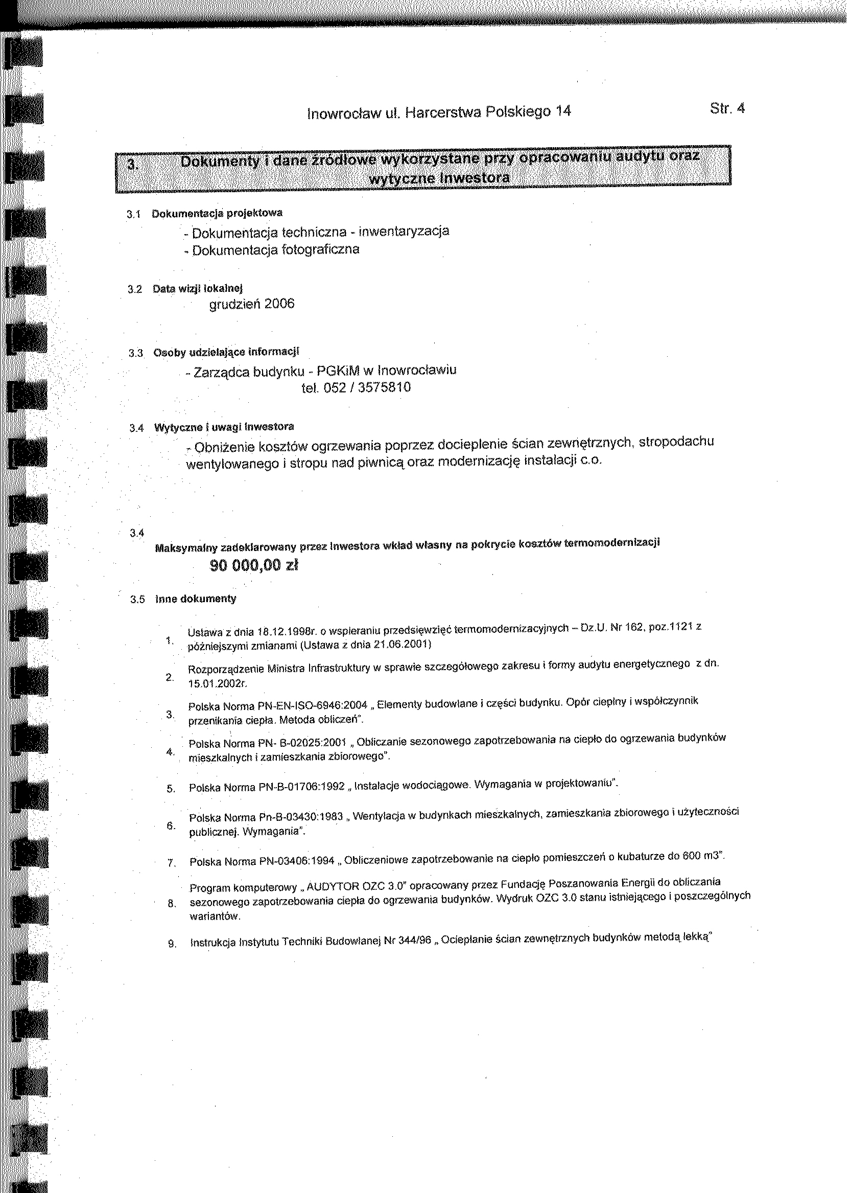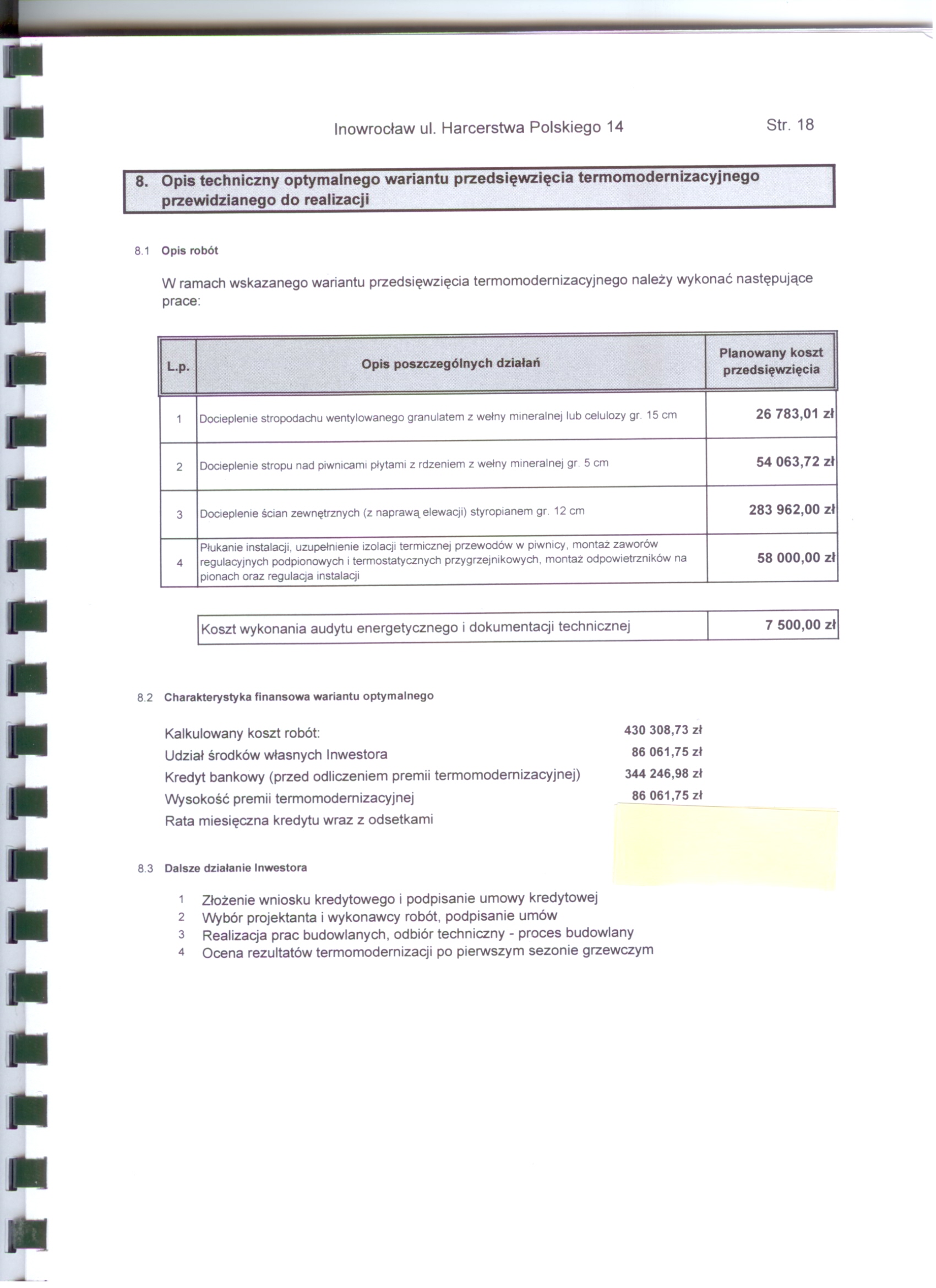 3. Przedmiotem zam贸wienia s膮: koszty 聽udzielonego kredytu na termomodernizacj臋 z premi膮 Banku Gospodarstwa Krajowego - dotycz膮cego budynku Wsp贸lnoty Mieszkaniowej 聽przy ulicy Harcerstwa Polskiego 14 w Inowroc艂awiu. 3.1. Warto艣膰 kredytu: 344.246,98 z艂. 3.2. Wsp贸lny S艂ownik Zam贸wie艅 (CPV): 66130000 - 0 |