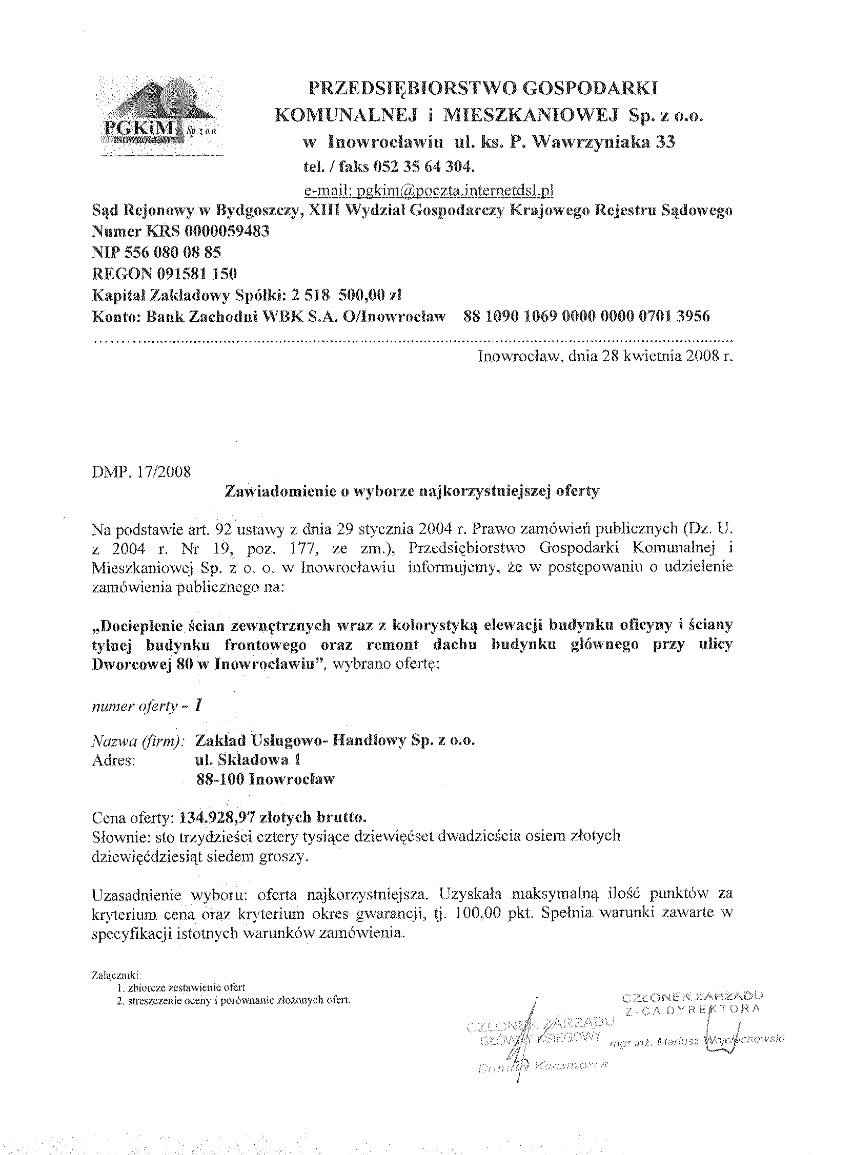 Numer og艂oszenia w BZP: 62575 聽- 2008; data zamieszczenia 28.03.2008 r. Zamieszczenie obowi膮zkowe Zam贸wienia publiczne 聽 1. Zamawiaj膮cy: 聽聽Wsp贸lnota Mieszkaniowa przy ulicy Dworcowej 80 w Inowroc艂awiu w imieniu i na rzecz kt贸rej dzia艂a na mocy umowy o administrowanie, Przedsi臋biorstwo Gospodarki Komunalnej i Mieszkaniowej Sp. z o.o. w Inowroc艂awiu, 聽 S膮d Rejonowy w Bydgoszczy, XIII Wydzia艂 Gospodarczy Krajowego Rejestru S膮dowego Numer KRS 0000059483 REGON: 091581150 NIP: 556-080-08-85 Kapita艂 Zak艂adowy Sp贸艂ki: 2聽518聽500, 00 z艂 Konto: Bank Zachodni WBK S. A.O/ Inowroc艂aw聽聽聽聽聽 88 1090 1069 0000 0000 0701 3956 聽