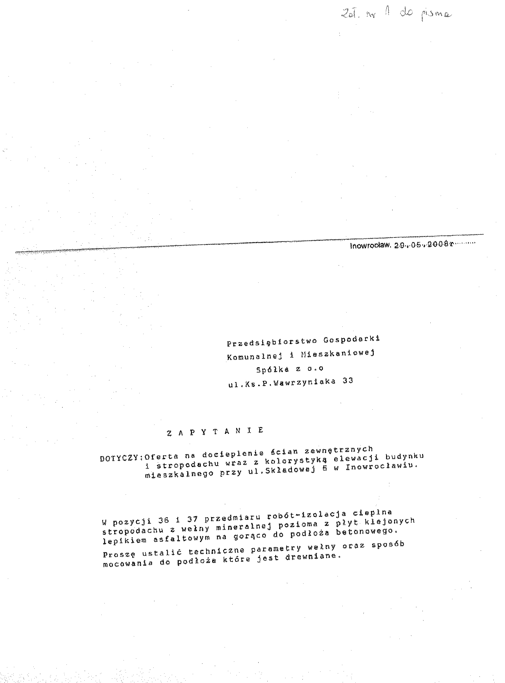 11. Op艂ata za otrzymanie specyfikacji istotnych warunk贸w zam贸wienia b臋dzie pokrywa膰 jedynie koszty jej druku oraz聽 przekazania. 12.Wykonawca zainteresowany post臋powaniem powinien z艂o偶y膰 wniosek u zamawiaj膮cego z podaniem wszystkich danych firmy -聽 niezb臋dnych do przekazywania zmian i zapyta艅 dotycz膮cych powy偶szego post臋powania. 聽 13. O udzielenie zam贸wienia mog膮 ubiega膰 si臋 wy艂膮cznie Wykonawcy, kt贸rzy: 1) posiadaj膮 uprawnienia do wykonywania okre艣lonej dzia艂alno艣ci lub czynno艣ci, je偶eli ustawy nak艂adaj膮 obowi膮zek posiadania takich uprawnie艅, 2) posiadaj膮 niezb臋dn膮 wiedz臋 i do艣wiadczenie oraz potencja艂 techniczny, a tak偶e dysponuj膮 osobami zdolnymi do wykonania zam贸wienia, 3) znajduj膮 si臋 w sytuacji ekonomicznej i finansowej zapewniaj膮cej wykonanie zam贸wienia, 4) nie podlegaj膮 wykluczeniu z post臋powania o udzielenie zam贸wienia. 聽 Zamawiaj膮cy oceni spe艂nienie warunk贸w wymienionych w niniejszym rozdziale na podstawie z艂o偶onych przez Wykonawc臋 do oferty, o艣wiadcze艅 i dokument贸w. Ocena spe艂niania warunk贸w dokonana zostanie na zasadzie: 聽聽聽聽聽聽聽聽聽聽聽聽聽聽聽聽聽聽聽聽聽聽聽聽聽聽聽聽聽聽聽聽聽聽聽聽聽聽聽聽聽聽 spe艂nia/ nie spe艂nia 聽 14. W celu potwierdzenia, 偶e Wykonawca posiada uprawnienie do wykonywania okre艣lonej dzia艂alno艣ci lub czynno艣ci oraz nie podlega wykluczeniu na podstawie art. 24 ustawy z dnia 29 stycznia 2004 r. - Prawo zam贸wie艅 publicznych, zamawiaj膮cy 偶膮da, nast臋puj膮cych dokument贸w: a) aktualnego odpisu z w艂a艣ciwego rejestru albo aktualnego za艣wiadczenia o wpisie do ewidencji dzia艂alno艣ci gospodarczej, je偶eli odr臋bne przepisy wymagaj膮 wpisu do rejestru lub zg艂oszenia do ewidencji dzia艂alno艣ci gospodarczej, wystawionego nie wcze艣niej ni偶 6 miesi臋cy przed up艂ywem terminu sk艂adania ofert; b) o艣wiadczenie wykonawcy, 偶e nie posiada zaleg艂o艣ci podatkowej wobec Naczelnika Urz臋du Skarbowego, c) o艣wiadczenie wykonawcy, 偶e nie posiada zaleg艂o艣ci wobec Zak艂adu Ubezpiecze艅 Spo艂ecznych w op艂acaniu sk艂adek na ubezpieczenie spo艂eczne, zdrowotne oraz Fundusz Pracy. 14.1.W celu potwierdzenia posiadania przez wykonawc臋 niezb臋dnej wiedzy i do艣wiadczenia oraz os贸b zdolnych do wykonania zam贸wienia, zamawiaj膮cy 偶膮da nast臋puj膮cych dokument贸w: a) wykazu wykonanych rob贸t budowlanych w okresie ostatniego 1 roku, przed dniem wszcz臋cia post臋powania o udzielenie zam贸wienia, z podaniem ich warto艣ci oraz daty i miejsca wykonania oraz za艂膮czeniem dokument贸w potwierdzaj膮cych, 偶e roboty te zosta艂y wykonane nale偶ycie, z艂. nr 2 do siwz (minimum 1 referencja), b) zamawiaj膮cy 偶膮da za艂膮czenia kserokopii uprawnie艅 budowlanych w specjalno艣ciach obj臋tych przedmiotem zam贸wienia, c) aktualnego wpisu do w艂a艣ciwych Izb Zawodowych. 14.2. W celu potwierdzenia, 偶e wykonawca znajduje si臋 w sytuacji ekonomicznej i finansowej zapewniaj膮cej wykonanie zam贸wienia zamawiaj膮cy 偶膮da nast臋puj膮cych dokument贸w: a) polisy, a w przypadku jej braku innego dokumentu potwierdzaj膮cego, 偶e wykonawca jest ubezpieczony od odpowiedzialno艣ci cywilnej w zakresie prowadzonej dzia艂alno艣ci. 14.3.Wype艂nione nast臋puj膮ce za艂膮czniki: a) formularz ofertowy wykonawcy (za艂. nr 1 do swiz). b) wykaz podobnych rob贸t (za艂. nr 2 do siwz), d) o艣wiadczenie w trybie art.22 ust.1 pkt.1-4聽 ustawy聽 Pzp (za艂. nr 3 do siwz). 14.4.Kosztorys ofertowy, kt贸ry musi by膰 integraln膮 cz臋艣ci膮 z艂o偶onej oferty. Podstaw膮 do opracowania przez Wykonawc臋聽 kosztorysu ofertowego jest聽 przedmiar rob贸t, b臋d膮cy za艂膮cznikiem do siwz. Wykonawca mo偶e przyj膮膰 dowoln膮 form臋 i podstaw臋 wyceny rob贸t. Zamawiaj膮cy wymaga, aby wykonawca w kosztorysie ofertowym聽 poda艂 w jakim systemie BSO wykonanie b臋dzie docieplenie. 聽 15. Miejsce i termin sk艂adania ofert: oferty nale偶y z艂o偶y膰 w sekretariacie Przedsi臋biorstwa Gospodarki Komunalnej i Mieszkaniowej Sp. z o.o., ul. ks. Piotra Wawrzyniaka 33, 88-100 Inowroc艂aw,聽 do dnia 10 czerwca 2008 r. godzina 9:50. 16. Kryteria wyboru ofert (w % ): 聽聽聽 聽a)聽 cena wykonania zam贸wienia聽聽聽聽聽聽聽聽聽聽聽聽聽聽 80 % 聽聽聽聽 b) gwarancja聽聽聽聽聽聽聽聽聽聽聽聽 聽聽聽聽聽聽聽聽聽聽聽聽聽聽聽聽聽聽聽聽聽聽聽聽聽聽聽聽聽聽聽20 % 17. Zamawiaj膮cy nie wymaga wadium. 18.Miejsce i termin otwarcia ofert: Przedsi臋biorstwo Gospodarki Komunalnej i Mieszkaniowej Sp. z o.o., ul. ks. Piotra Wawrzyniaka 33, 88-100 Inowroc艂aw, dnia 10 czerwca 2008 r. o godzinie 10:00 18.Termin zwi膮zania聽 ofert膮: 30 dni . 19. Zabezpieczenie nale偶ytego wykonania umowy (znwu) w wysoko艣ci 2 % od ustalonej warto艣ci zam贸wienia. 聽