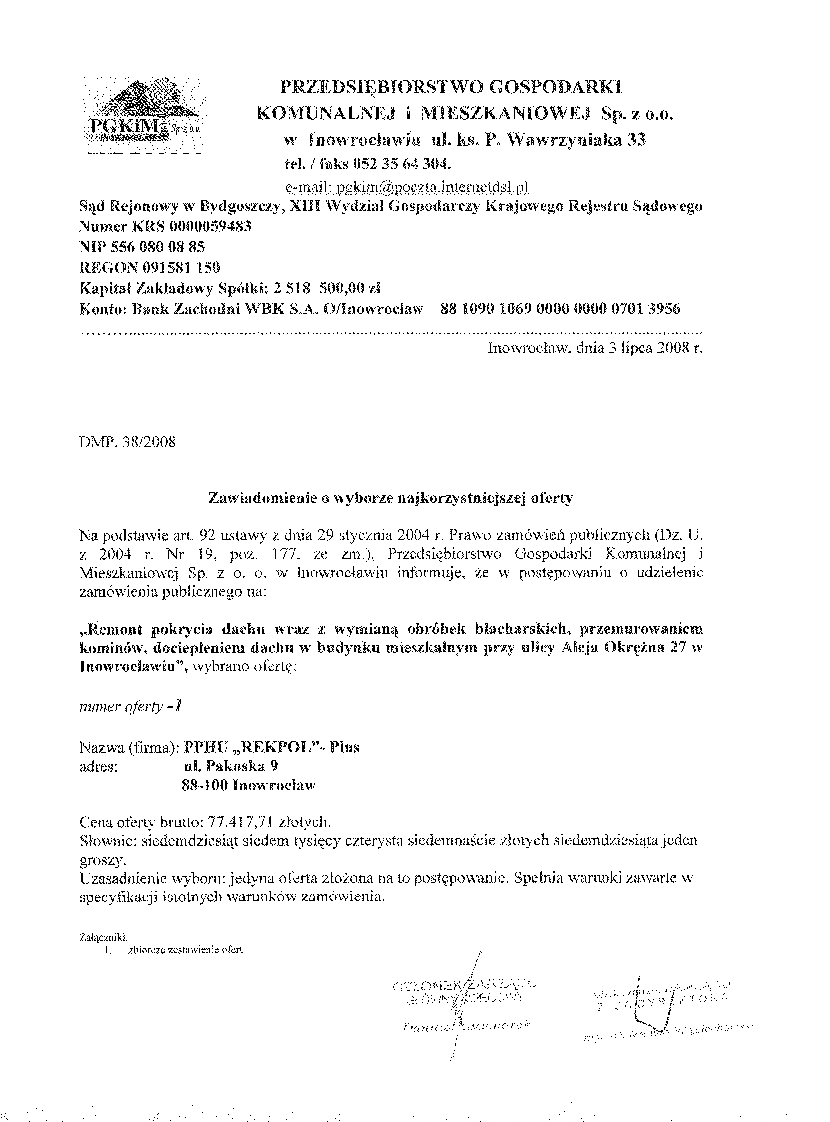 Numer og艂oszenia w BZP: 119401 - 2008; data zamieszczenia 04/06/2008 r. Zamieszczenie obowi膮zkowe Zam贸wienia publiczne 聽 1. Zamawiaj膮cy: 聽聽Wsp贸lnota Mieszkaniowa przy ulicy Aleja Okr臋偶na 27 w Inowroc艂awiu w imieniu i na rzecz kt贸rej dzia艂a na mocy umowy o administrowanie, Przedsi臋biorstwo Gospodarki Komunalnej i Mieszkaniowej Sp. z o.o. w Inowroc艂awiu, 聽 S膮d Rejonowy w Bydgoszczy, XIII Wydzia艂 Gospodarczy Krajowego Rejestru S膮dowego Numer KRS 0000059483 REGON: 091581150 NIP: 556-080-08-85 Kapita艂 Zak艂adowy Sp贸艂ki: 2聽518聽500, 00 z艂 Konto: Bank Zachodni WBK S. A.O/ Inowroc艂aw聽聽聽聽聽 88 1090 1069 0000 0000 0701 3956 聽