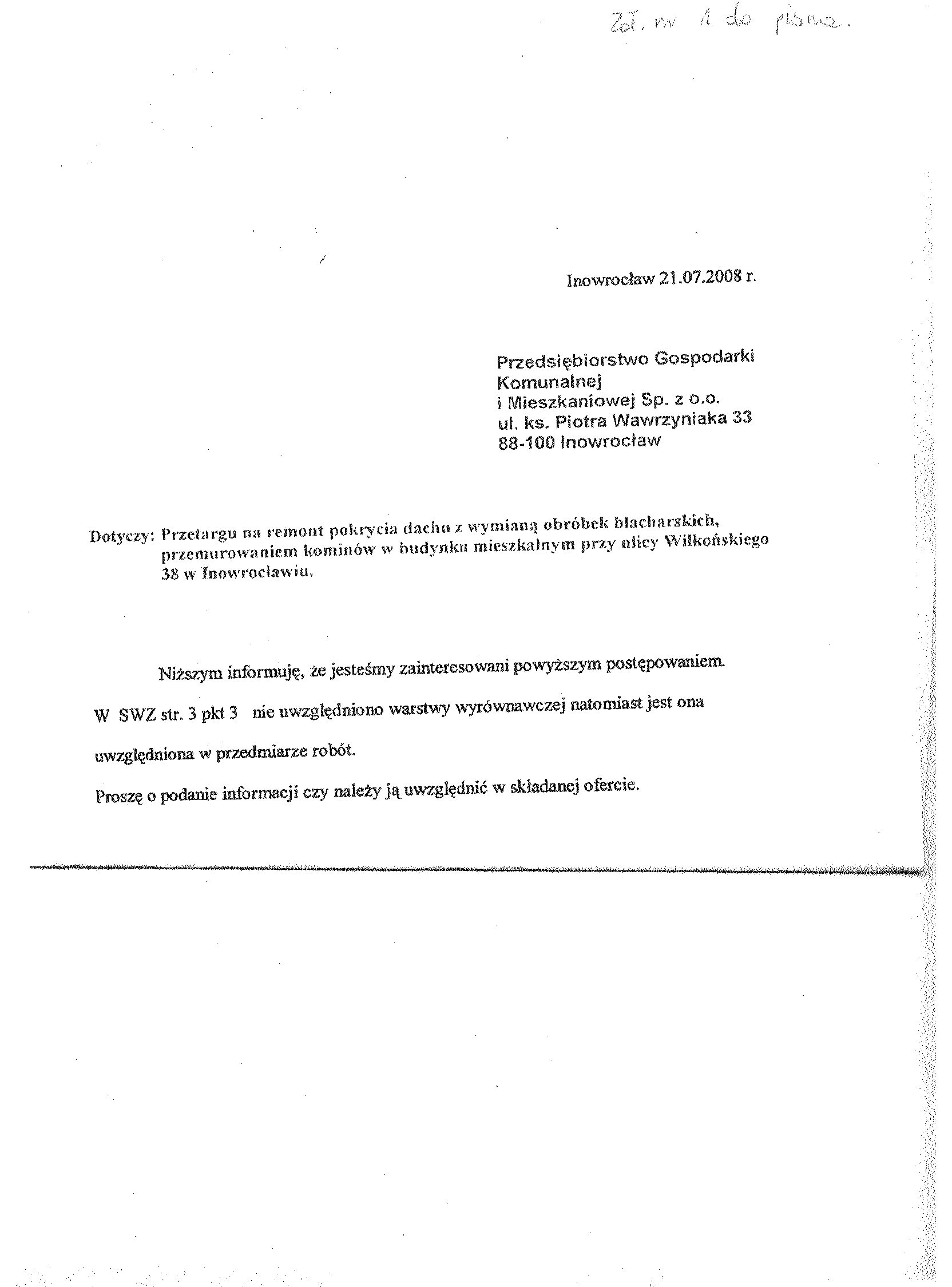 2. Rodzaj zam贸wienia: roboty budowlane 3. Tryb post臋powania: przetarg nieograniczony 4. Numer og艂oszenia w BZP: 150406 - 2008; data zamieszczenia 04/07/2008 r. 5. Okre艣lenie przedmiotu zam贸wienia: Tytu艂 post臋powania: "Remont pokrycia dachu z wymian膮 obr贸bek blacharskich, przemurowaniem komin贸w w budynku mieszkalnym przy ulicy Wilko艅skiego 38 w Inowroc艂awiu |