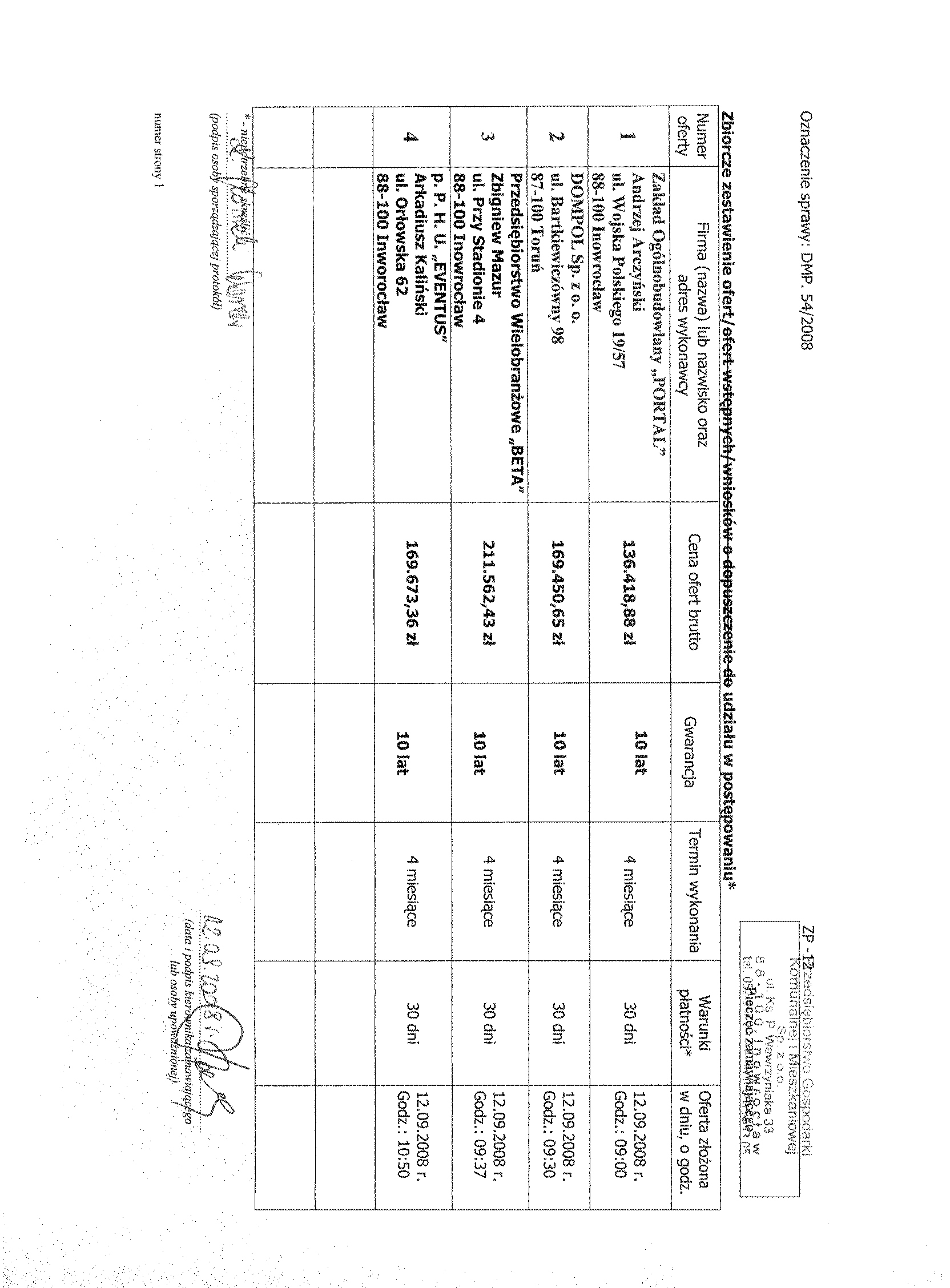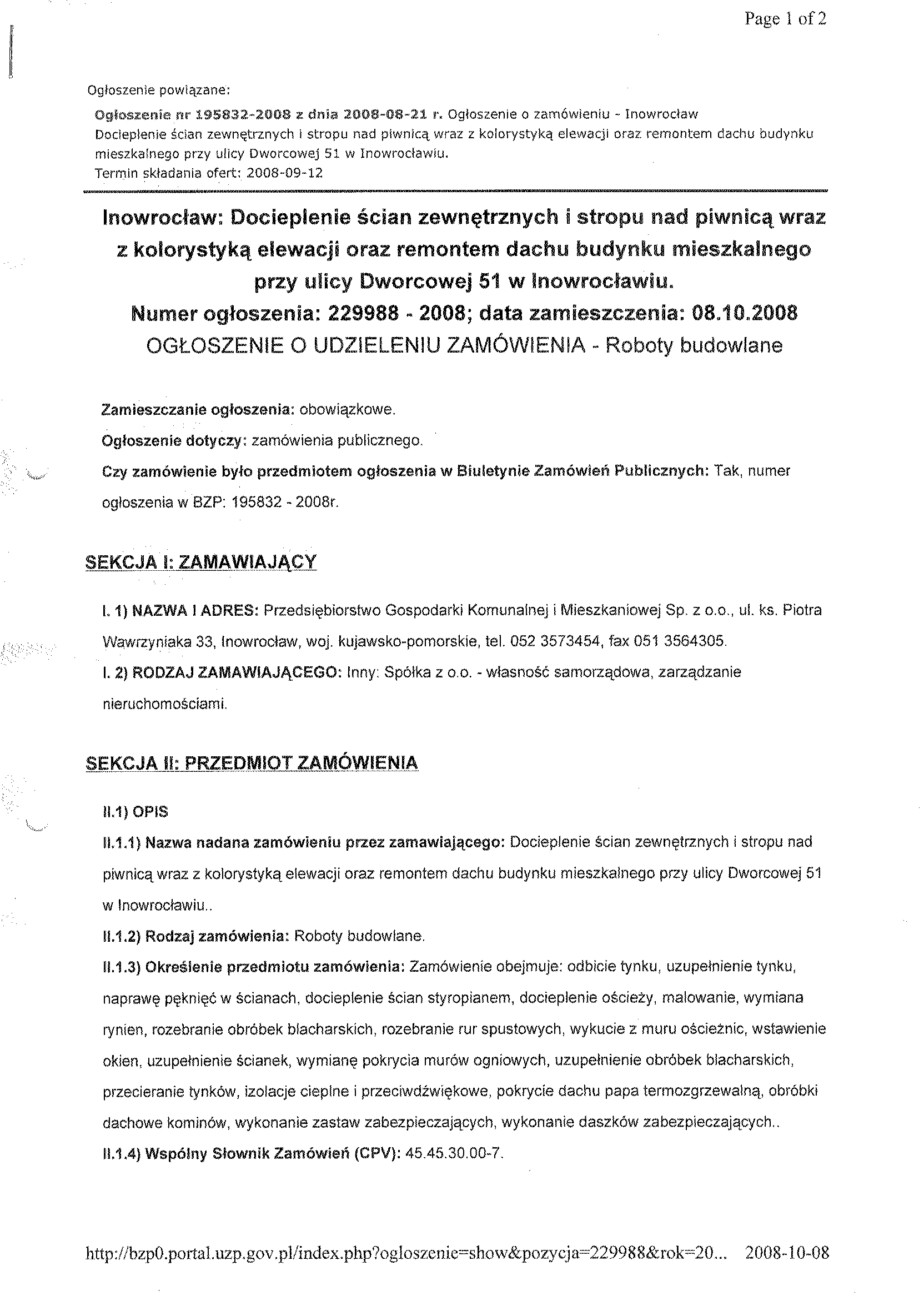 15. W celu potwierdzenia, 偶e Wykonawca posiada uprawnienie do wykonywania okre艣lonej dzia艂alno艣ci lub czynno艣ci oraz nie podlega wykluczeniu na podstawie art. 24 ustawy z dnia 29 stycznia 2004 r. - Prawo zam贸wie艅 publicznych, zamawiaj膮cy 偶膮da, nast臋puj膮cych dokument贸w: a) aktualnego odpisu z w艂a艣ciwego rejestru albo aktualnego za艣wiadczenia o wpisie do ewidencji dzia艂alno艣ci gospodarczej, je偶eli odr臋bne przepisy wymagaj膮 wpisu do rejestru lub zg艂oszenia do ewidencji dzia艂alno艣ci gospodarczej, wystawionego nie wcze艣niej ni偶 6 miesi臋cy przed up艂ywem terminu sk艂adania ofert: b) o艣wiadczenie wykonawcy, 偶e nie posiada zaleg艂o艣ci podatkowej wobec Naczelnika Urz臋du Skarbowego, c) o艣wiadczenie wykonawcy, 偶e nie posiada zaleg艂o艣ci wobec Zak艂adu Ubezpiecze艅 Spo艂ecznych w op艂acaniu sk艂adek na ubezpieczenie spo艂eczne, zdrowotne oraz Fundusz Pracy. 15.1.W celu potwierdzenia posiadania przez wykonawc臋 niezb臋dnej wiedzy i do艣wiadczenia oraz os贸b zdolnych do wykonania zam贸wienia, zamawiaj膮cy 偶膮da nast臋puj膮cych dokument贸w: a) wykazu wykonanych rob贸t budowlanych w okresie ostatniego 1 roku, przed dniem wszcz臋cia post臋powania o udzielenie zam贸wienia, z podaniem ich warto艣ci oraz daty i miejsca wykonania oraz za艂膮czeniem dokument贸w potwierdzaj膮cych, 偶e roboty te zosta艂y wykonane nale偶ycie, z艂. nr 2 do siwz (minimum 1 referencja), b) zamawiaj膮cy 偶膮da za艂膮czenia kserokopii uprawnie艅 budowlanych w specjalno艣ciach obj臋tych przedmiotem zam贸wienia, c) aktualnego wpisu do w艂a艣ciwych Izb Zawodowych. 15.2. W celu potwierdzenia, 偶e wykonawca znajduje si臋 w sytuacji ekonomicznej i finansowej zapewniaj膮cej wykonanie zam贸wienia zamawiaj膮cy 偶膮da nast臋puj膮cych dokument贸w: a) polisy, a w przypadku jej braku innego dokumentu potwierdzaj膮cego, 偶e wykonawca jest ubezpieczony od odpowiedzialno艣ci cywilnej w zakresie prowadzonej dzia艂alno艣ci. 15.3.Wype艂nione nast臋puj膮ce za艂膮czniki: a) formularz ofertowy wykonawcy (za艂. nr 1 do swiz). b) wykaz podobnych rob贸t (za艂. nr 2 do siwz), d) o艣wiadczenie w trybie art.22 ust.1 pkt.1-4 ustawy Pzp (za艂. nr 3 do siwz). 15.4.Kosztorys ofertowy, kt贸ry musi by膰 integraln膮 cz臋艣ci膮 z艂o偶onej oferty. Podstaw膮 do opracowania przez Wykonawc臋 kosztorysu ofertowego jest przedmiar rob贸t, b臋d膮cy za艂膮cznikiem do siwz. Wykonawca mo偶e przyj膮膰 dowoln膮 form臋 i podstaw臋 wyceny rob贸t. W kosztorysie ofertowym聽 Wykonawca musi poda膰 w jakim systemie BSO wykonanie b臋dzie docieplenie. Kosztorys z podliczeniem:聽 razem聽 koszty bezpo艣rednie, razem z narzutami, tabela element贸w. 16. Miejsce i termin sk艂adania ofert: oferty nale偶y z艂o偶y膰 w sekretariacie Przedsi臋biorstwa Gospodarki Komunalnej i Mieszkaniowej Sp. z o.o., ul. ks. Piotra Wawrzyniaka 33, 88-100 Inowroc艂aw, do dnia 12 wrze艣nia 2008 r. godzina 10:50.