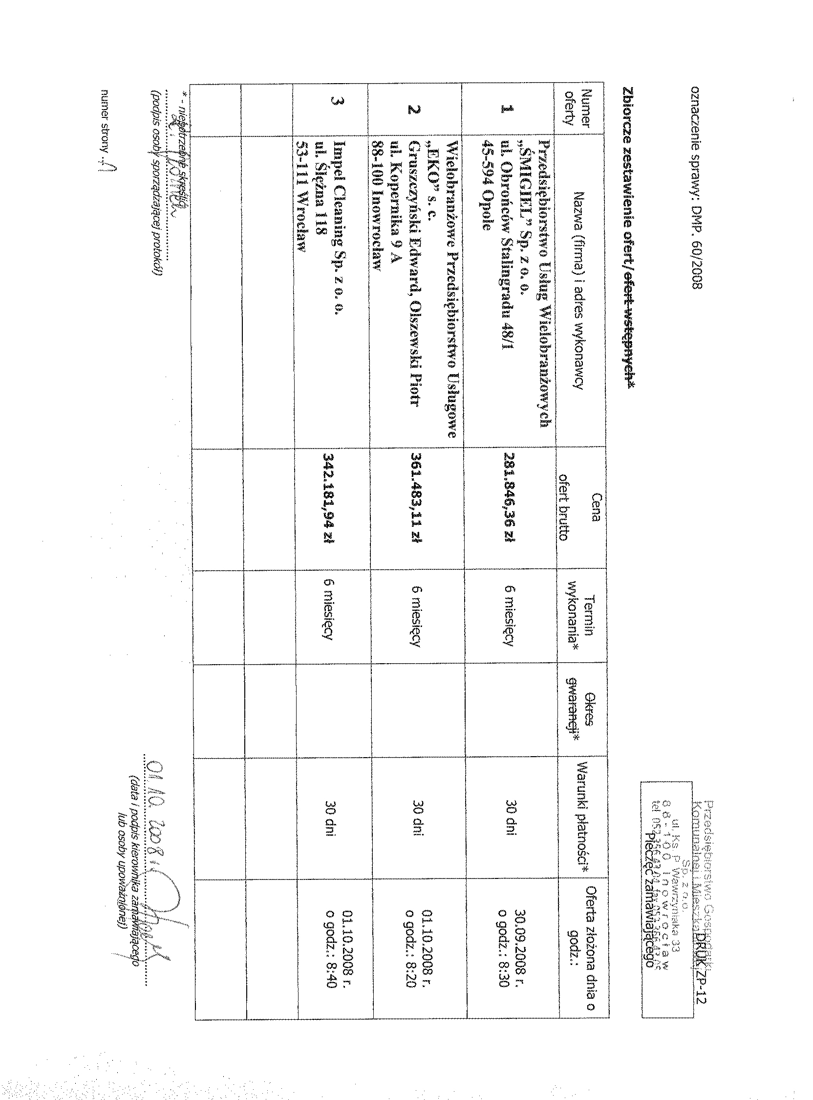 Numer sprawy: DMP. 60/2008聽聽聽聽聽聽聽聽聽聽聽聽聽聽聽聽聽聽聽聽聽聽聽聽聽聽聽聽聽聽聽聽 聽Inowroc艂aw, dnia 23 wrze艣nia 2008 r.聽聽 聽OG艁OSZENIE聽 O聽 WSZCZ臉CIU聽 POST臉POWANIA 聽 Numer og艂oszenia w BZP: 223976 - 2008, z dnia 23/09/2008 聽 Na stronie internetowej: 23/09/2008 Zamieszczenie obowi膮zkowe Zam贸wienia publiczne 1. Zamawiaj膮cy: Przedsi臋biorstwo Gospodarki Komunalnej i Mieszkaniowej Sp. z o.o. w Inowroc艂awiu, 聽 S膮d Rejonowy w Bydgoszczy, XIII Wydzia艂 Gospodarczy Krajowego Rejestru S膮dowego Numer KRS 0000059483 REGON: 091581150 NIP: 556-080-08-85 Kapita艂 Zak艂adowy Sp贸艂ki: 2聽518聽500, 00 z艂 Konto: Bank Zachodni WBK S. A.O/ Inowroc艂aw聽聽聽聽聽 88 1090 1069 0000 0000 0701 3956 Adres pocztowy: Ulica: ks. Piotra Wawrzyniaka 33 Kod: 88-100, Miejscowo艣膰: Inowroc艂aw Telefon / faks 052 35 64聽304 Adres strony internetowej: http://pgkim-inowroclaw.samorzady.pl e-mail: pgkim@poczta.internetdsl.pl聽 Rodzaj zamawiaj膮cego: Sp贸艂ka z o. o. - w艂asno艣膰 samorz膮dowa, zarz膮dzanie nieruchomo艣ciami 1.1. Osobami uprawnionymi do kontakt贸w z wykonawcami s膮: a) w cz臋艣ci formalnej zam贸wienia -聽 Krystyna Glonek, tel.052 35 64 304, b) w cz臋艣ci merytorycznej zam贸wienia - Zdzis艂awa Molenda, tel. 052聽357 42 78. 1.2. Op艂ata za otrzymanie specyfikacji istotnych warunk贸w zam贸wienia b臋dzie pokrywa膰 jedynie koszty jej druku oraz przekazania. 1.3. Wykonawca zainteresowany post臋powaniem powinien z艂o偶y膰 wniosek u zamawiaj膮cego z podaniem wszystkich danych firmy - niezb臋dnych do przekazywania zmian i zapyta艅 dotycz膮cych powy偶szego post臋powania. 2. Nazwa nadana zam贸wieniu: "Utrzymanie czysto艣ci, konserwacja zieleni oraz usuwanie skutk贸w zimy na terenach oraz w budynkach komunalnych, prywatnych, u偶ytkowych administrowanych przez Przedsi臋biorstwo Gospodarki Komunalnej i Mieszkaniowej Sp. z o. o. w Inowroc艂awiu". Rodzaj zam贸wienia: us艂uga 2.1. Przedmiotem zam贸wienia jest: sprz膮tanie powierzchni wewn臋trznych budynk贸w: tj. klatek schodowych, piwnic, strych贸w - z pomieszcze艅 i urz膮dze艅 budynk贸w wielolokalowych przeznaczonych do wsp贸lnego u偶ytku. Sprz膮tanie powierzchni zewn臋trznych: tj. chodnik贸w, wjazd贸w, podw贸rek, piel臋gnacja ziele艅c贸w na terenie nieruchomo艣ci, sprz膮tanie podjazd贸w dla os贸b niepe艂nosprawnych, sprz膮tanie miejsc wok贸艂 urz膮dze艅 do zbierania odpad贸w lub os艂on 艣mietnikowych. Sprz膮tanie biur.聽Sprz膮tanie (wygrabienie) wiosenne teren贸w z li艣ci, a tak偶e w okresie jesiennym usuwanie na bie偶膮co opad艂ych li艣ci. Od艣nie偶anie w okresie zimowym: chodnik贸w wzd艂u偶 budynk贸w, wjazd贸w, dojazd贸w i doj艣膰 do 艣mietnik贸w, podjazd贸w dla os贸b niepe艂nosprawnych, na posesjach i nieruchomo艣ciach, usuwanie nawis贸w (sopli) z okap贸w, rynien i innych cz臋艣ci elewacji budynku.聽Powierzchnie obj臋te zam贸wieniem to ok. 150.000 m |