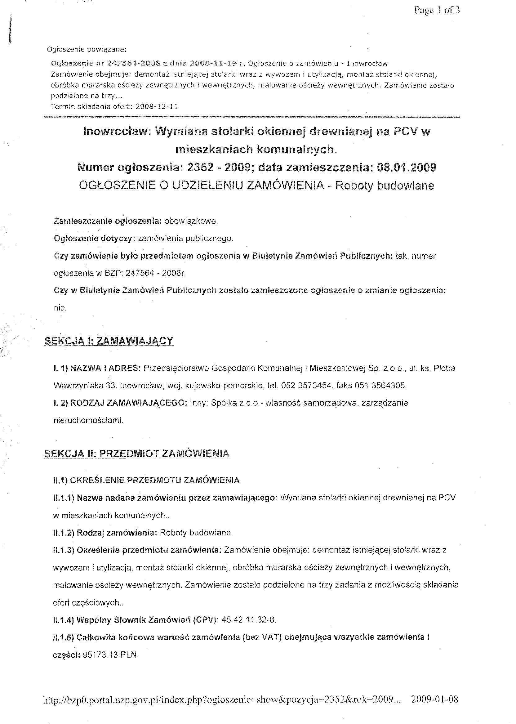 Numer og艂oszenia w BZP: 247564 - 2008; data zamieszczenia 19/11//2008 Na stronie internetowej: 19/11/2008 聽