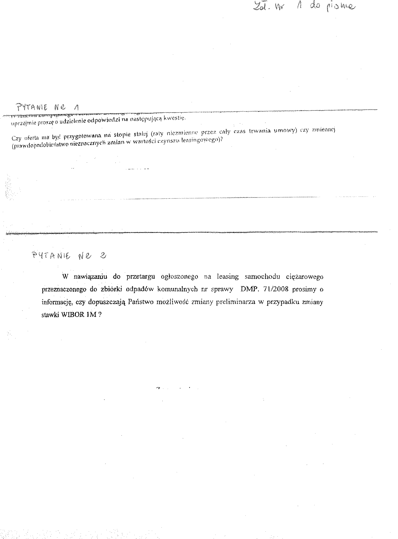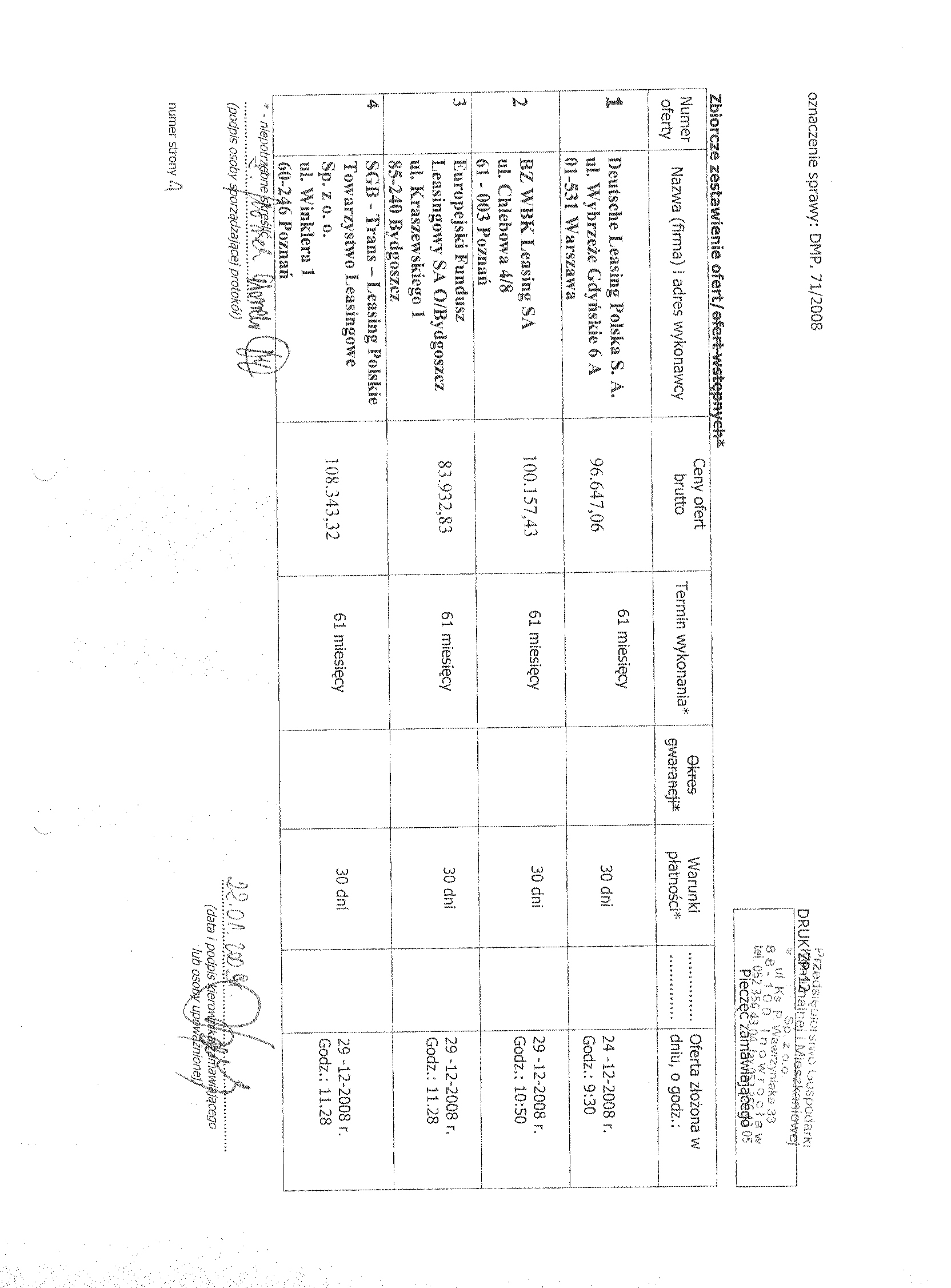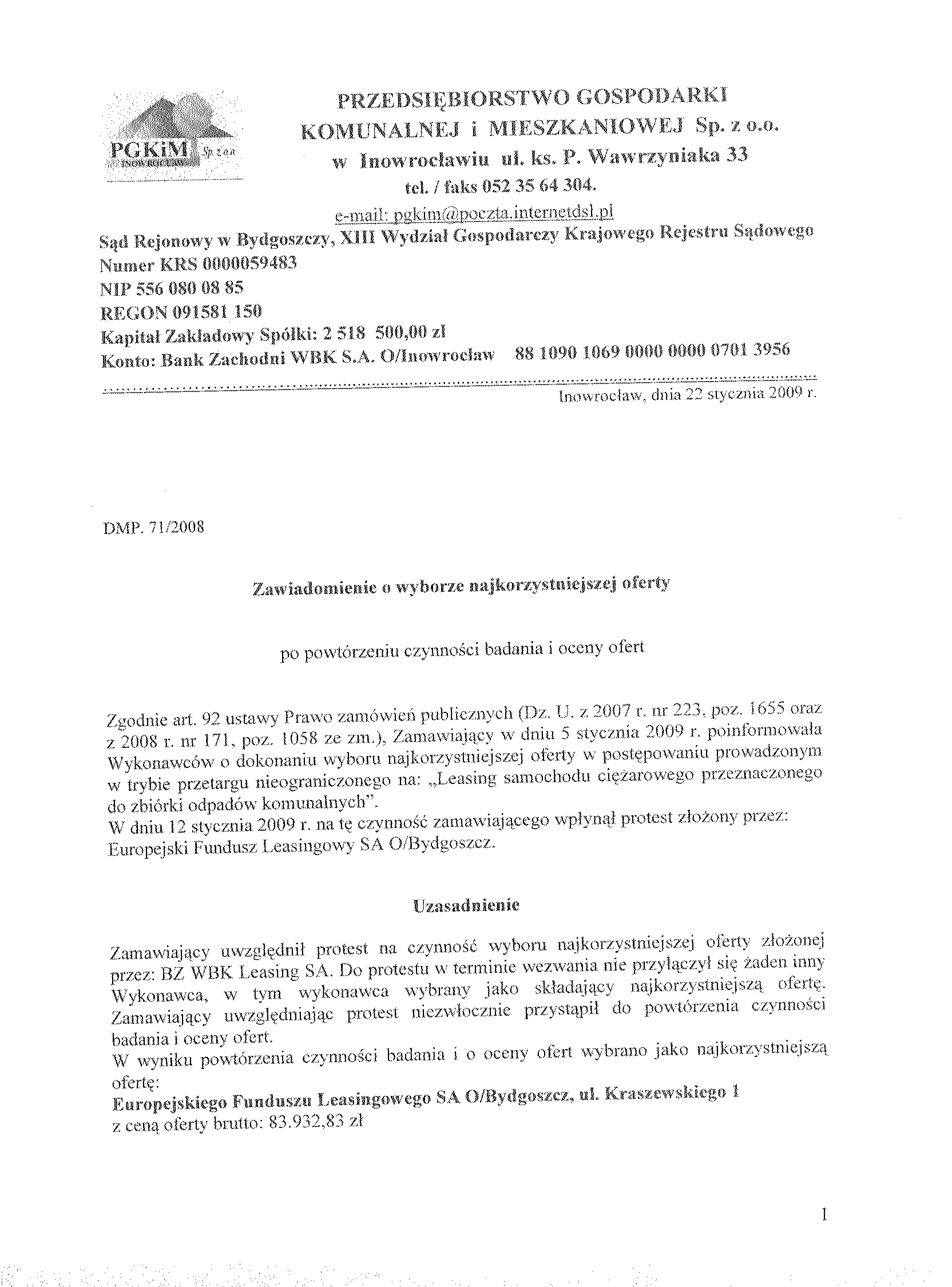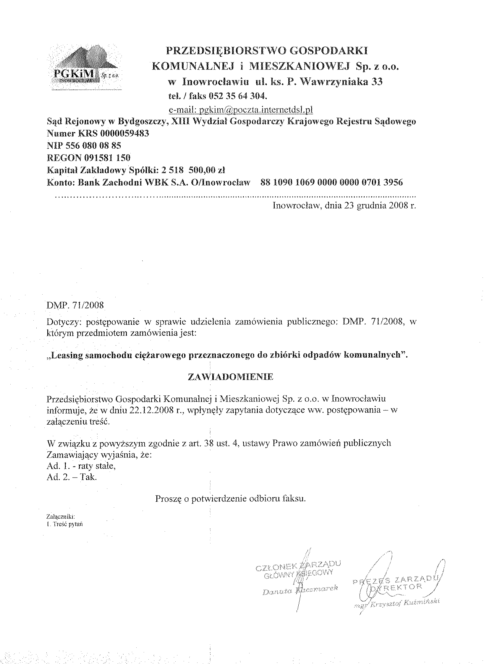 14. Kryteria oceny ofert: suma op艂at leasingowych - 100 % 15. Zamawiaj膮cy nie wymaga wadium. 16. Miejsce i termin otwarcia ofert: Przedsi臋biorstwo Gospodarki Komunalnej i Mieszkaniowej Sp. z o.o., ul. ks. Piotra Wawrzyniaka 33, 88-100 Inowroc艂aw dnia 29 grudnia 2008 r. o godz. 12.00 (salka konferencyjna).
