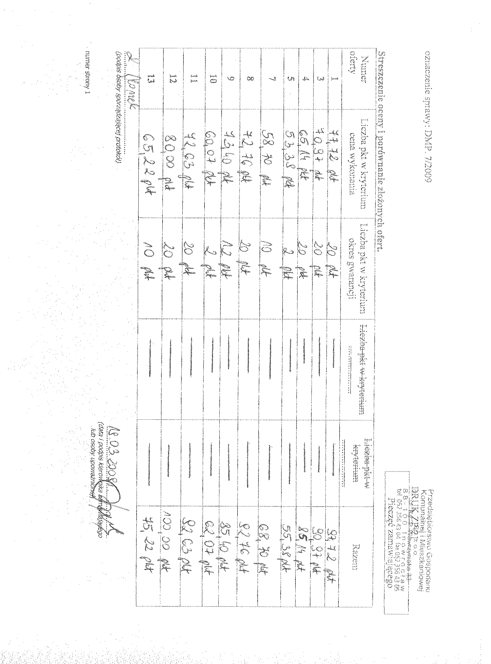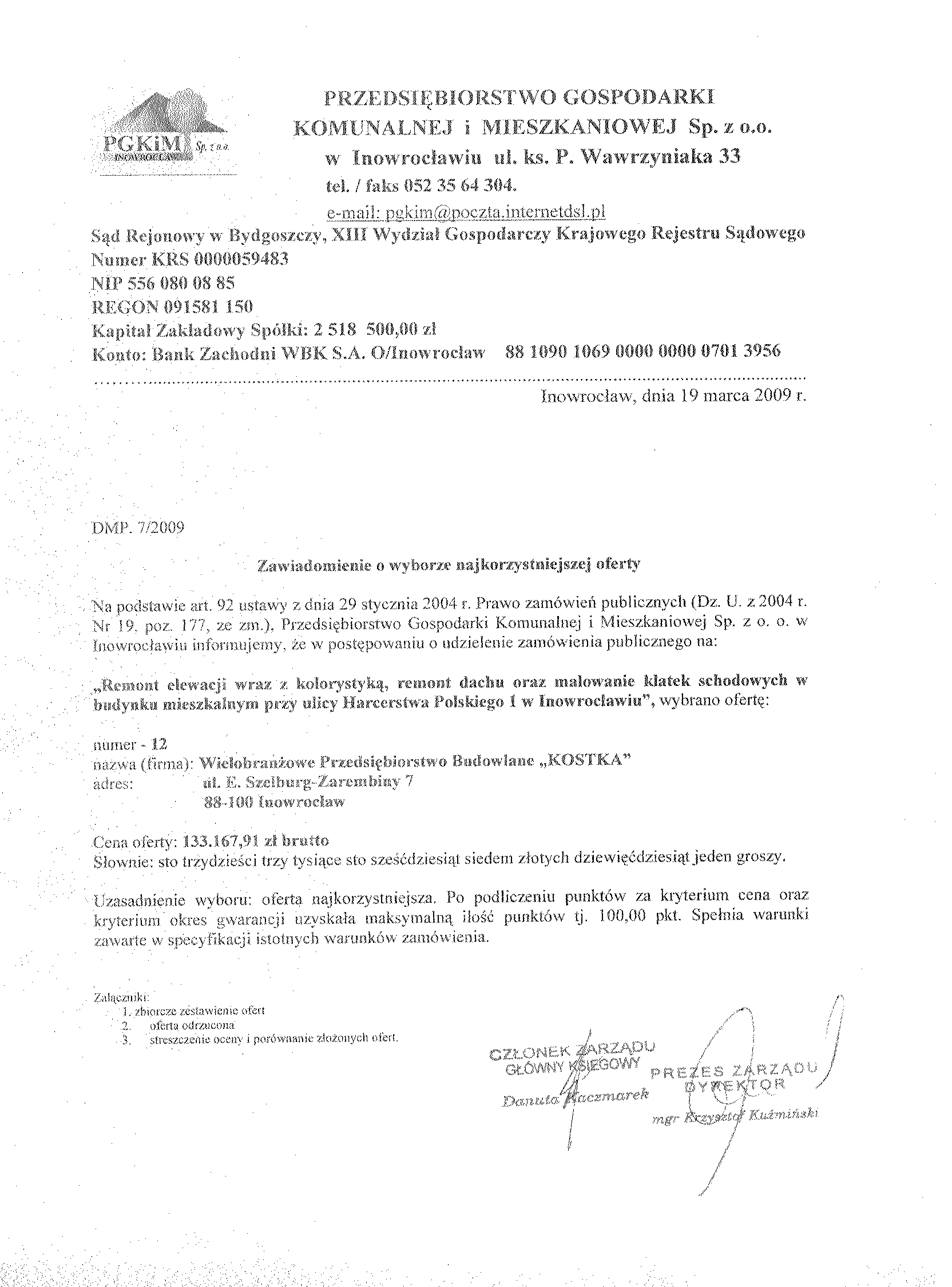 13. Miejsce i termin sk艂adania ofert: oferty nale偶y z艂o偶y膰 w sekretariacie Przedsi臋biorstwa Gospodarki Komunalnej i Mieszkaniowej Sp. z o.o., ul. ks. Piotra Wawrzyniaka 33, 88-100 Inowroc艂aw,聽 do dnia 11 marca 2009 r. do godziny 9:50. 聽 14. Kryteria wyboru ofert: 聽聽聽 聽a)聽 cena wykonania zam贸wienia聽聽聽聽 80 聽聽聽聽 b) gwarancja聽聽聽聽聽聽聽聽聽聽聽聽 聽聽聽聽聽聽聽聽聽聽聽聽20 聽