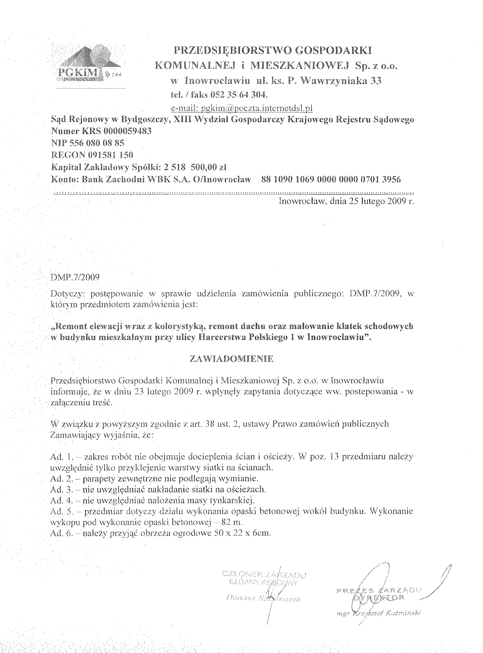 聽 Ulica: ks. Piotra Wawrzyniaka 33 Miejscowo艣膰:聽聽聽聽聽聽聽聽聽聽 Kod pocztowy:聽聽聽聽聽聽聽聽聽聽聽聽聽聽聽聽聽聽聽聽 Wojew贸dztwo: Inowroc艂aw聽聽聽聽聽聽聽聽聽聽聽聽聽 88 - 100聽聽聽聽聽聽聽聽聽聽聽聽聽聽聽聽聽聽聽聽聽聽聽聽聽聽聽聽聽聽 kujawsko - pomorskie 聽 S膮d Rejonowy w Bydgoszczy, XIII Wydzia艂 Gospodarczy Krajowego Rejestru S膮dowego Numer KRS 0000059483 REGON: 091581150 NIP: 556-080-08-85 Kapita艂 zak艂adowy Sp贸艂ki: 2聽518聽500, 00 z艂 Konto: Bank Zachodni WBK S. A.O/ Inowroc艂aw聽聽聽聽聽 88 1090 1069 0000 0000 0701 3956 聽 2. Tryb post臋powania: przetarg nieograniczony Rodzaj zam贸wienia: robota budowlana 聽 Wsp贸lny S艂ownik Zam贸wie艅 CPV: 45.45.30.00 - 7, 45.44.30.00 - 4, 45.26.12.00 - 6, 45.44.00.00 - 3. 聽