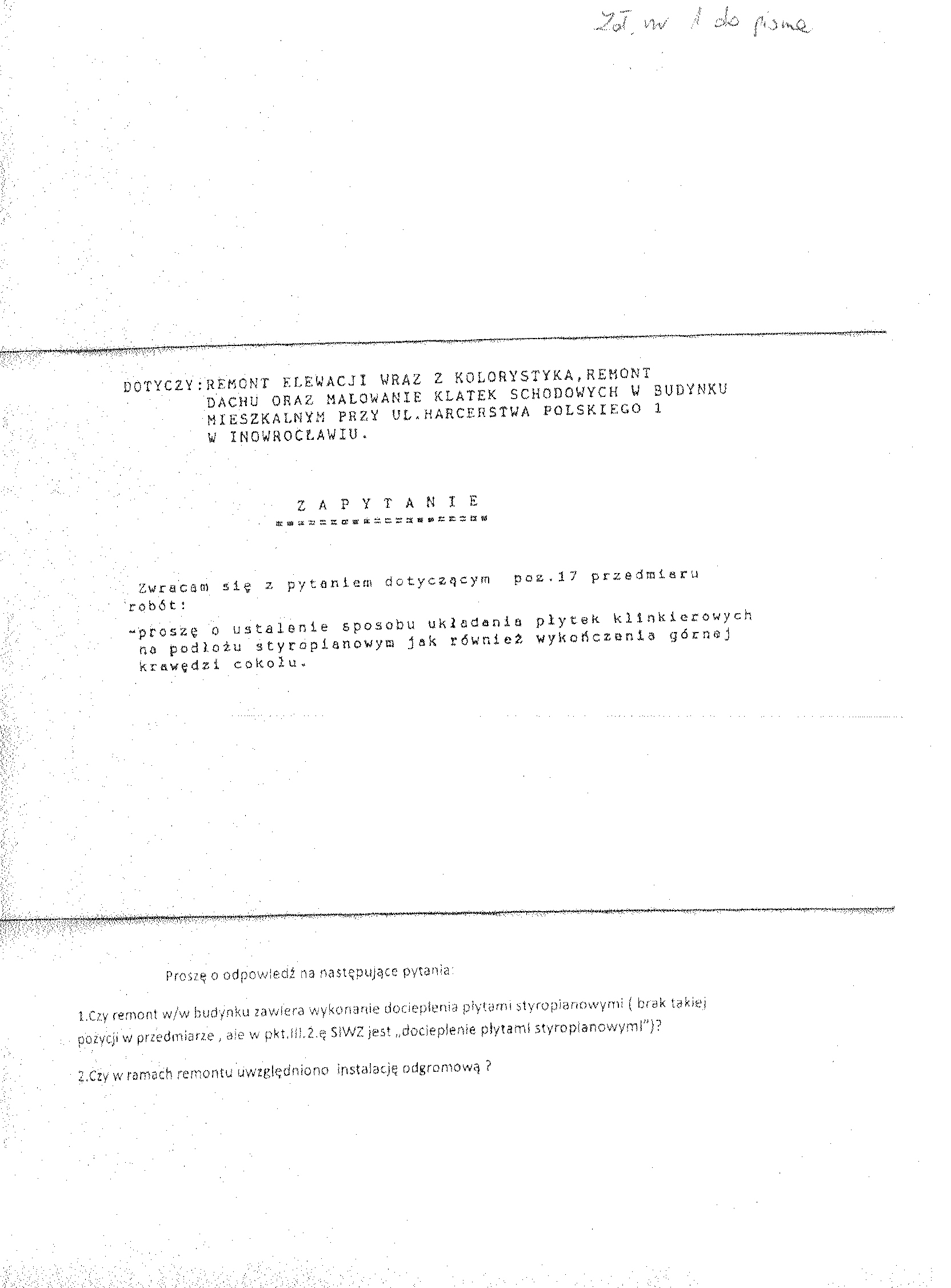 4. Okre艣lenie przedmiotu zam贸wienia Nazwa nadana zam贸wieniu: "Remont elewacji wraz z kolorystyk膮, remont dachu oraz malowanie klatek schodowych w budynku mieszkalnym przy ulicy Harcerstwa Polskiego 1 w Inowroc艂awiu". 聽 Zam贸wienie obejmuje: postawienie rusztowa艅, wywiezienie gruzu, wykonanie daszk贸w ochronnych nad przej艣ciami, odgrzybianie 艣cian, uzupe艂nienie tynk贸w, przyklejenie siatki, malowanie elewacji, ocieplenie 艣cian budynku p艂ytami styropianowymi, rozebranie rur spustowych, licowanie p艂ytkami klinkierowymi, ochron臋 naro偶nik贸w, rozbi贸rk臋 pokrycia dachu, wymian臋 艂acenia dachu, pokrycie dachu dach贸wk膮, wymian臋 w艂az贸w kominowych, wymian臋 pokrycia mur贸w ogniowych, wykonanie rynien dachowych, wykonanie izolacji cieplnej, przeciwd藕wi臋kowej i przeciwwilgociowej, mechaniczn膮 rozbi贸rk臋 nawierzchni bitumicznej, r臋czne rozebranie podbudowy betonowej, r臋czne kopanie row贸w, wykonanie podsypki piaskowej, wykonanie opaski betonowej, rozbi贸rk臋 czapek kominowych, przemurowanie komin贸w, wykonanie tynk贸w, uzupe艂nienie czapek kominowych i 艂aw kominiarskich, wykonanie pomost贸w na dachu, zeskrobanie i zmycie starej farby, malowanie farbami emulsyjnymi 艣cian klatek schodowych, wykucie z muru o艣cie偶nic, wstawienie okien w pralni i suszarni. 聽 5. Nie dopuszcza si臋 sk艂adania ofert cz臋艣ciowych. 6. Nie dopuszcza si臋 sk艂adania ofert wariantowych. 7. Zamawiaj膮cy nie przewiduje zawarcia umowy ramowej, jak r贸wnie偶 nie dokona wyboru oferty najkorzystniejszej z zastosowaniem aukcji elektronicznej. 8. Zamawiajacy nie przewiduje mo偶liwo艣ci ustanowienia dynamicznego systemu zakup贸w. 聽 9. Osobami uprawnionymi do kontakt贸w z wykonawcami s膮: a) w cz臋艣ci formalnej zam贸wienia - Krystyna Glonek, tel.052 35 - 64 - 304, b) w cz臋艣ci merytorycznej zam贸wienia - Anna Nawrocka, tel. 052 35 64聽325. 聽 10. Po偶膮dany termin realizacji zam贸wienia: 4 miesi膮ce od podpisania umowy. 聽