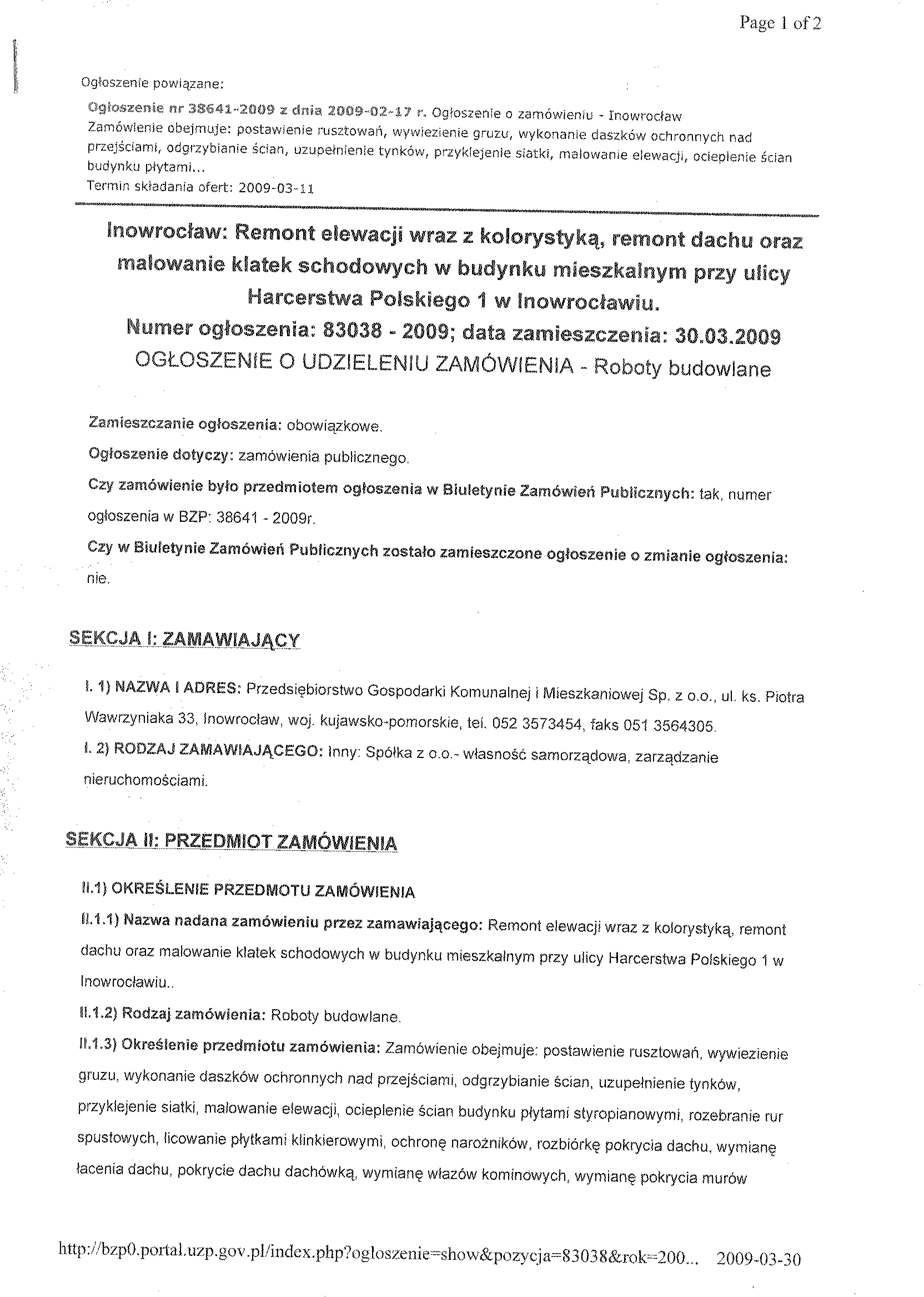 Numer og艂oszenia w BZP: 38641- 2009; data zamieszczenia 17/02/2009 r. 聽
