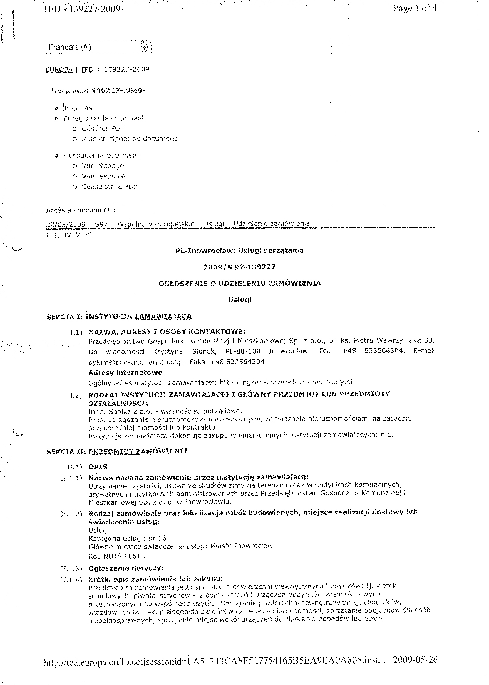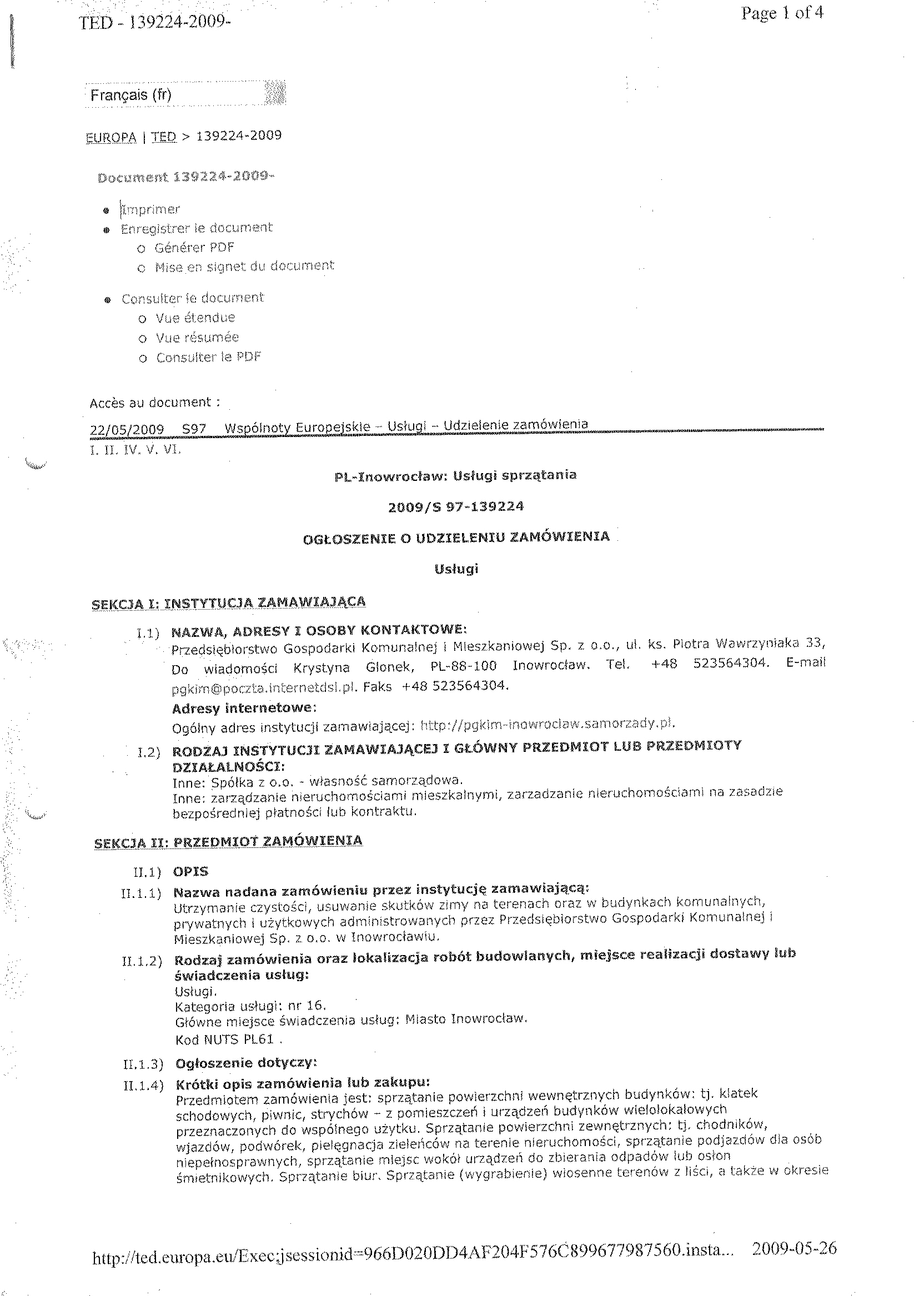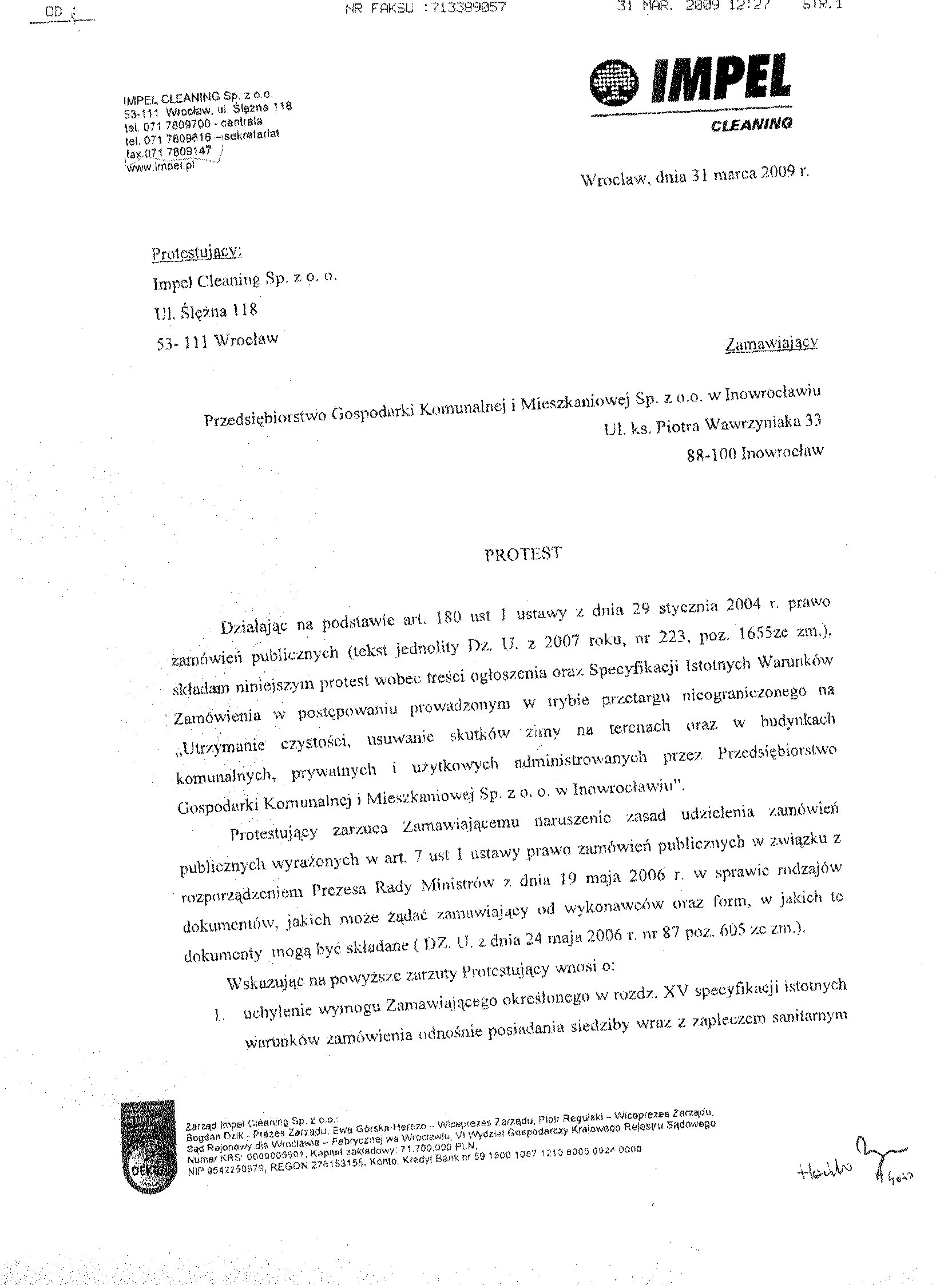 Numer og艂oszenia w WE: S 52- 075253 - 2009, z dnia 17.03.2009 r. W BZP pod numerem 50957- 2009, z dnia 17.03.2009 r. Na stronie internetowej: 17.03.2009 r. Przys艂uguje odwo艂anie 聽 1. Zamawiaj膮cy: Przedsi臋biorstwo Gospodarki Komunalnej i Mieszkaniowej Sp. z o.o. w Inowroc艂awiu, S膮d Rejonowy w Bydgoszczy, XIII Wydzia艂 Gospodarczy Krajowego Rejestru S膮dowego Numer KRS 0000059483 REGON: 091581150 NIP: 556-080-08-85 Kapita艂 Zak艂adowy Sp贸艂ki: 2聽518聽500, 00 z艂 Konto: Bank Zachodni WBK S. A.O/ Inowroc艂aw聽聽聽聽聽 88 1090 1069 0000 0000 0701 3956