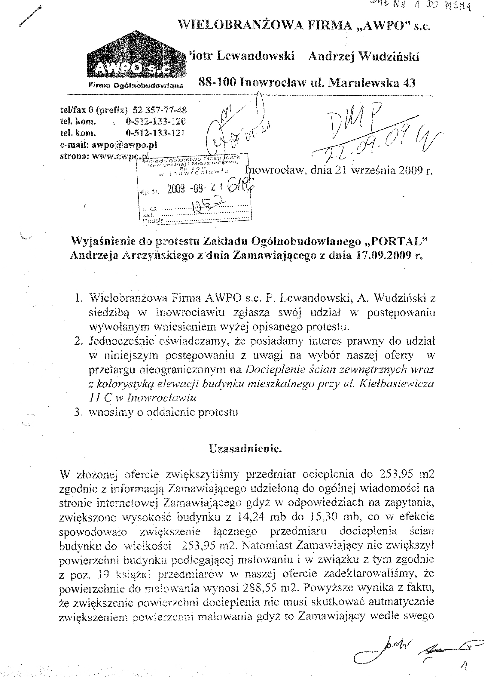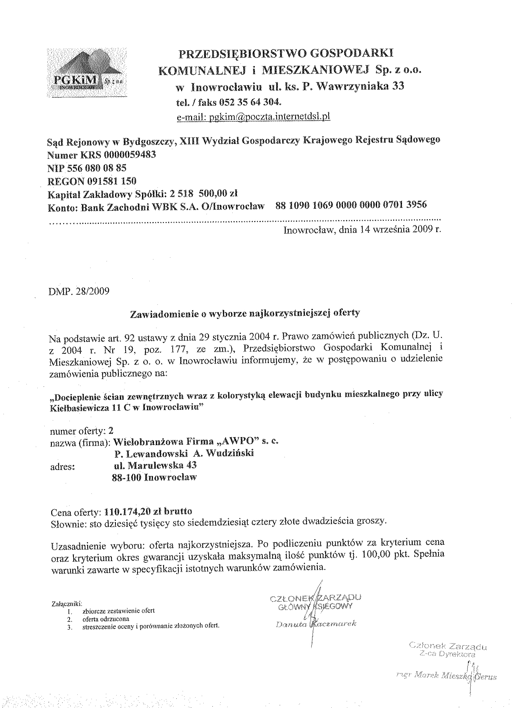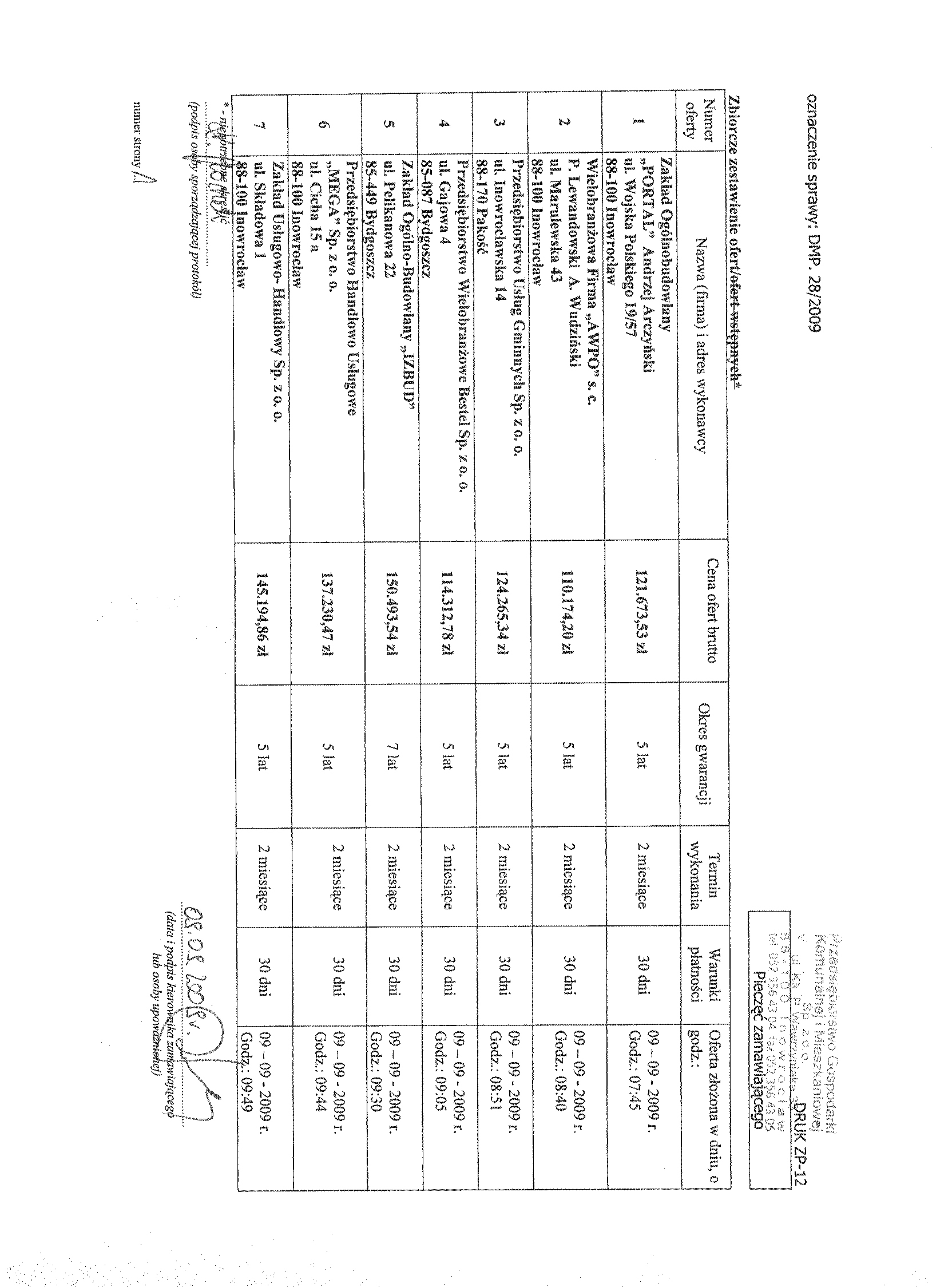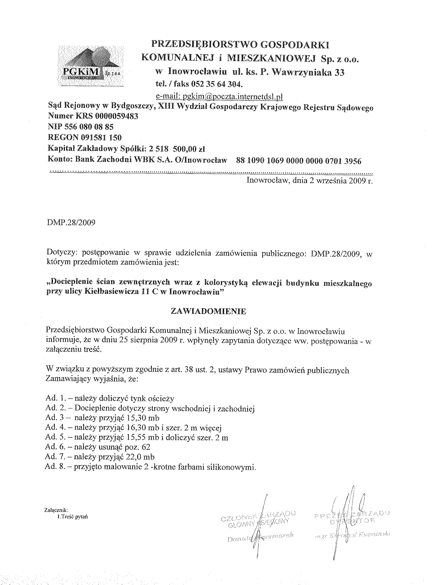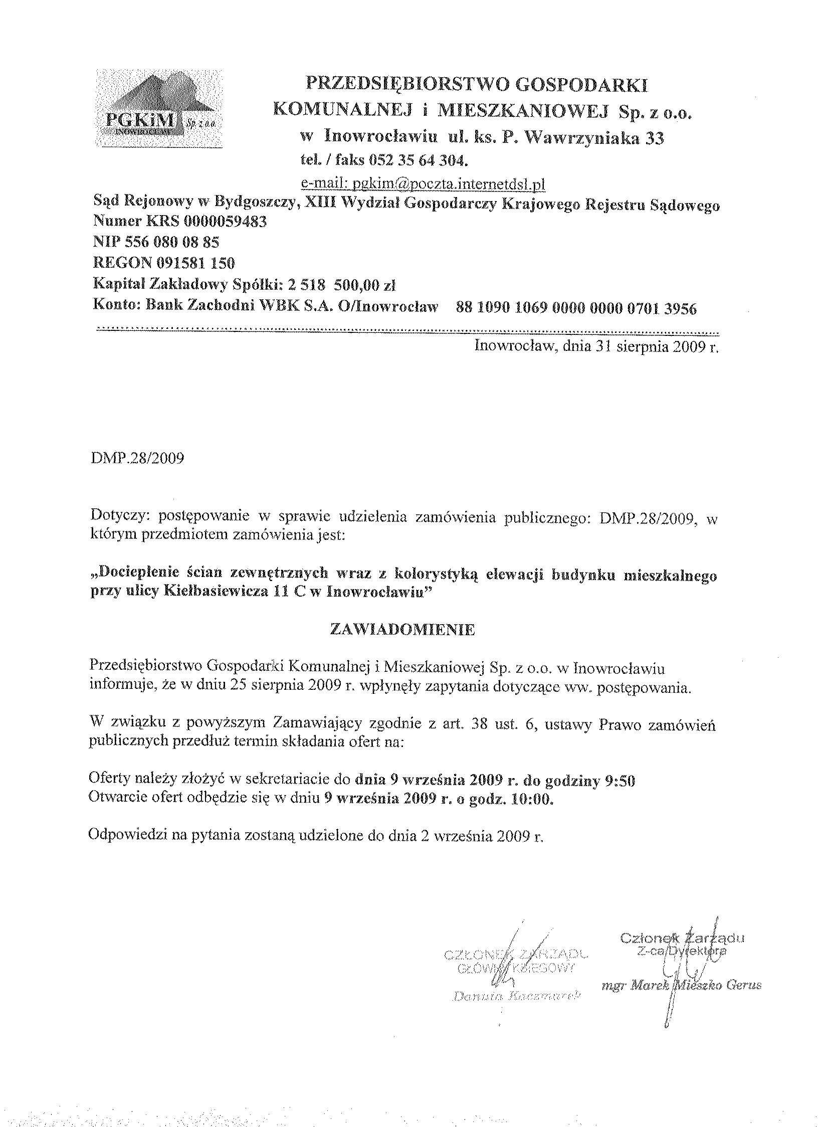 聽 11. Miejsce i termin sk艂adania ofert: Przedsi臋biorstwo Gospodarki Komunalnej i Mieszkaniowej Sp. z o.o., ul. ks. Piotra Wawrzyniaka 33, 88-100 Inowroc艂aw, sekretariat 1 pi臋tro, do dnia 1 wrze艣nia 2009 r. do godziny 9.50.