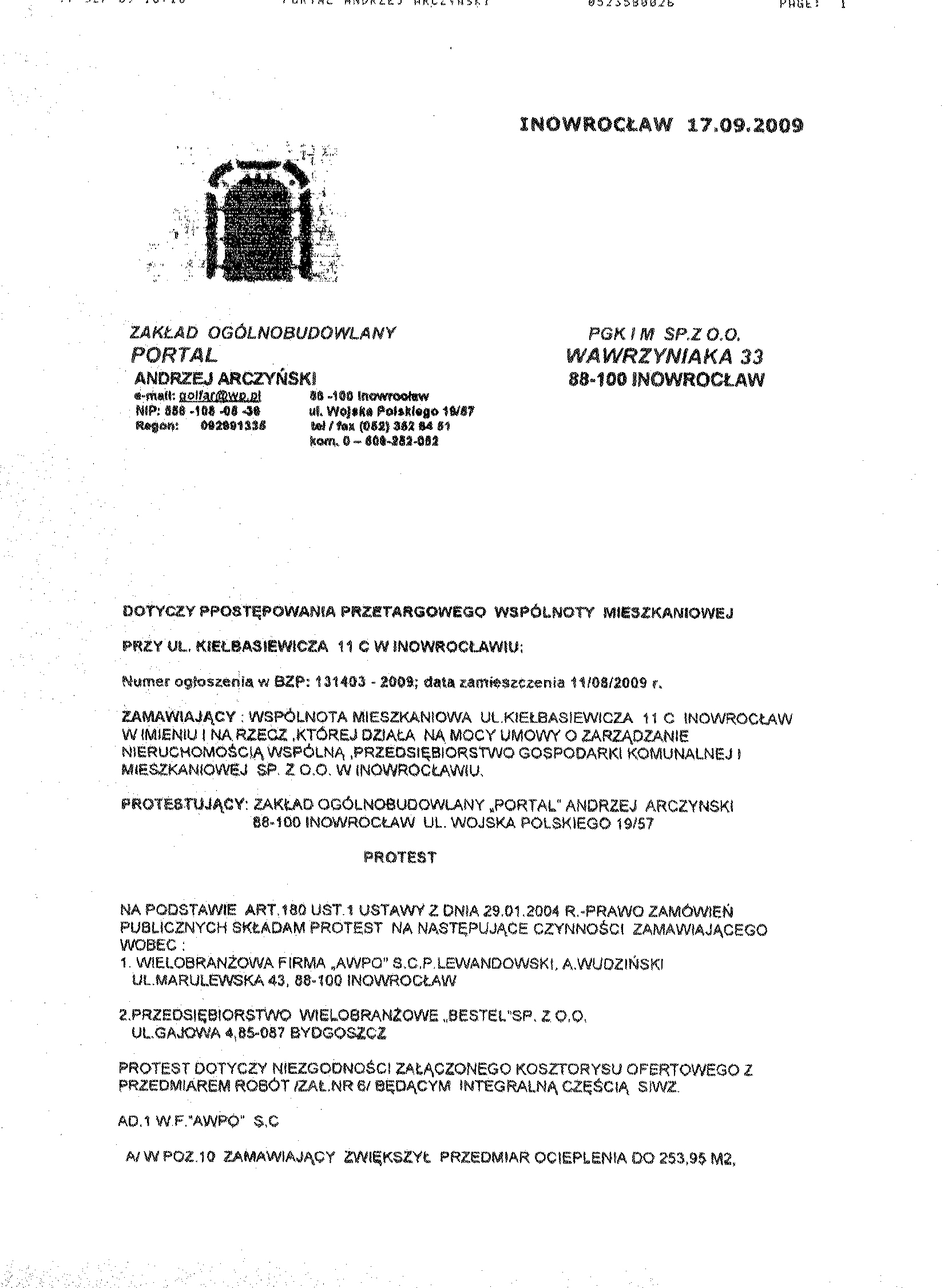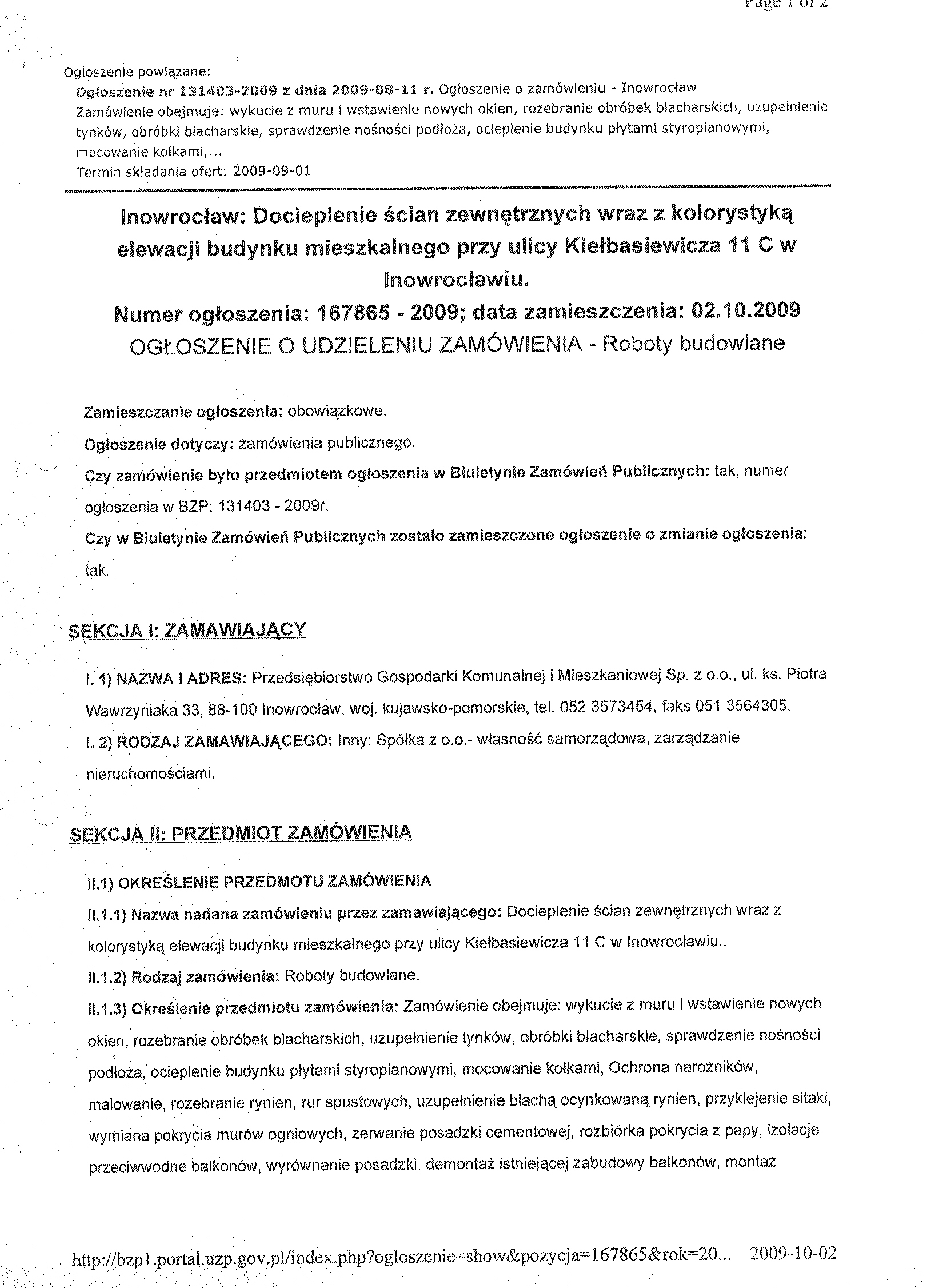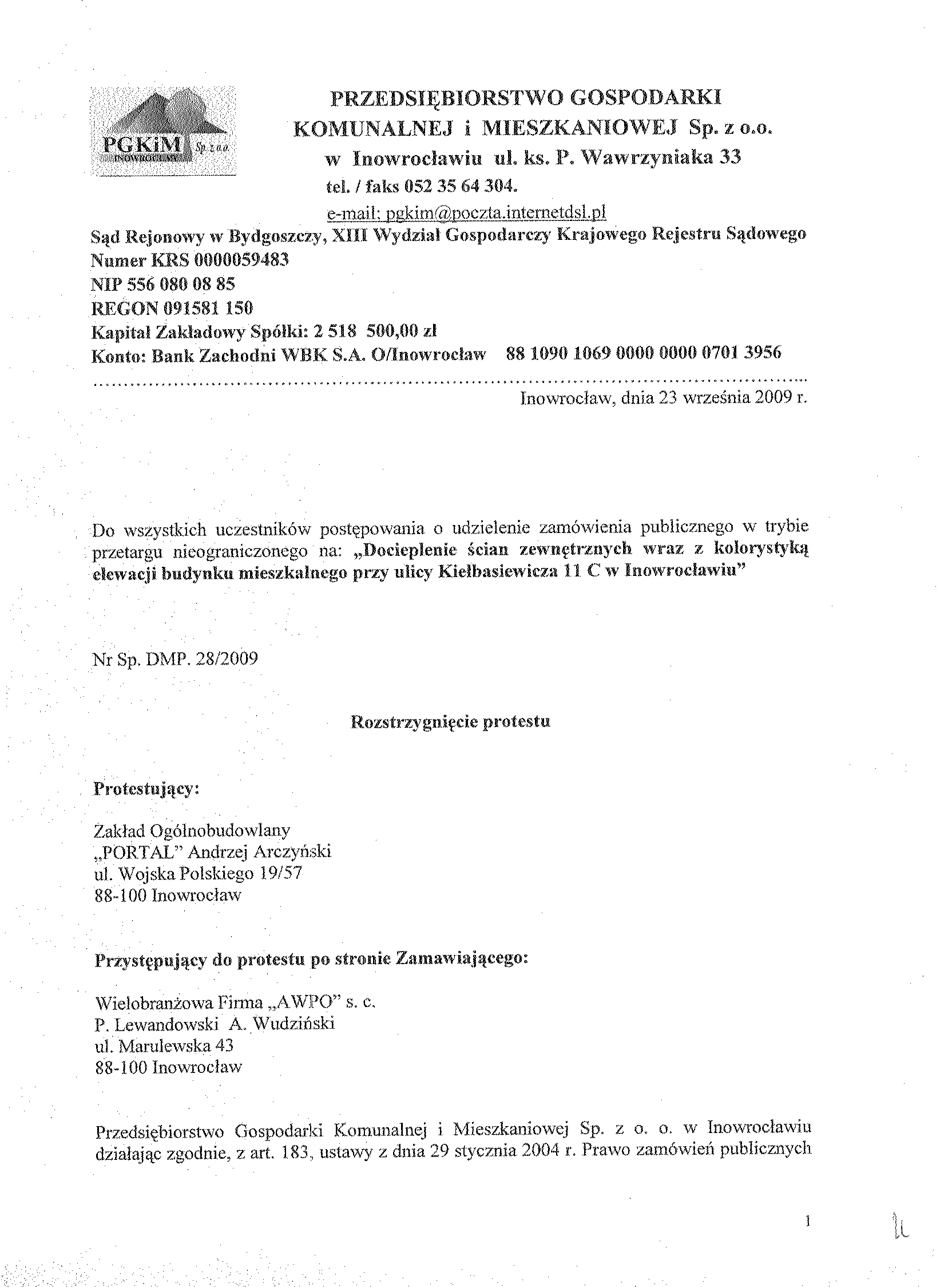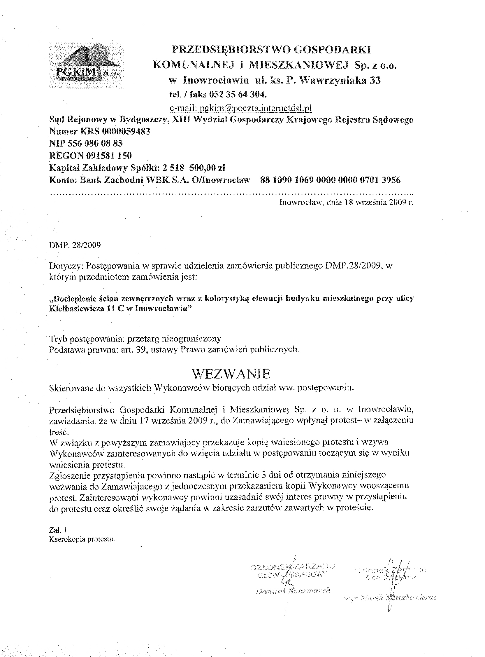OG艁OSZENIE聽 O聽 WSZCZ臉CIU聽 POST臉POWANIA 聽 1. Zamawiaj膮cy: Wsp贸lnota Mieszkaniowa przy ulicy Kie艂basiewicza 11 C w Inowroc艂awiu w imieniu i na rzecz, kt贸rej dzia艂a na mocy umowy o zarz膮dzanie nieruchomo艣ci膮 wsp贸ln膮, Przedsi臋biorstwo Gospodarki Komunalnej i Mieszkaniowej Sp. z o.o. w Inowroc艂awiu 聽 Ulica: ks. Piotra Wawrzyniaka 33 Kod: 88-100, Miejscowo艣膰: Inowroc艂aw Telefon / faks 052 35 64聽304 e-mail: pgkim@poczta.internetdsl.pl聽 www.pgkimino.pl 聽