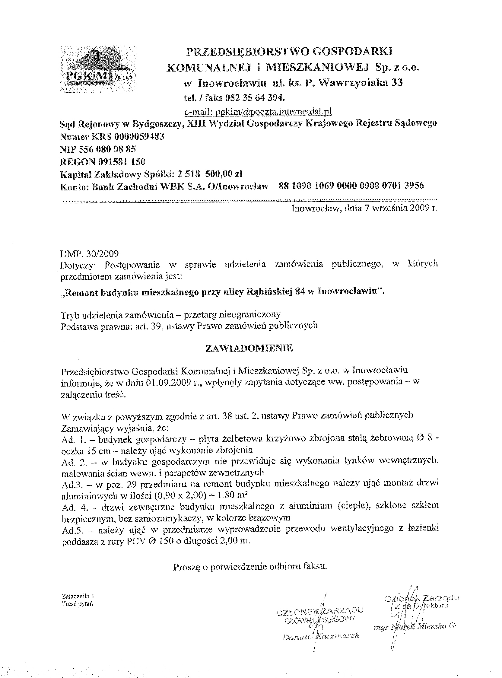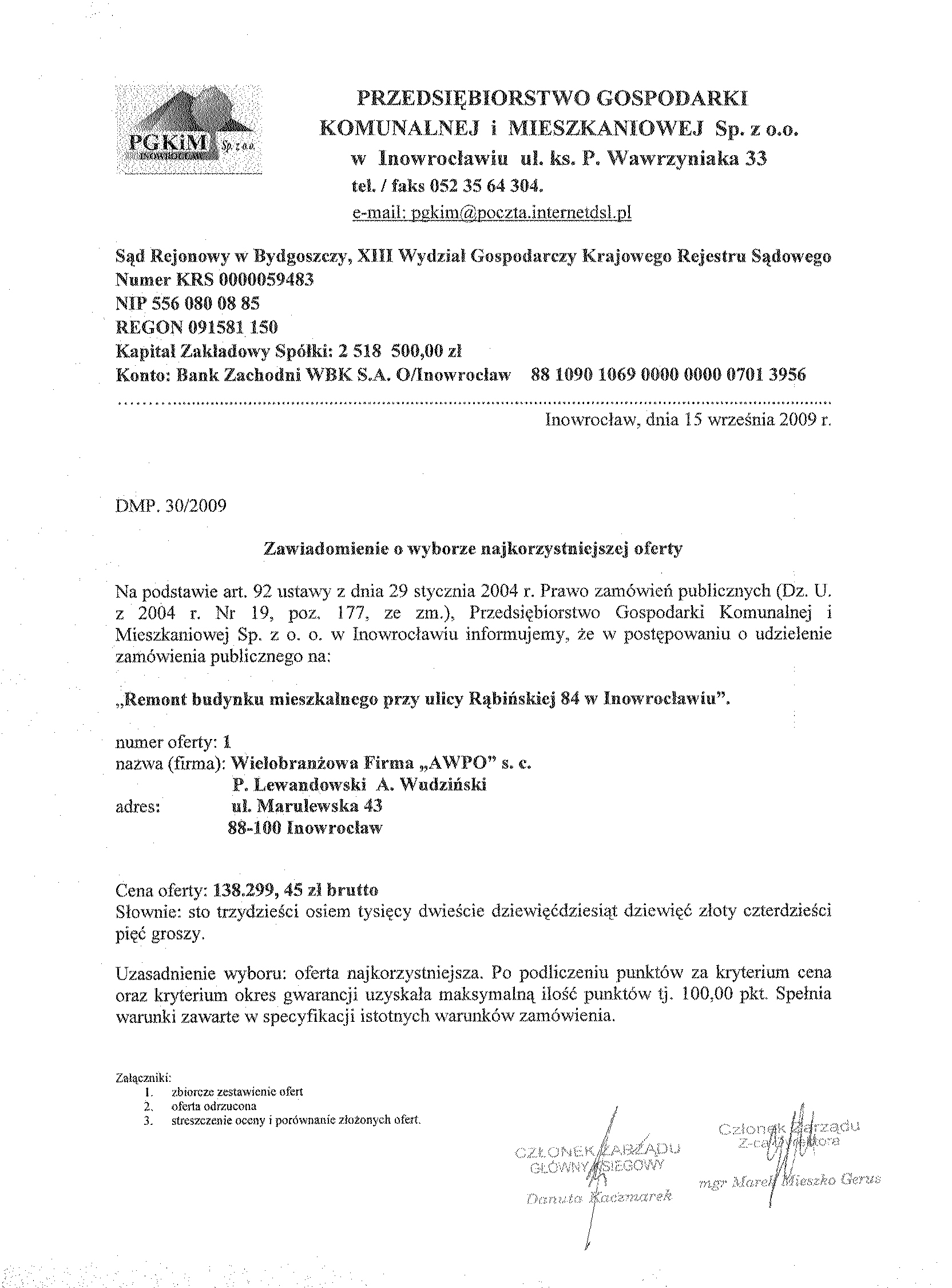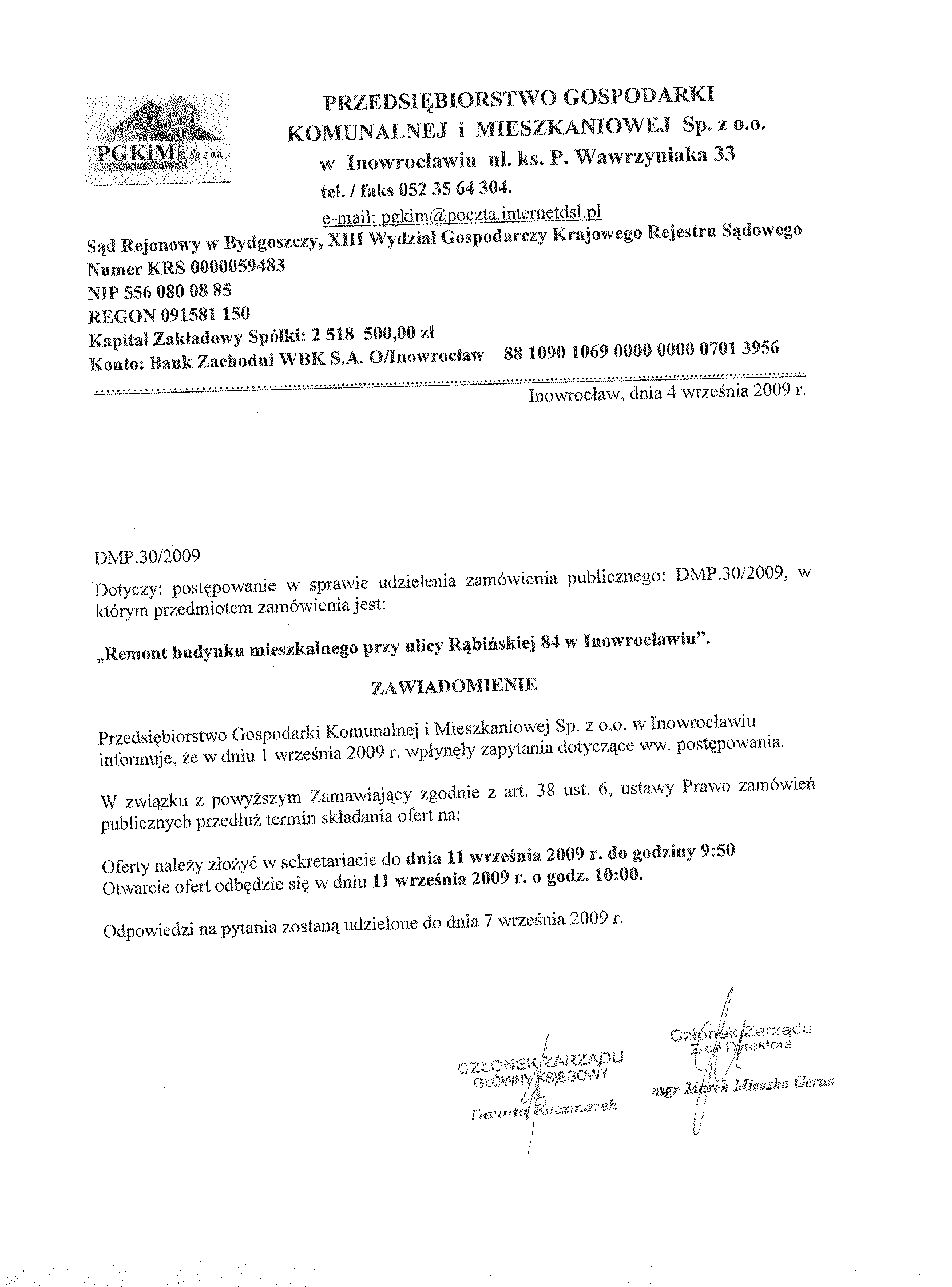 13. Miejsce i termin sk艂adania ofert: Przedsi臋biorstwo Gospodarki Komunalnej i Mieszkaniowej Sp. z o.o., ul. ks. Piotra Wawrzyniaka 33, 88-100 Inowroc艂aw, sekretariat 1 pi臋tro do dnia 7 wrze艣nia 2009 r. do godziny 9:50. 聽 14. Kryteria wyboru ofert: 聽聽聽 聽a)聽 cena wykonania zam贸wienia聽 - 80 聽聽聽聽 b) gwarancja - 20 聽