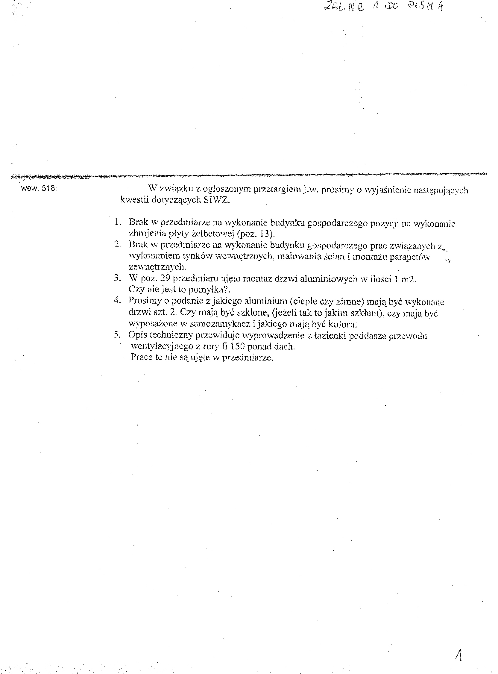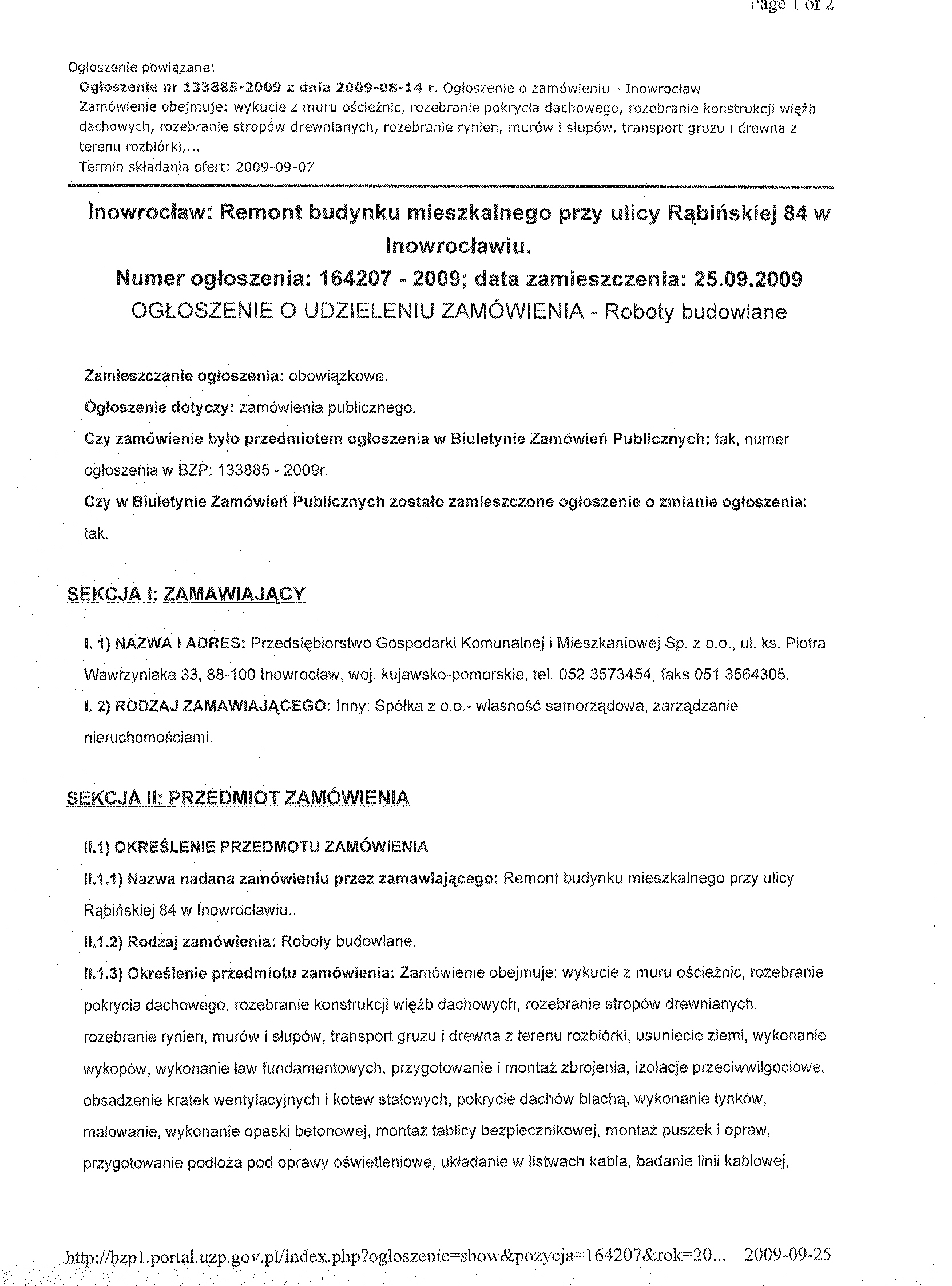 Nazwa nadana zam贸wieniu: "Remont budynku mieszkalnego przy ulicy R膮bi艅skiej 84 w Inowroc艂awiu". 聽 Zam贸wienie obejmuje: wykucie z muru o艣cie偶nic, rozebranie pokrycia dachowego, rozebranie konstrukcji wi臋藕b dachowych, rozebranie strop贸w drewnianych, rozebranie rynien, mur贸w i s艂up贸w, transport gruzu i drewna z terenu rozbi贸rki, usuniecie ziemi, wykonanie wykop贸w, wykonanie 艂aw fundamentowych, przygotowanie i monta偶 zbrojenia, izolacje przeciwwilgociowe, obsadzenie kratek wentylacyjnych i kotew stalowych, pokrycie dach贸w blach膮, wykonanie tynk贸w, malowanie, wykonanie opaski betonowej, monta偶 tablicy bezpiecznikowej, monta偶 puszek i opraw, przygotowanie pod艂o偶a pod oprawy o艣wietleniowe, uk艂adanie w listwach kabla, badanie linii kablowej, wymian 艂acenia dachu, izolacje cieplne i przeciwd藕wi臋kowe, deskowanie po艂aci dachowych, wymiana przewod贸w instalacji uziemiaj膮cej i odgromowej, monta偶 drzwi i okien, przygotowanie pod艂o偶a pod Docieplenie, ocieplenie budynku p艂ytami styropianowymi, przyklejenie siatki, rozebranie mur贸w i stopni ceglanych, wykonanie schod贸w. 聽 5. Nie dopuszcza si臋 sk艂adania ofert cz臋艣ciowych. 6. Nie dopuszcza si臋 sk艂adania ofert wariantowych. 7. Zamawiaj膮cy nie przewiduje zawarcia umowy ramowej, jak r贸wnie偶 nie dokona wyboru oferty najkorzystniejszej z zastosowaniem aukcji elektronicznej. 8. Zamawiaj膮cy nie przewiduje mo偶liwo艣ci ustanowienia dynamicznego systemu zakup贸w. 聽 9. Osobami uprawnionymi do kontakt贸w z wykonawcami s膮: a) w cz臋艣ci formalnej zam贸wienia - Krystyna Glonek, tel.052 35 - 64 - 304, b) w cz臋艣ci merytorycznej zam贸wienia - Anna Nawrocka, tel. 052 35 64聽325. 聽 10. Po偶膮dany termin realizacji zam贸wienia: 3 miesi膮ce od podpisania umowy. 聽