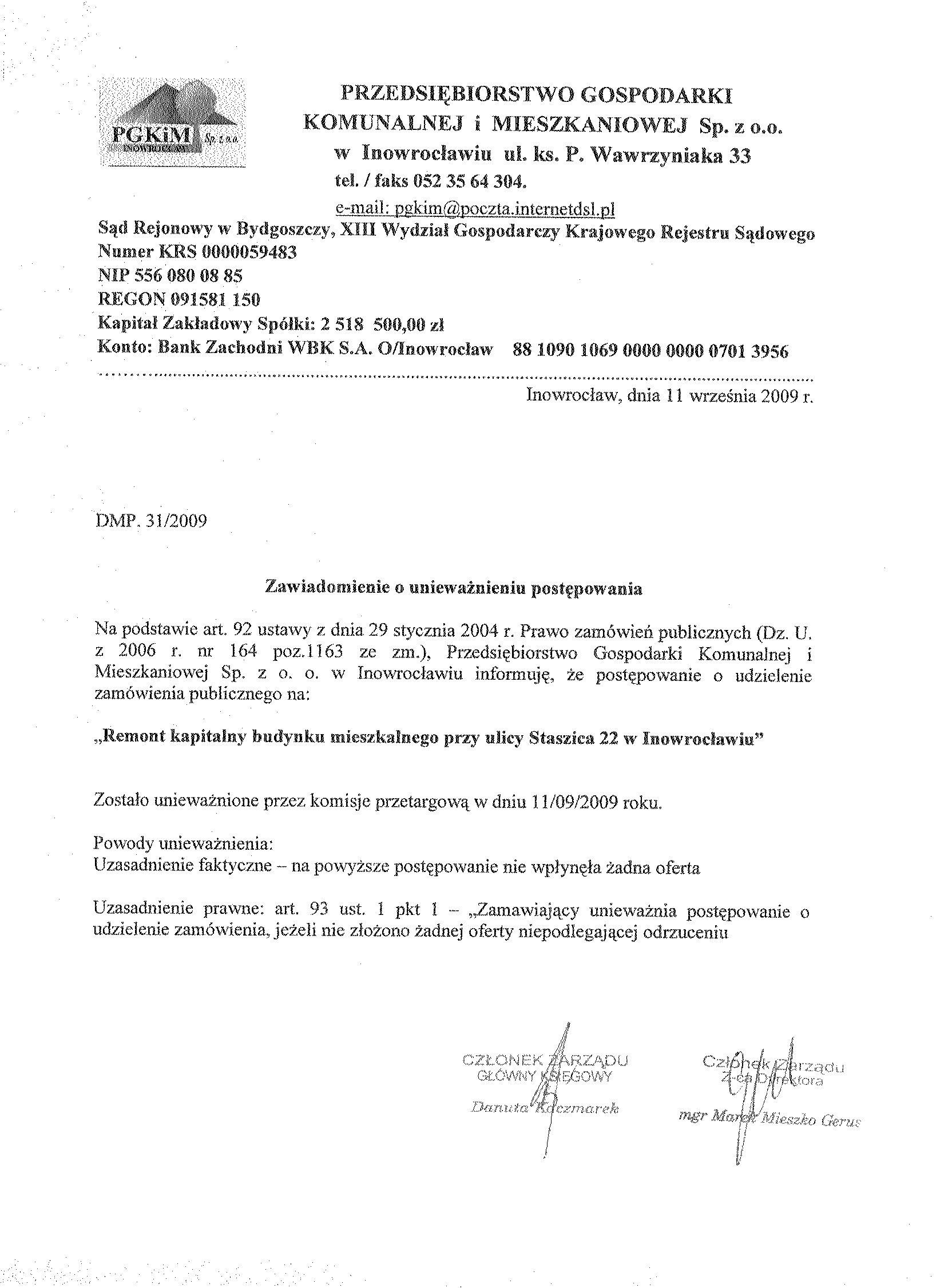 Numer sprawy: DMP. 31/2009聽聽聽聽聽聽聽聽聽聽聽聽聽聽聽聽聽聽聽聽聽聽聽聽聽聽聽聽聽聽聽聽聽Inowroc艂aw, dnia 20 sierpnia 2009 r.聽聽 聽