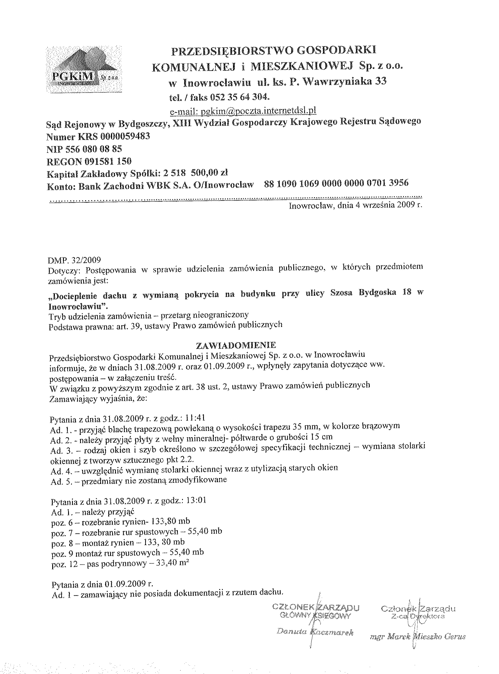 13. Miejsce i termin sk艂adania ofert: Przedsi臋biorstwo Gospodarki Komunalnej i Mieszkaniowej Sp. z o.o., ul. ks. Piotra Wawrzyniaka 33, 88-100 Inowroc艂aw, do dnia 14 wrze艣nia 2009 r. do godziny 9:50, sekretariat 1 pi臋tro. 聽 14. Kryteria wyboru ofert: 聽聽聽 聽a)聽 cena wykonania zam贸wienia聽 80 聽聽聽聽 b) gwarancja聽 20 聽