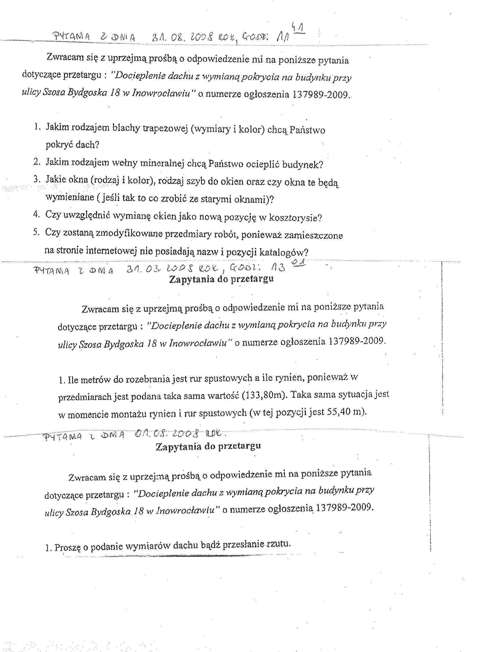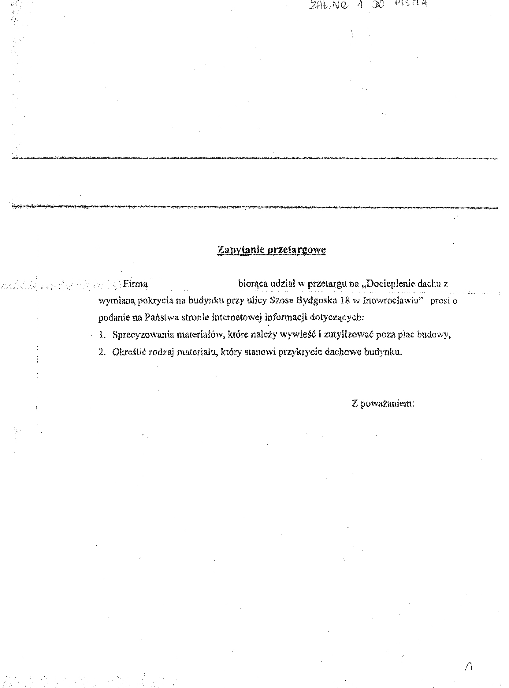 Nazwa nadana zam贸wieniu: "Docieplenie dachu z wymian膮 pokrycia na budynku przy ulicy Szosa Bydgoska 18 w Inowroc艂awiu". 聽