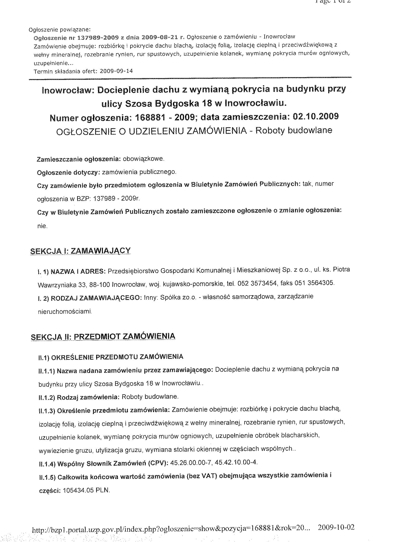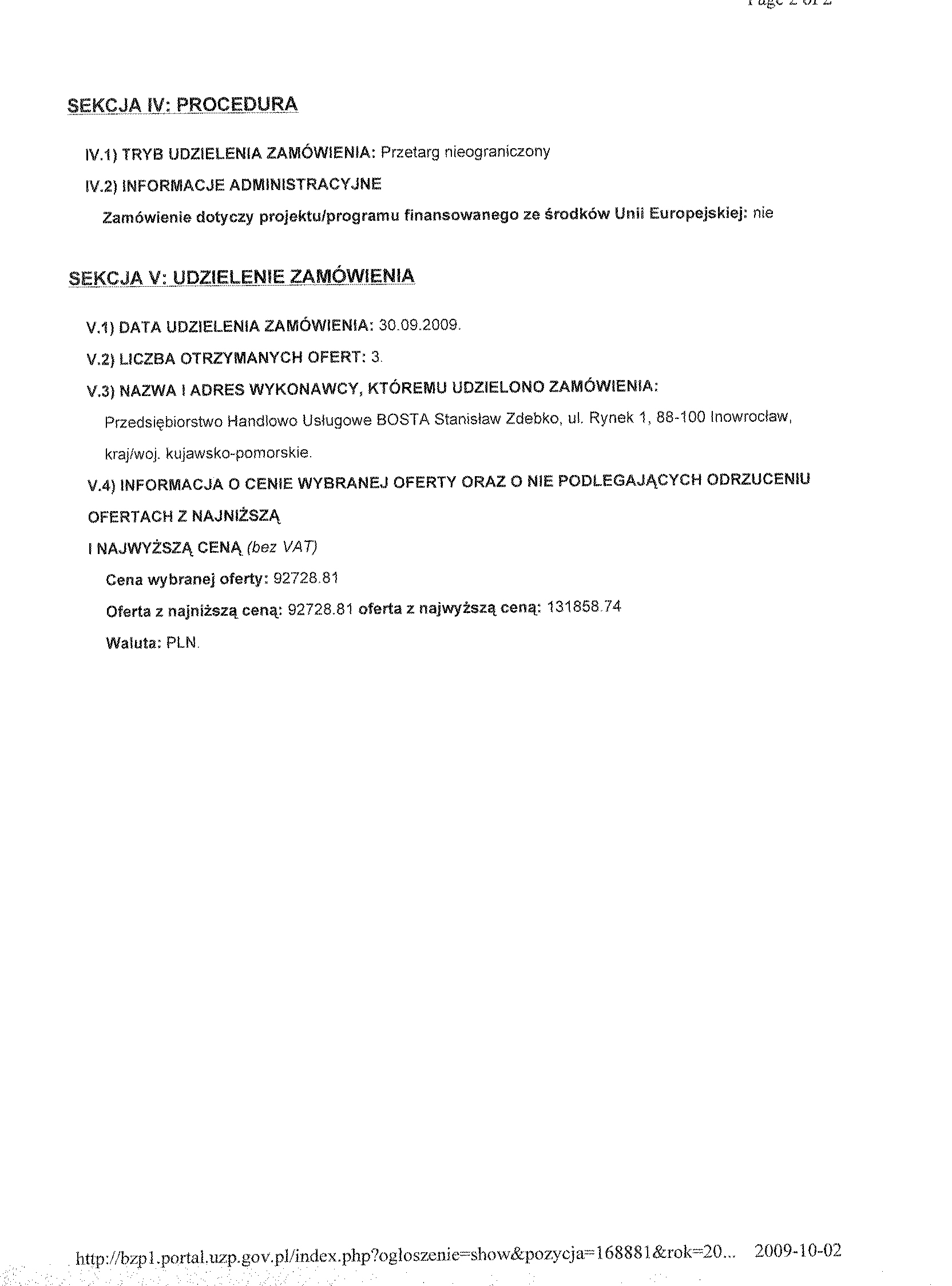 Numer og艂oszenia w BZP: 137989 - 2009; data zamieszczenia 21/08/2009 r. 聽