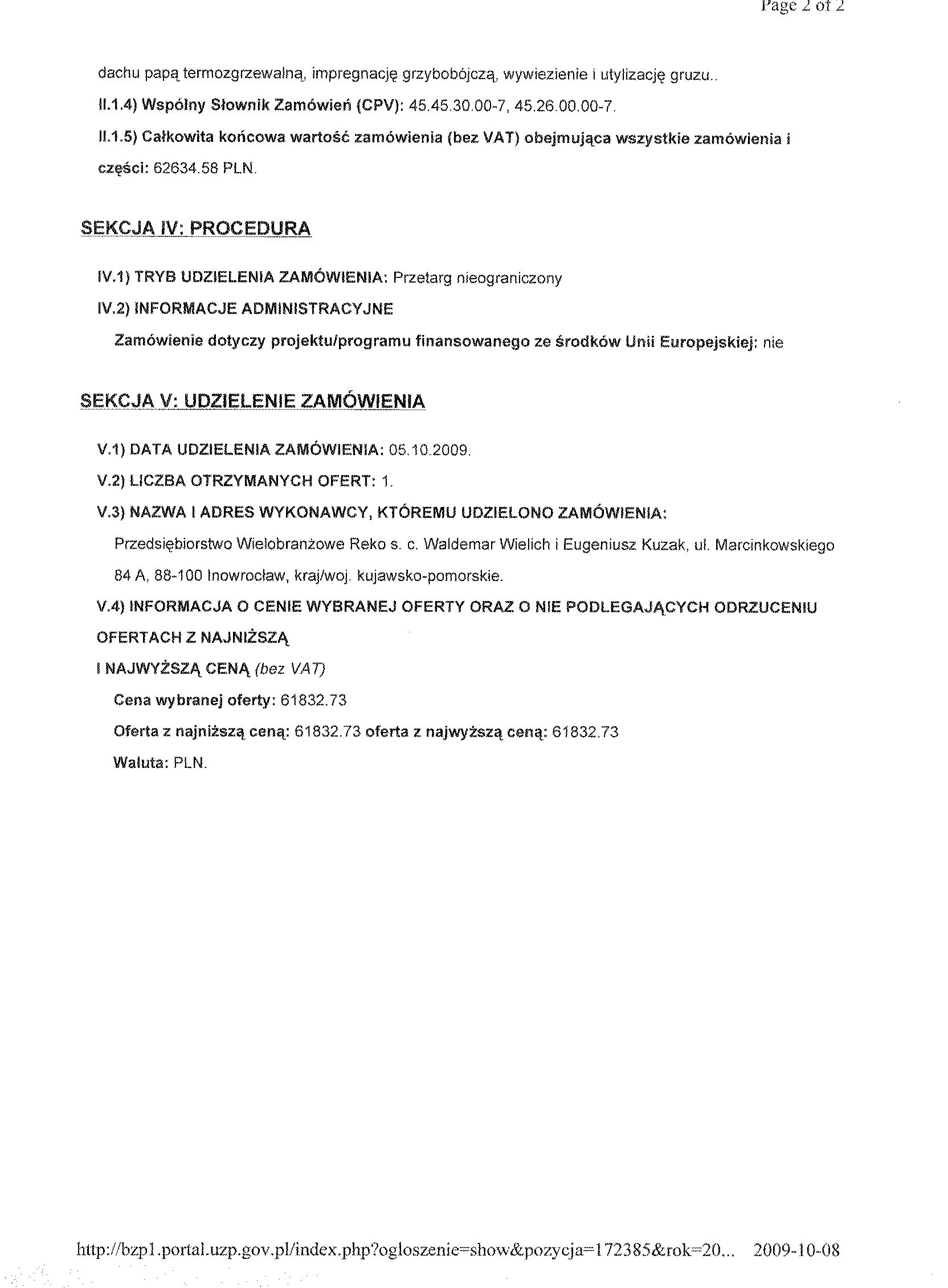 Numer og艂oszenia w BZP: 150475 - 2009; data zamieszczenia 08/09//2009 r. 聽