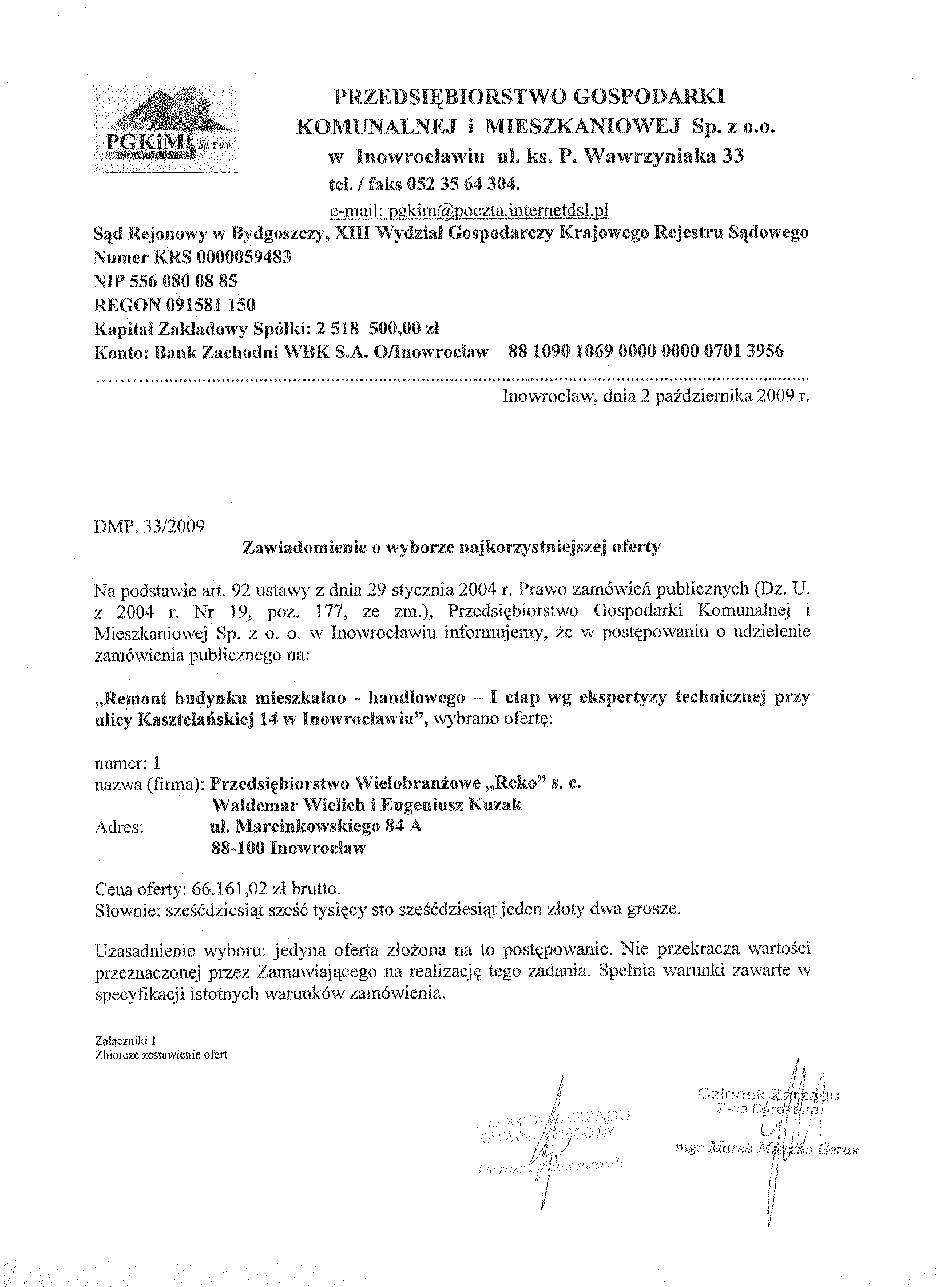13. Miejsce i termin sk艂adania ofert: Przedsi臋biorstwo Gospodarki Komunalnej i Mieszkaniowej Sp. z o.o., ul. ks. Piotra Wawrzyniaka 33, 88-100 Inowroc艂aw, do dnia 30 wrze艣nia 2009 r. do godziny 9:50, sekretariat 1 pi臋tro. 聽 14. Kryteria wyboru ofert: 聽聽聽 聽a)聽 cena wykonania zam贸wienia聽 - 80 聽聽聽聽 b) gwarancja - 20 聽