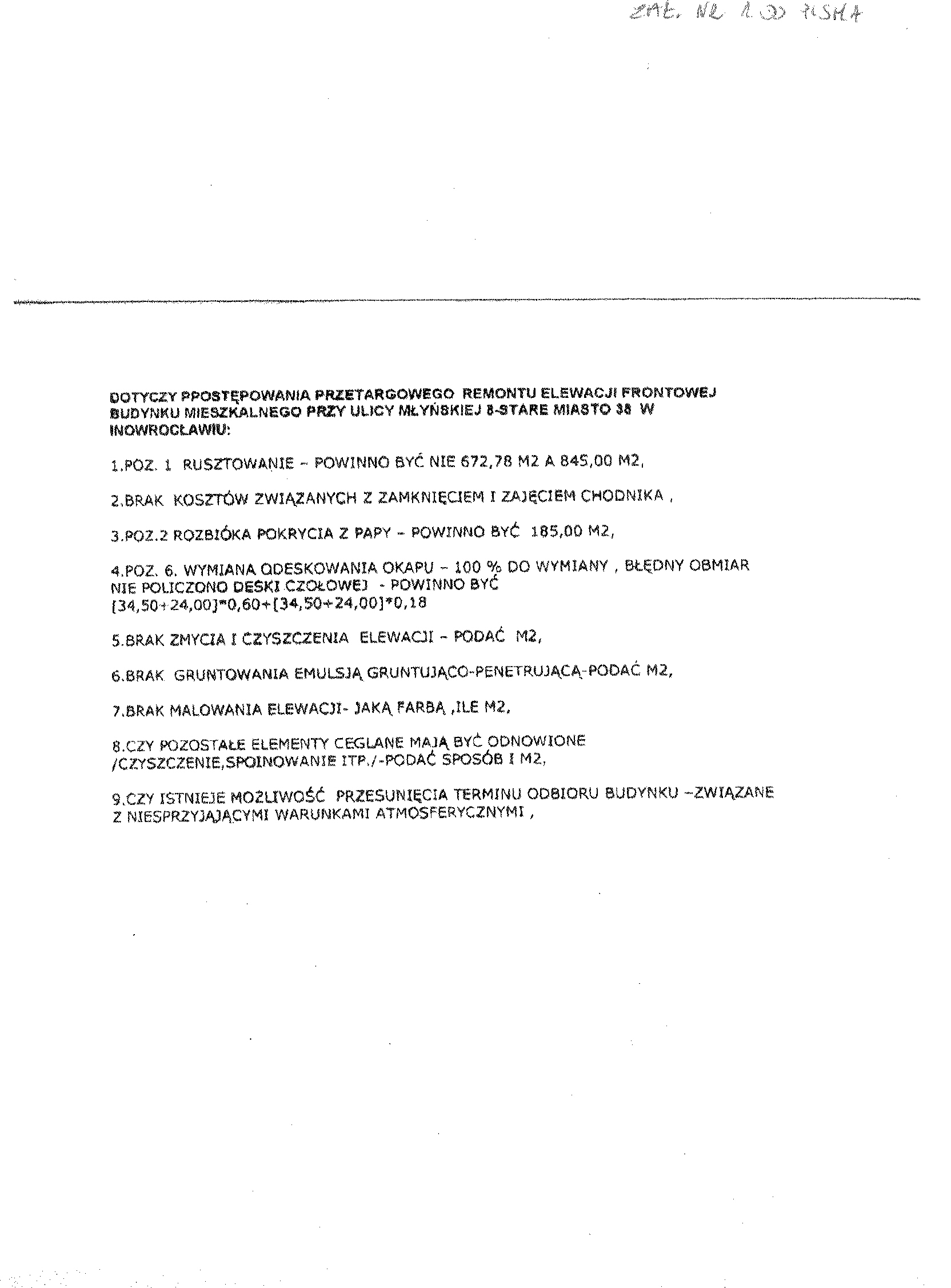 Nazwa nadana zam贸wieniu: "Remont elewacji frontowej budynku mieszkalnego przy ulicy M艂y艅skiej 8 - Stare Miasto 38 w Inowroc艂awiu". 聽 Zam贸wienie obejmuje: rozbi贸rk臋 pokrycia z papy, wymian臋 deskowania, pokrycie dach贸w pap膮 termozgrzewaln膮, wykucie z muru i wstawienie nowych okien, za艂o偶enie belek stalowych, naprawienie cegie艂, spoinowanie mur贸w, odbicie tynk贸w, uzupe艂nienie 艣cian, obsadzenie o艣cie偶nic, czyszczenie konsol i opasek okiennych, wykonanie tynk贸w, uzupe艂nienie detali architektonicznych, opasek okiennych i gzyms贸w, rozebranie obr贸bek blacharskich, rozebranie nawierzchni, wyr贸wnanie terenu, wymurowanie 艣cian studni 艣wietlikowych, wykonanie opaski betonowej. 聽 5. Nie dopuszcza si臋 sk艂adania ofert cz臋艣ciowych. 6. Nie dopuszcza si臋 sk艂adania ofert wariantowych. 7. Zamawiaj膮cy nie przewiduje zawarcia umowy ramowej, jak r贸wnie偶 nie dokona wyboru oferty najkorzystniejszej z zastosowaniem aukcji elektronicznej. 8. Zamawiaj膮cy nie przewiduje mo偶liwo艣ci ustanowienia dynamicznego systemu zakup贸w. 聽 9. Osobami uprawnionymi do kontakt贸w z wykonawcami s膮: a) w cz臋艣ci formalnej zam贸wienia - Krystyna Glonek, tel.052 35聽64 304, b) w cz臋艣ci merytorycznej zam贸wienia - Anna Nawrocka, tel. 052 35 64聽325. 聽 10. Po偶膮dany termin realizacji zam贸wienia: do 15 grudnia 2009 r. 聽
