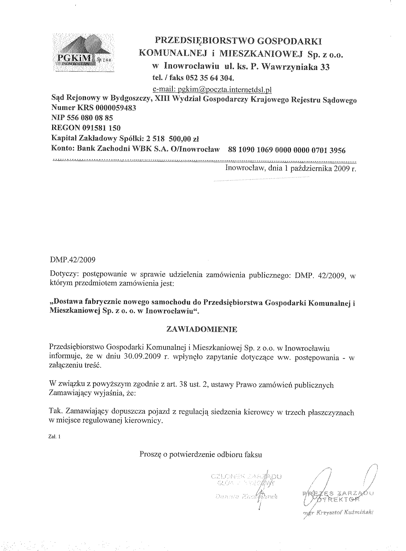 Numer sprawy: DMP. 42/2009聽聽聽Inowroc艂aw, dnia 28 wrze艣nia 2009 r.聽聽 聽