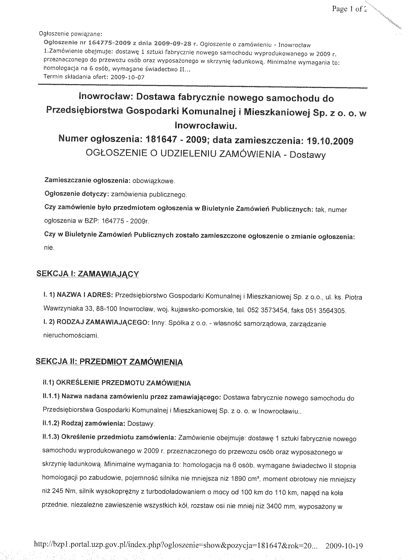Tytu艂 post臋powania: "Dostawa fabrycznie nowego samochodu do Przedsi臋biorstwa Gospodarki Komunalnej i Mieszkaniowej Sp. z o. o. w Inowroc艂awiu |